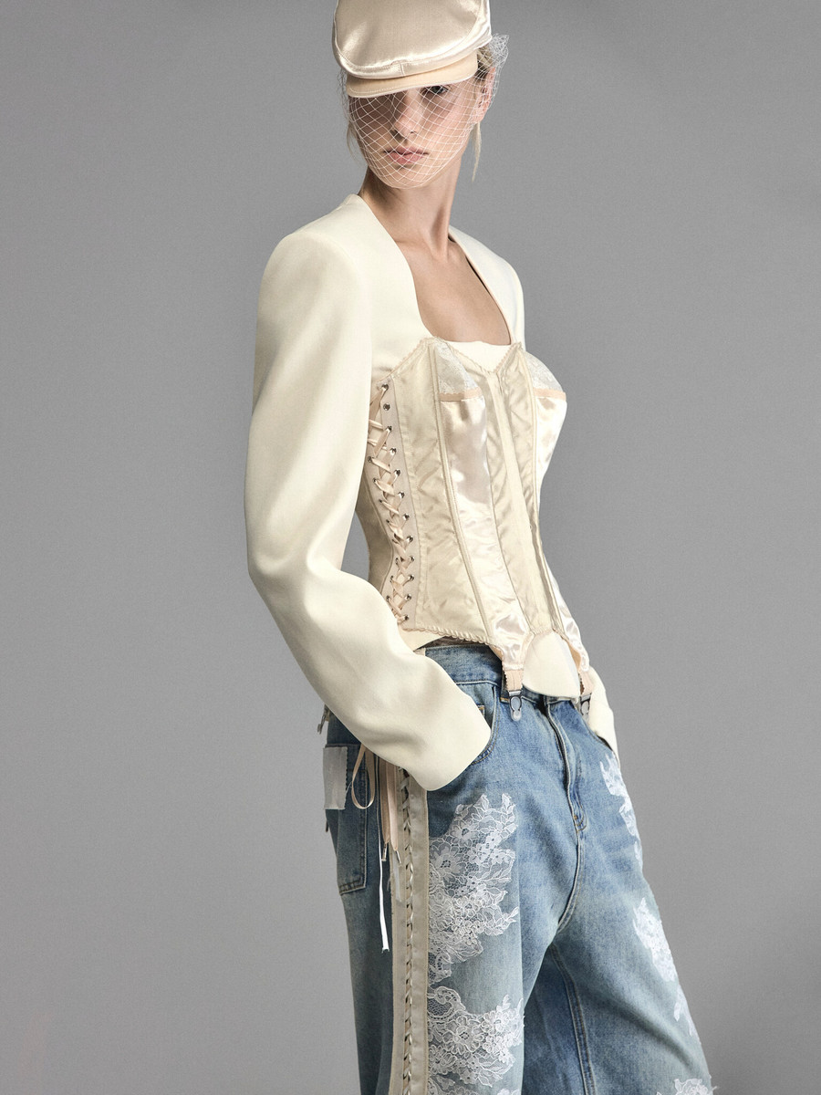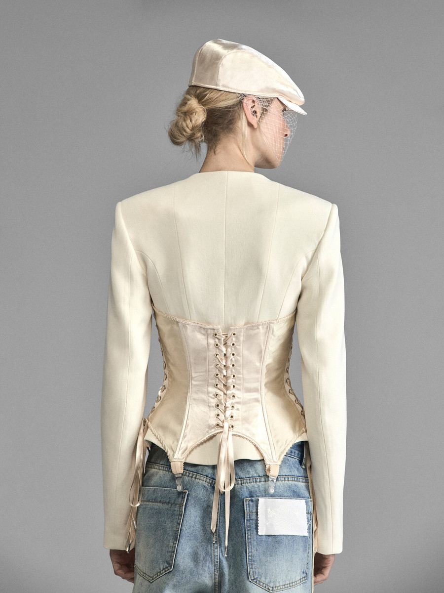 Жакет из вискозы и хлопка с корсетом в винтажном стиле. Сливочную матовость основы оттеняет сатиновый корсет с золотистым блеском. Акцентные чашечки позволяют ощутить хрупкость конструкции, особо трогательную на фоне острой линии плеча структурного жакета. Низ оформляют подтяжки, стекающие с сатиновых рельефов словно капли жидкого шелка. Плавные линии декольте открывают жадному взору остроту ключиц и мягкость тела. Корсетные шнуровки с широкими лентами формируют фантастический изгиб талии, вызывающий желание провести по нему рукой. Жакет-провокация позволит вам использовать власть собственного тела, оставаясь полностью одетой.