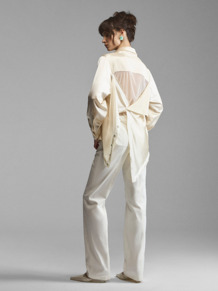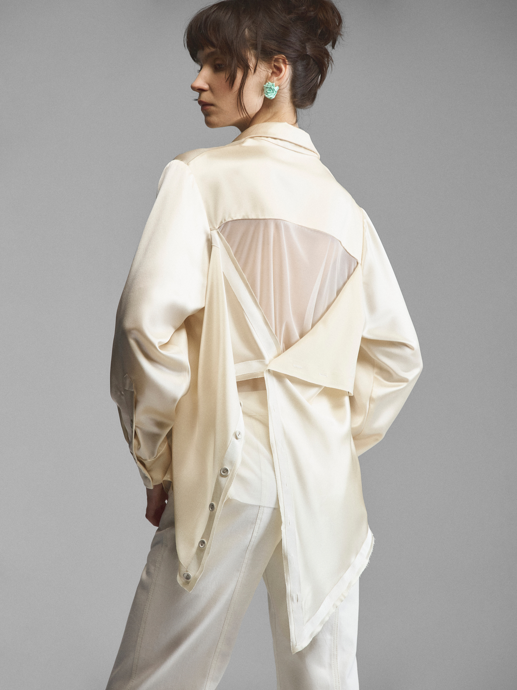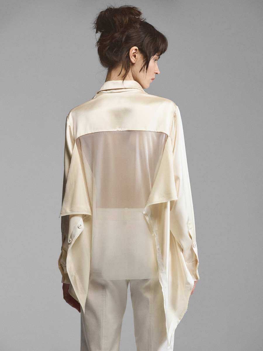 Шелковая рубашка асимметричного кроя с прозрачной спиной. Классический крой с воротником и планкой на пуговицах дополняют две свободные полочки на спинке. Они ложатся вторым слоем на прозрачную основу, создавая драматичную драпировку. Менять рисунок складок можно с помощью застежки, вы также можете оставить полочки свободно свисающими. Рукава с высокими разрезами на манжетах можно носить во всю длину или подворачивать, придавая силуэту еще больше легкости и свободы.