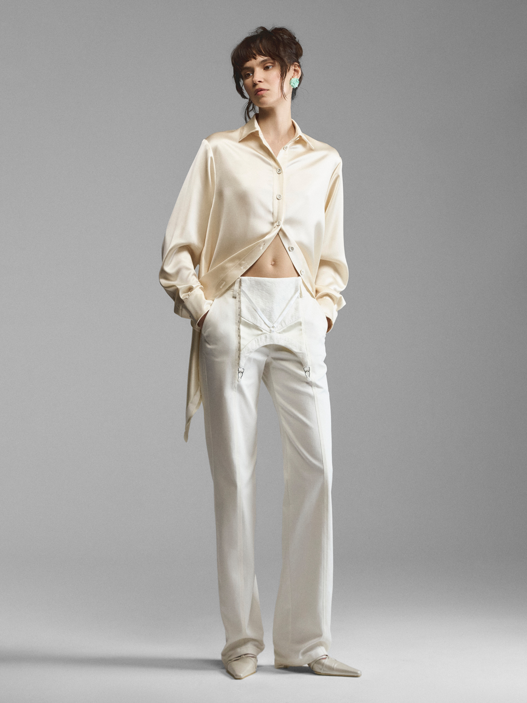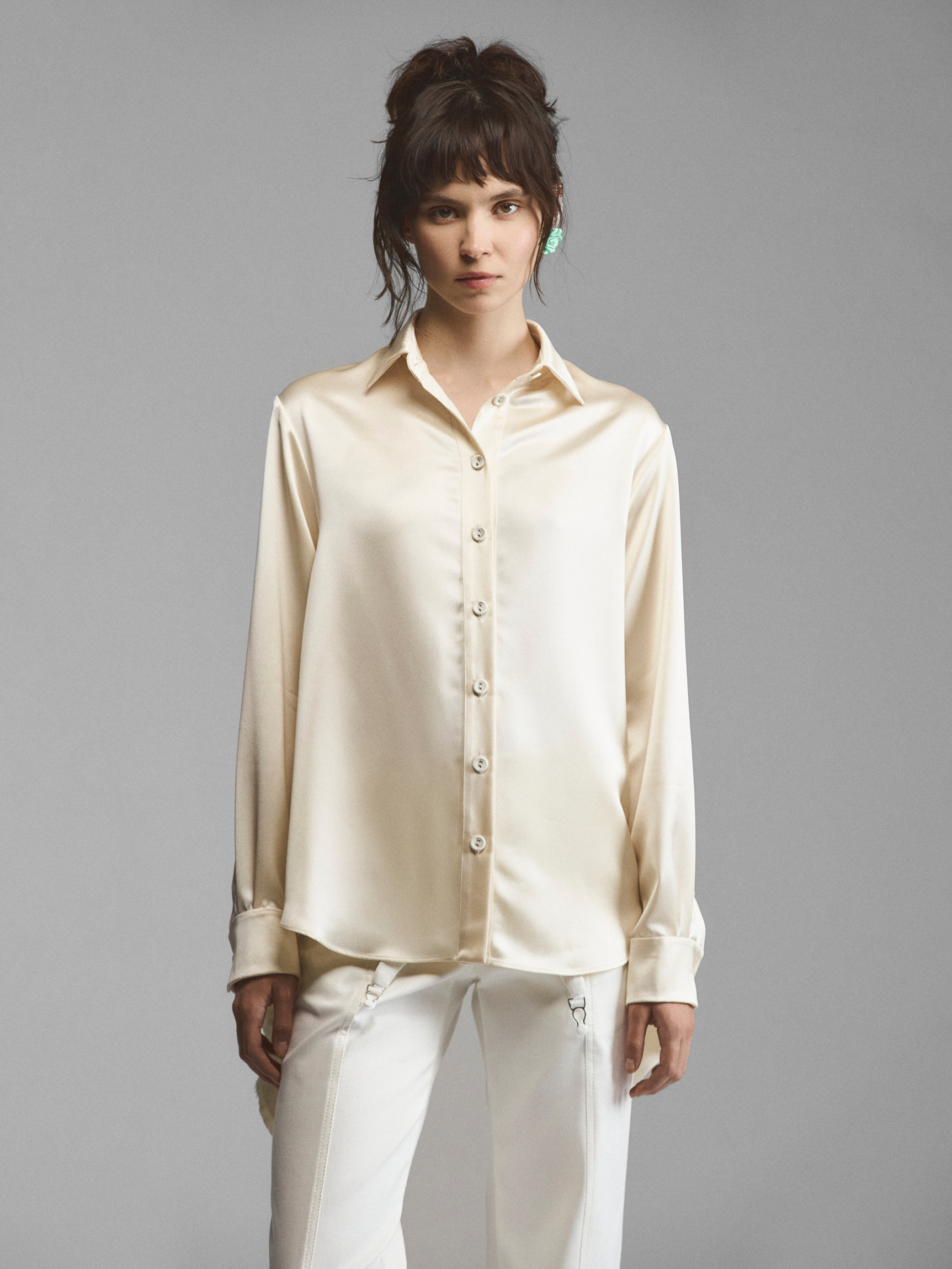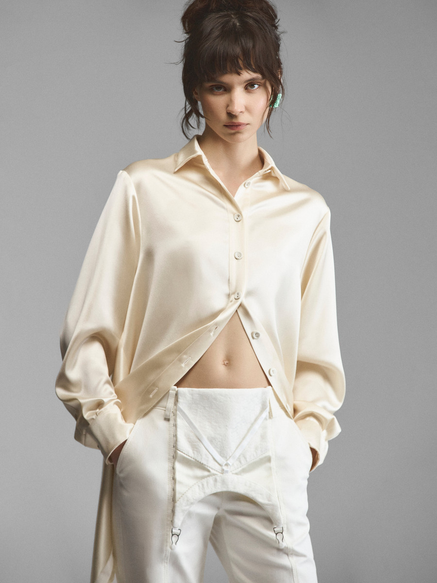 Шелковая рубашка асимметричного кроя с прозрачной спиной. Классический крой с воротником и планкой на пуговицах дополняют две свободные полочки на спинке. Они ложатся вторым слоем на прозрачную основу, создавая драматичную драпировку. Менять рисунок складок можно с помощью застежки, вы также можете оставить полочки свободно свисающими. Рукава с высокими разрезами на манжетах можно носить во всю длину или подворачивать, придавая силуэту еще больше легкости и свободы.
