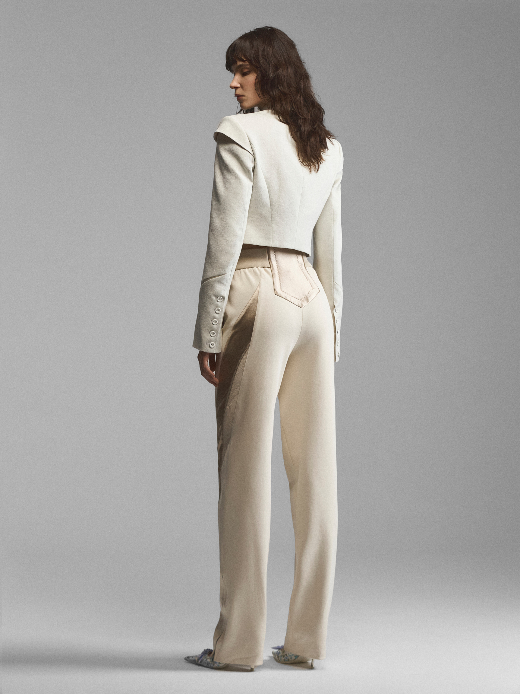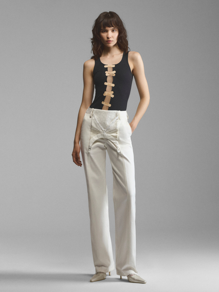 Брюки с декоративными элементами в стиле black tie. Блестящие сатиновые вставки подчеркивают сложный крой модели, вертикальные линии визуально вытягивают силуэт. Длина достаточна для сочетания с обувью на высоком каблуке. Молнии внизу позволяют расклешать брюки, открывая щиколотки. Умеренно высокая посадка подчеркнута шелковым поясом, визуально напоминающим камербанд. Крупный декоративный элемент дополнительно акцентирует внимание на талии. Модель доступна в бежевом и черном вариантах.