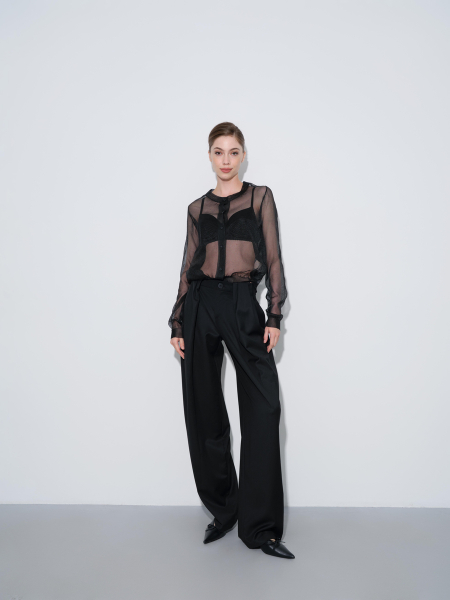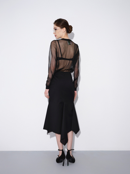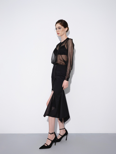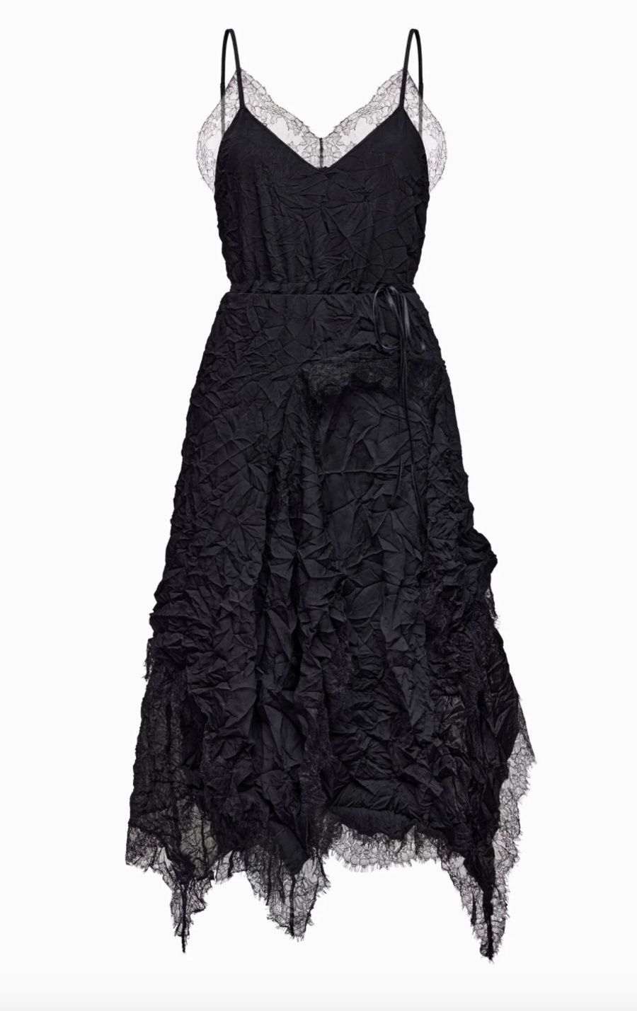 Ассиметричное платье-комбинация в черных оттенках. Дизайнер использовал несколько фактур и тканей, разные виды кружева. Это платье - произведение искусства. Носите самостоятельно или стилизуйте с футболками, лонгами, жакетами. Рекомендуем сочетать с грубыми ботинками. Добавьте живописности вашему образу!