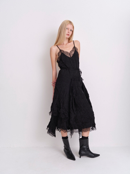 Ассиметричная юбка «крэш» с шелковыми элементами. Дизайнер использовал несколько фактур и тканей, а также разные виды кружева. Стилизуйте юбку с более базовыми элементами гардероба, будь то косуха, мужская сорочка, футболка, лонг или худи, майка, а также любой жакет. Рекомендуем сочетать юбку с грубыми ботинками или кедами.
