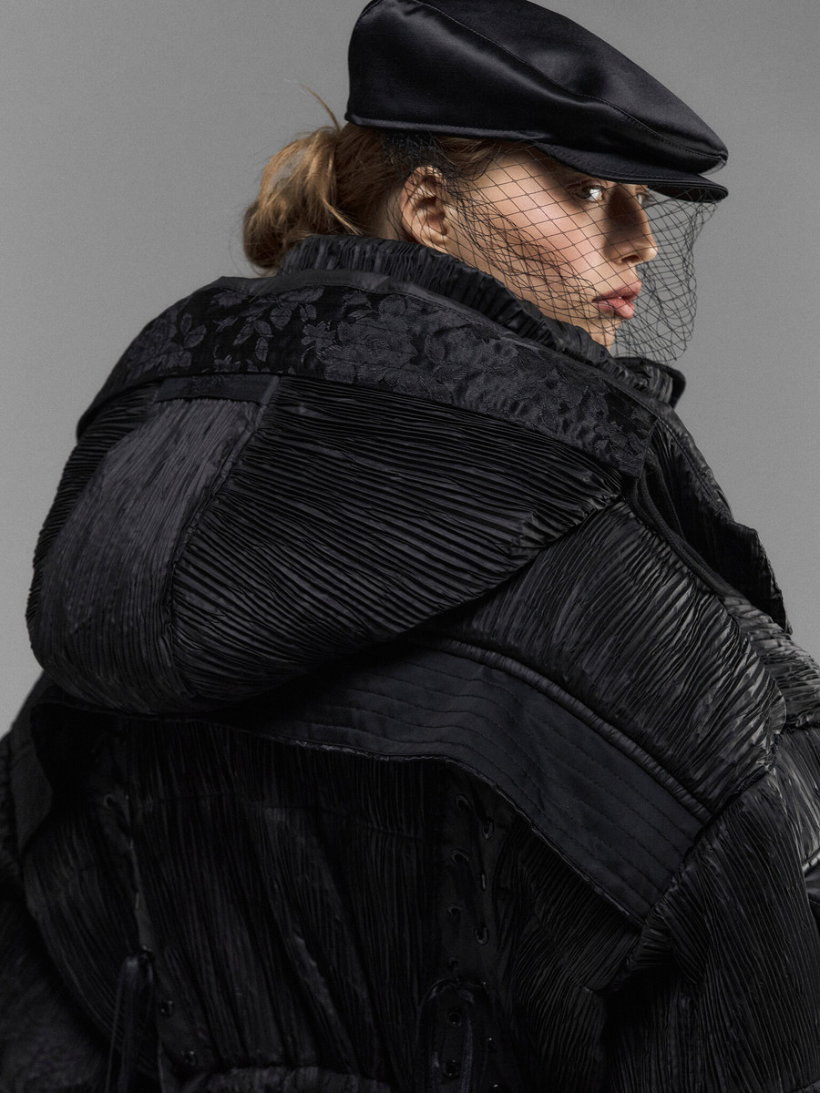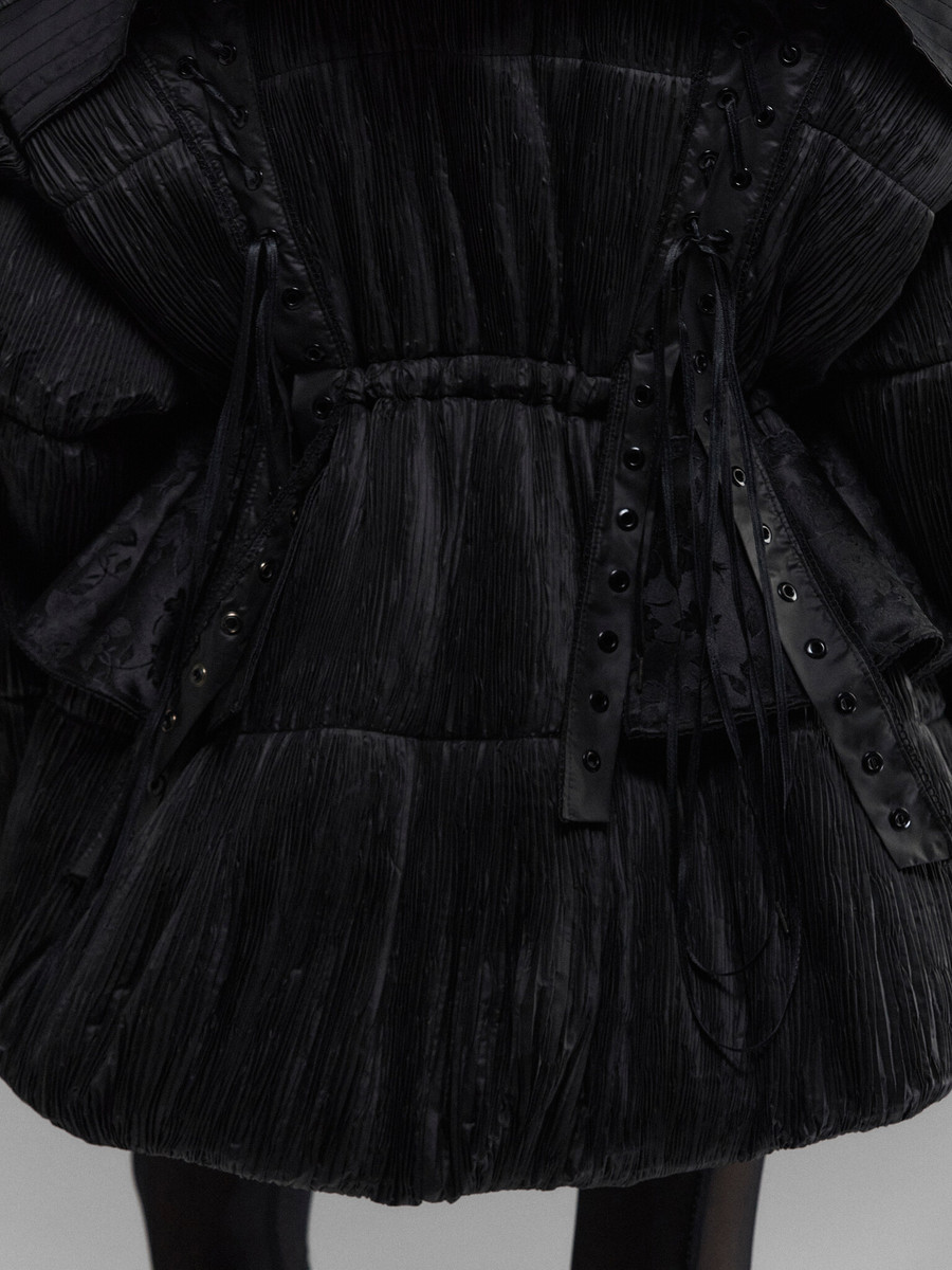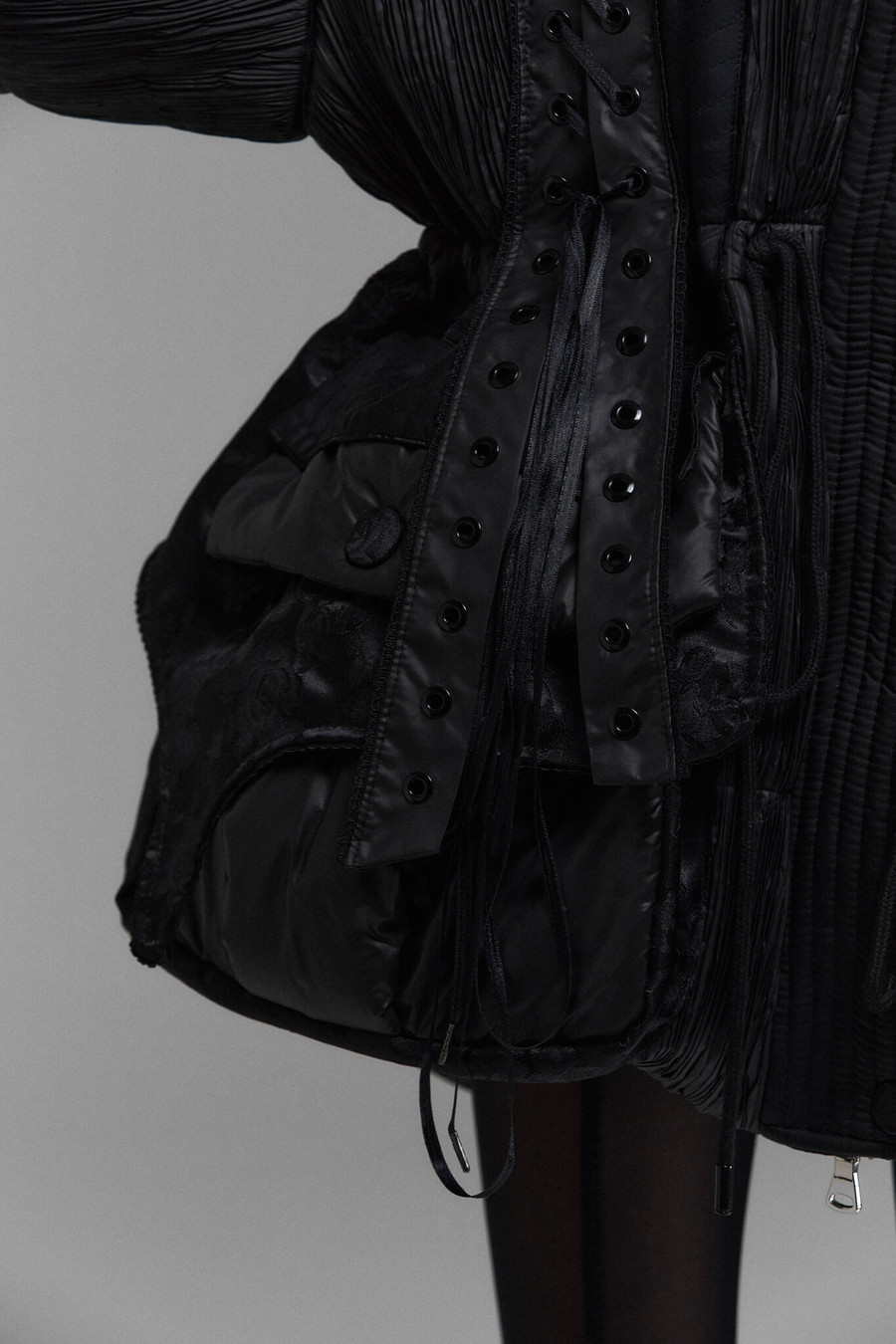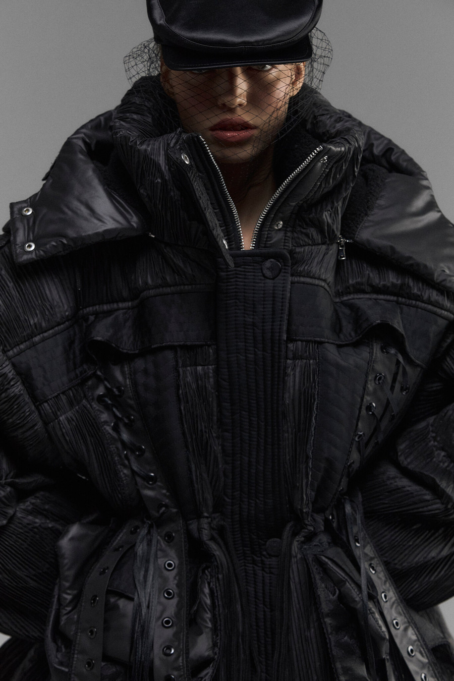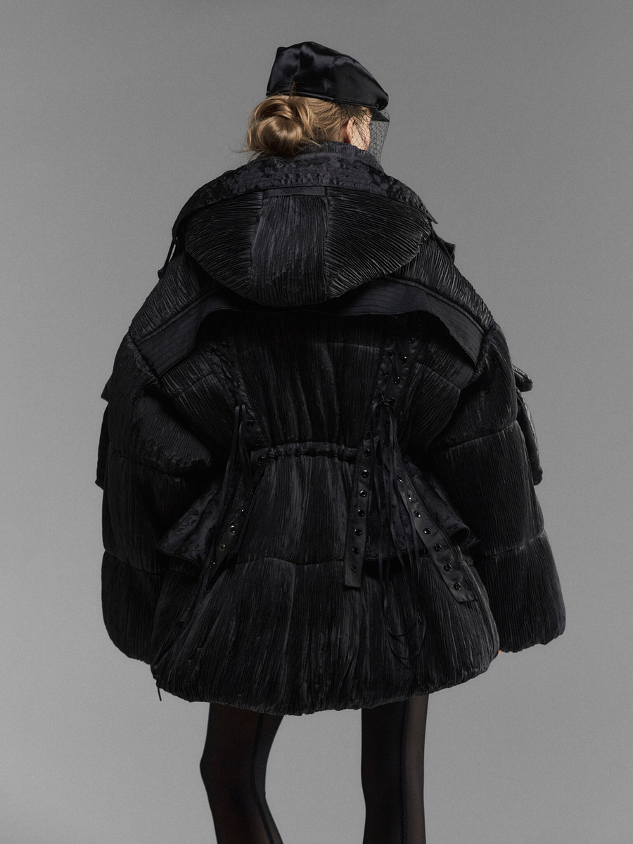 Гиперобъемная парка-кокон с карманами на рукавах и капюшоном. Сочетание матового и текстиля с глянцевым блеском создает динамику и эффект многослойности. В неприятную погоду вы приятно удивитесь waterproof покрытию парки. Эффектная и бескомпромиссно теплая, она станет вашей зоной комфорта на зиму. Эпично смотрится с облегающими и тонкими вещами, оставляя за вами право ощущать себя хрупким цветком даже заснеженной зимой.