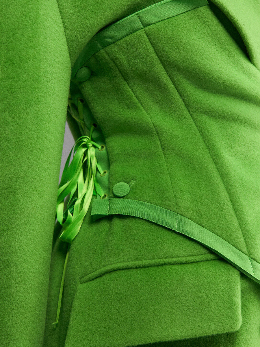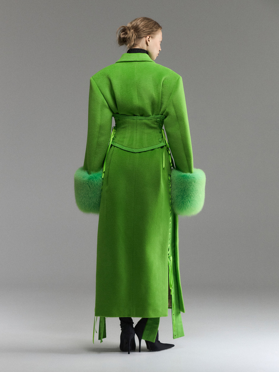 Удлиненное пальто из шерсти с шелком выглядят эффектно не только за счет цвета. Талию формирует асимметричный корсет из материала пальто, стянутый по бокам шелковыми лентами. Увеличенная линия плеча создает драматичный контраст между талией и верхом. Роскошные меховые манжеты заменяют муфту, выглядят они не менее эффектно.