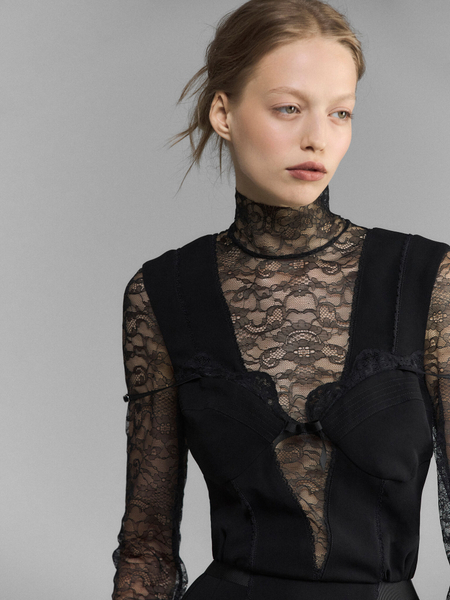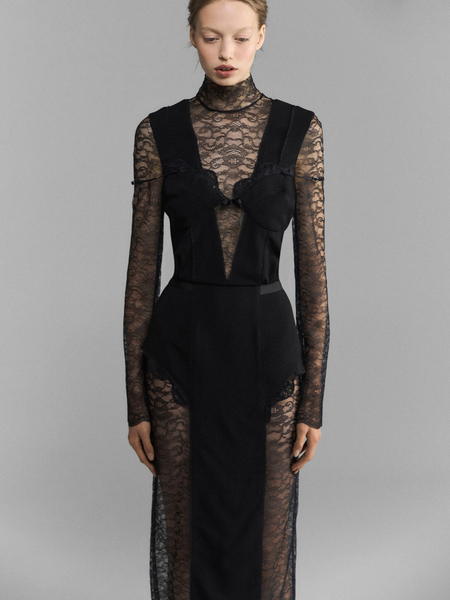 Асимметричное платье с разрезами, стянутыми сатиновыми лентами. Тотально закрытый лиф с длинным рукавом и откровенными разрезами, которые позволяют увидеть обнаженное под шелком тело. Тонкие ленты стягивают разрезы, спутываясь на краях ворохом длинных бантов. Платье производит впечатление шелковистой паутины, в котором вы не жертва, а создательница ловушки.