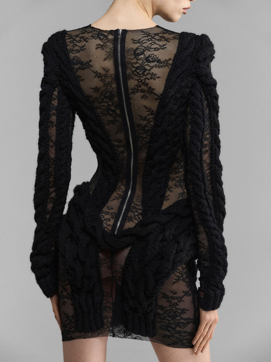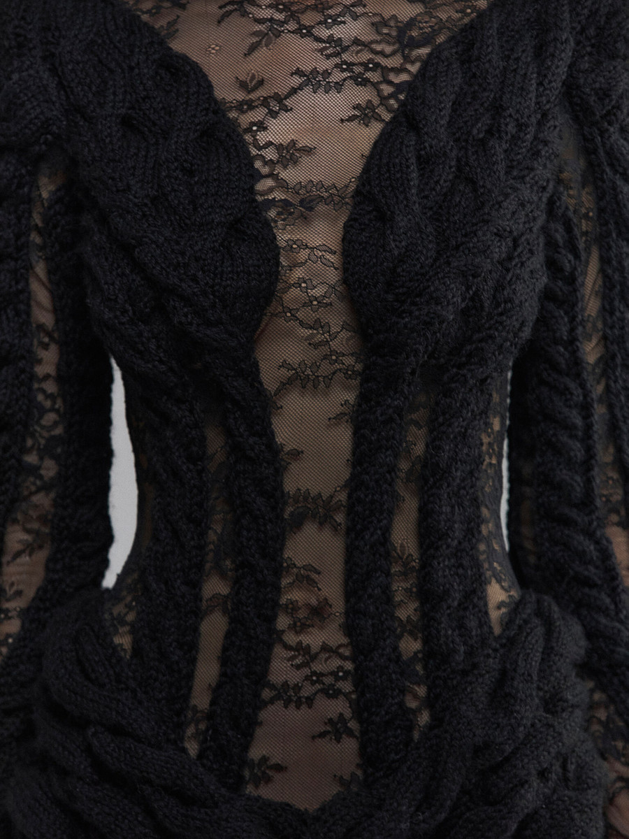 Гипюровая основа платья дополнена объемными плетеными косами. Они закручиваются спиралями на груди и бедрах, делая вещь менее откровенной. Платье подчеркивает достоинства фигуры, защищая от неосторожных взглядов то, что доступно не всем. Длинные рукава и закрытый лиф смещают акцент на ноги, делая их главным центром притяжения образа.