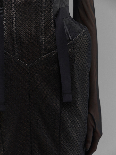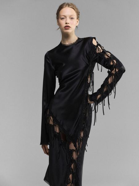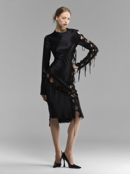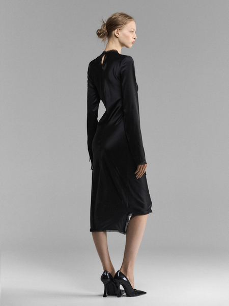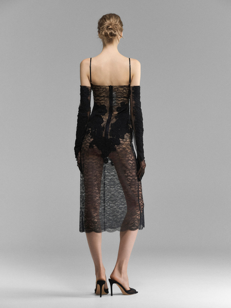 Маленькое черное платье, собравшее в себе все самое соблазнительное из неглиже. Лиф со спущенными лямками, шелковые шорты и ночная сорочка — все это на фоне тончайшего кружева, покрывающего шею и бедра. Платье, которое деликатно обнажает больше, чем скрывает.