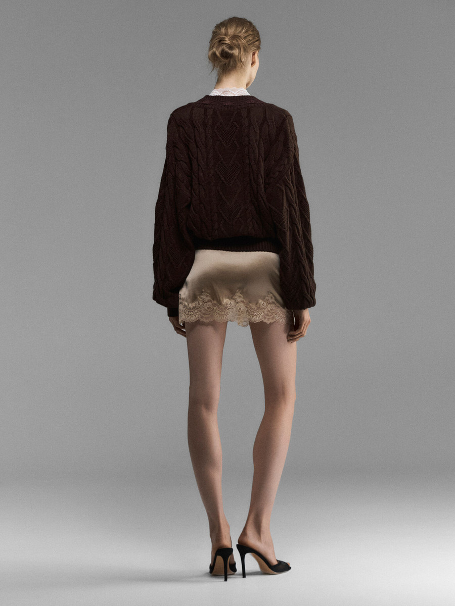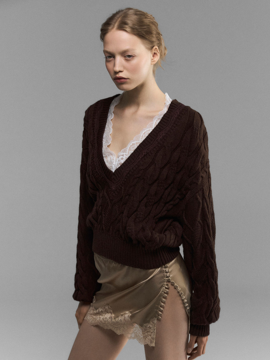 Шерстяной свитер с глубоким V-образным вырезом. Выпуклые косы и широкая резинка узора создают мягкий, фактурный объем. Нежное кружево обрамляет вырез, будто вы накинули домашний кардиган поверх ночного платья. Не соблазн, но мягкая сила женской красоты. Носите как самостоятельную вещь или поверх тонких платьев, наслаивая смыслы и намеки.