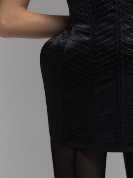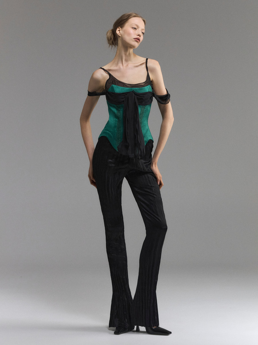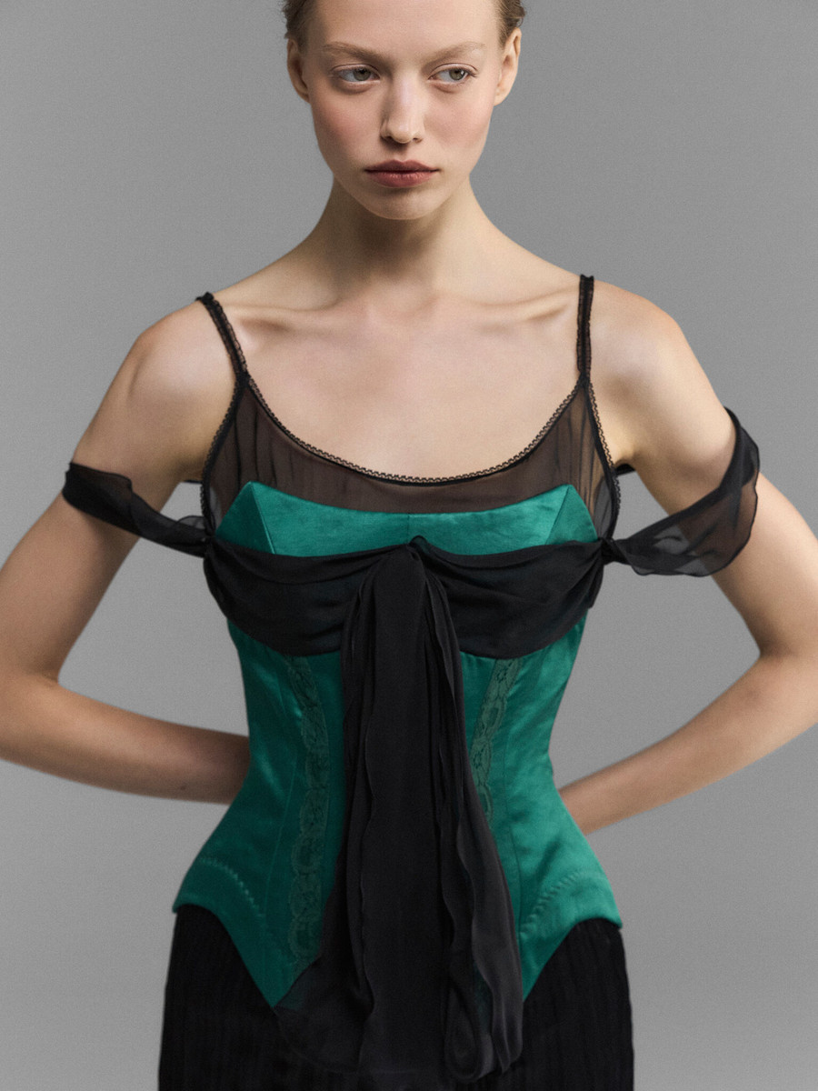 Топ с иллюзией двухслойности сочетает в себе прозрачный черный лиф и изумрудный сатиновый корсет. Широкая лента обвивает плечи, сходясь под грудью пышным бантом. Высокие овальные вырезы на бедрах задают динамику линий, широкая кружевная отделка рельефов дополнительно прорисовывает талию. Носите топ с шелковыми юбками на вечер и джинсами днем.