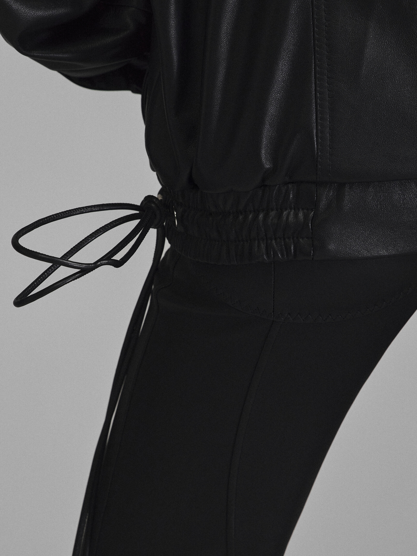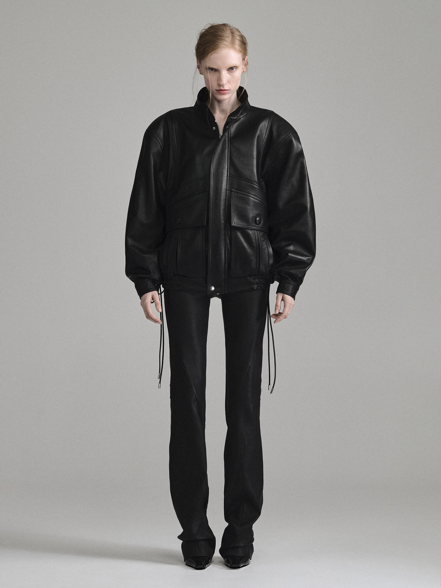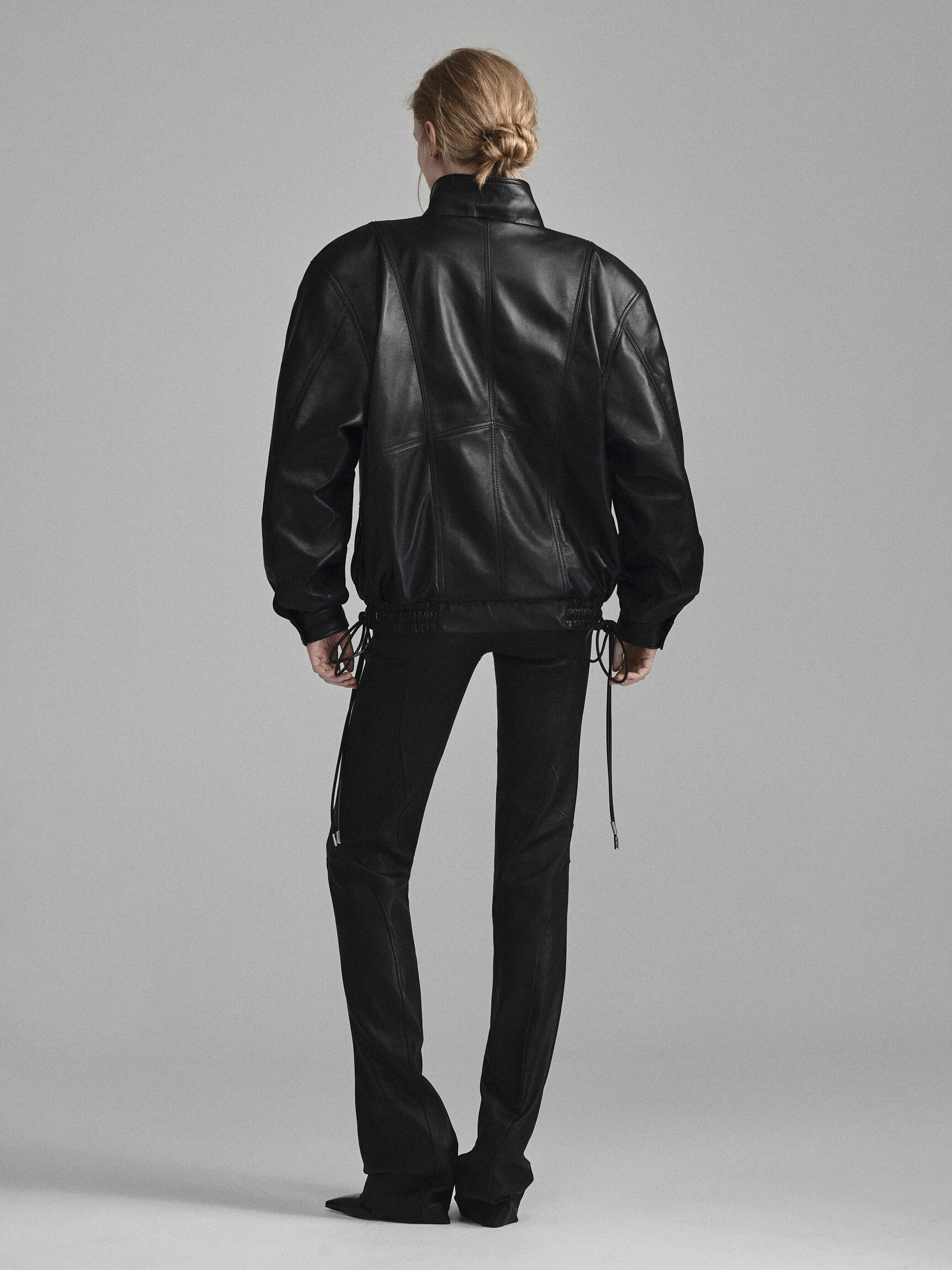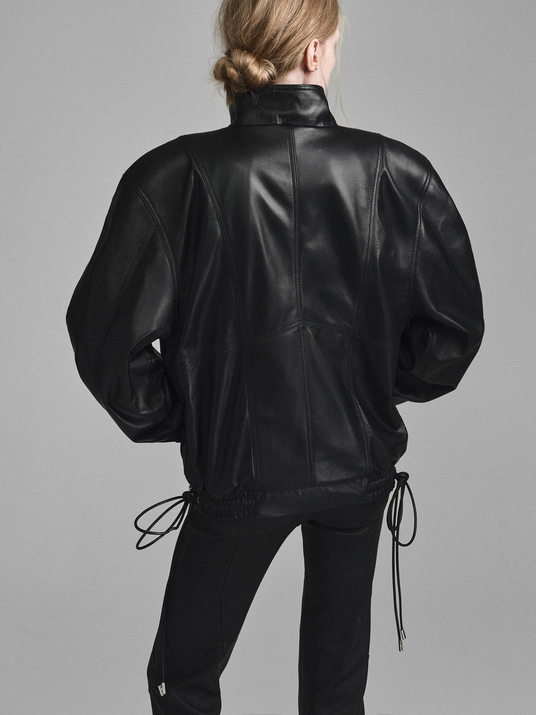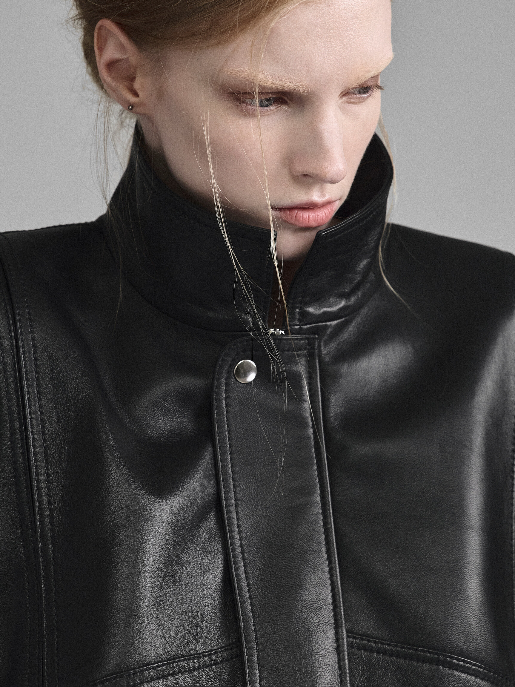 Кожаный бомбер в винтажном стиле с усиленными плечами и объемными карманами. Толстая мягкая кожа с полуматовым финишем отвечает за брутальность образа. Нижний край на резинке дополняет кулиска с крупным шнурком, молнию скрывает кожаная планка на кнопках. Съемный меховой воротник и манжеты на портупее утрируют идею объема, создавая роковой готический силуэт.