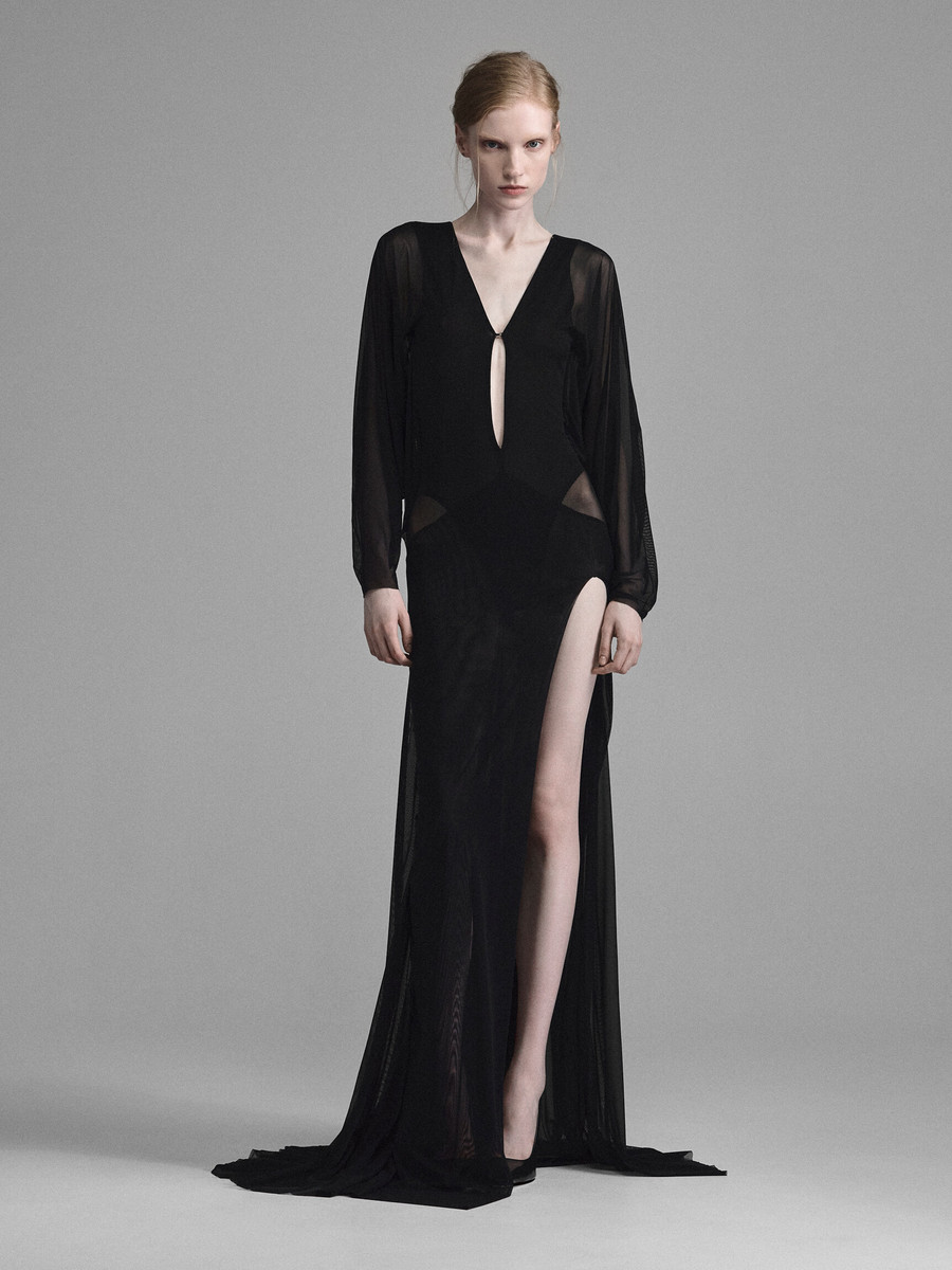 Платье «летучая мышь» с объемными рукавами в стиле 70-х отсылает к эпохе диско-див. Прозрачное, с глубоким вырезом до талии, открытой спиной и высоким разрезом по бедру. Имитация боди формирует основу, которую дополняют ниспадающие слои легкой ткани. Платье струится по телу, создавая иллюзию движения даже в покое. Представлено в черном, красном и сером цветах.