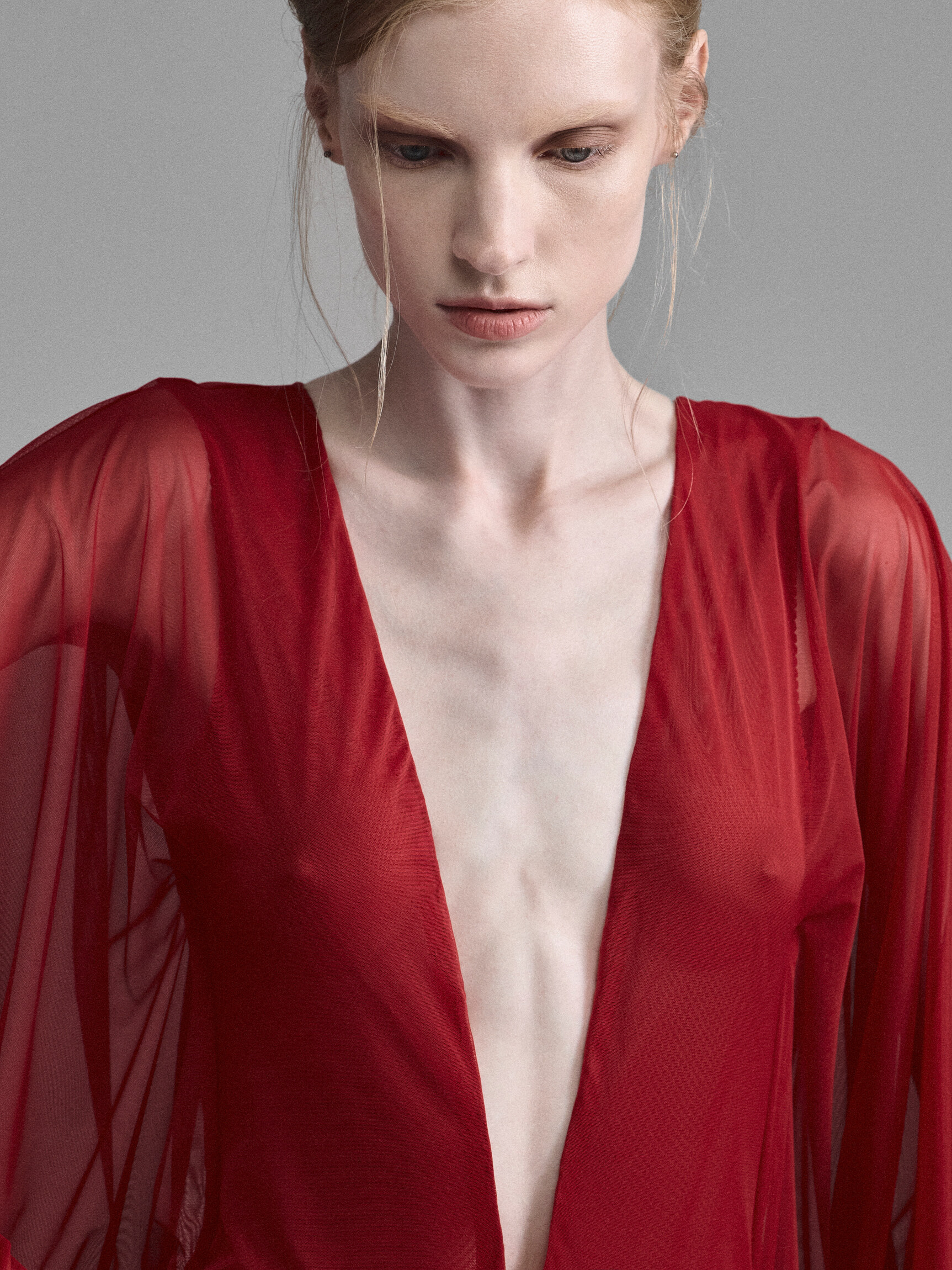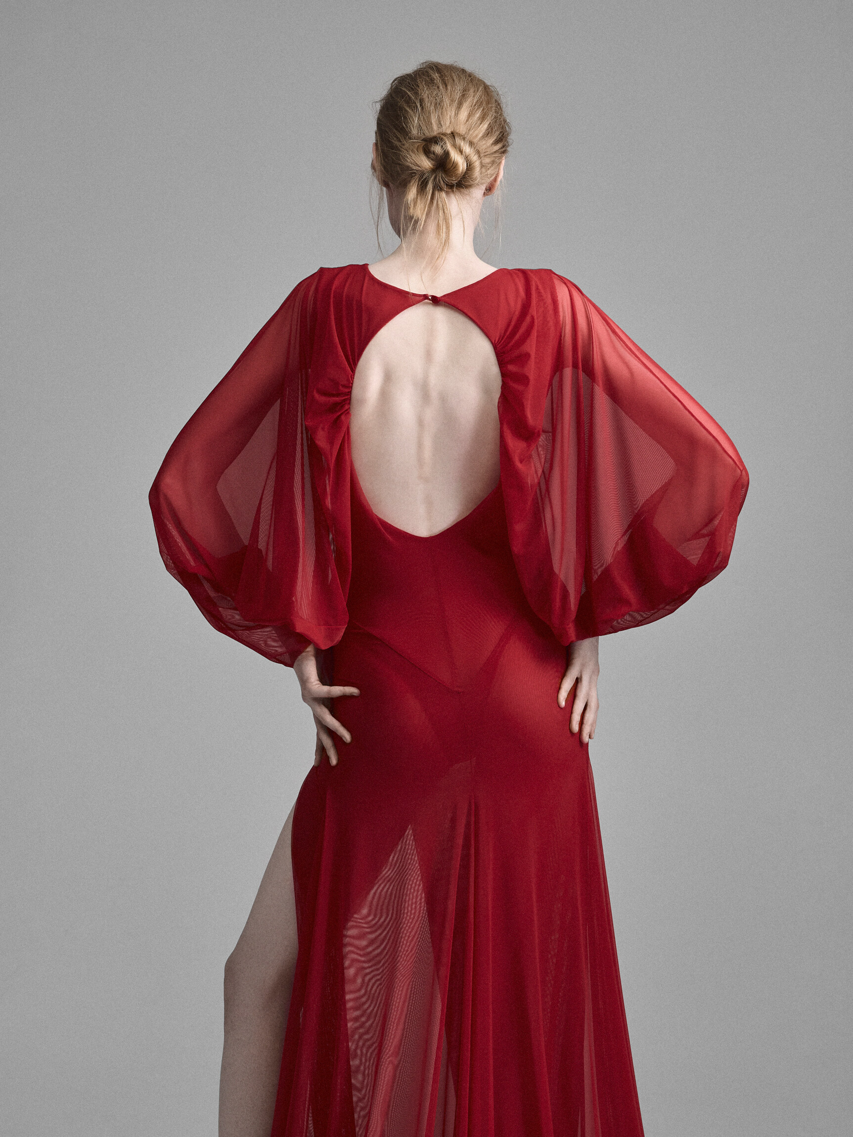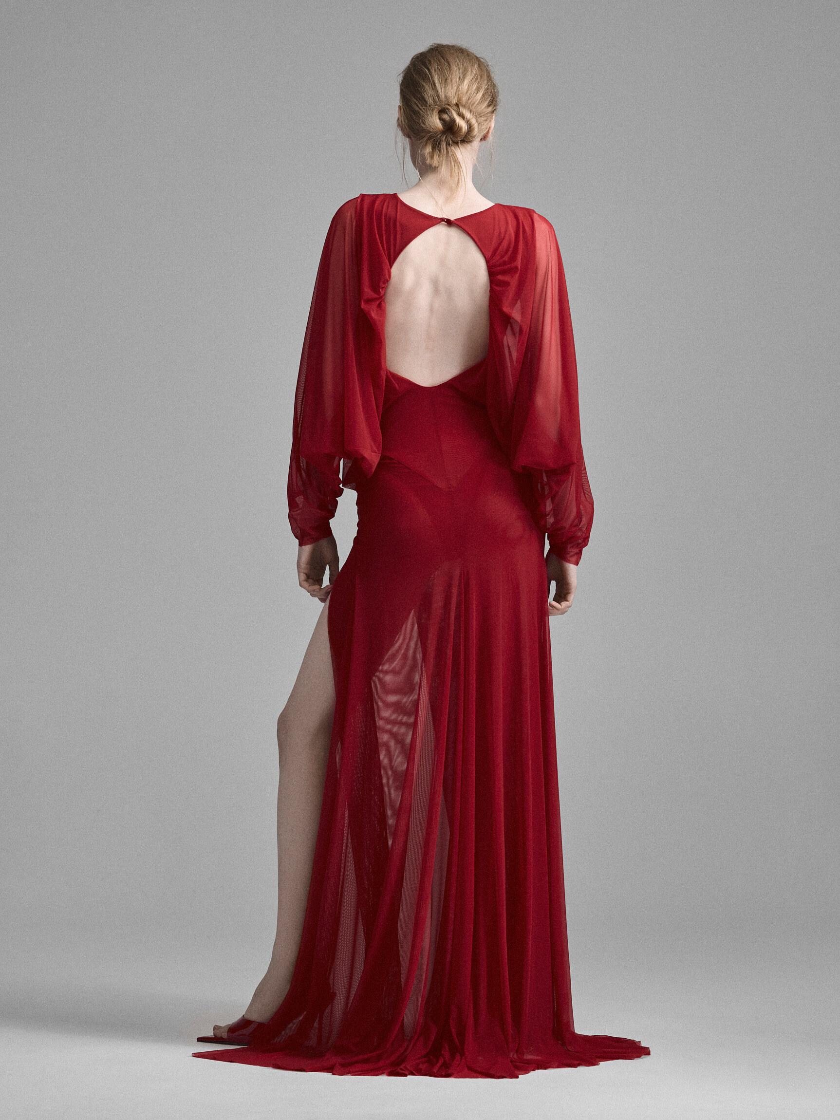 Платье «летучая мышь» с объемными рукавами в стиле 70-х отсылает к эпохе диско-див. Прозрачное, с глубоким вырезом до талии, открытой спиной и высоким разрезом по бедру. Имитация боди формирует основу, которую дополняют ниспадающие слои легкой ткани. Платье струится по телу, создавая иллюзию движения даже в покое. Представлено в красном, черном сером цветах.