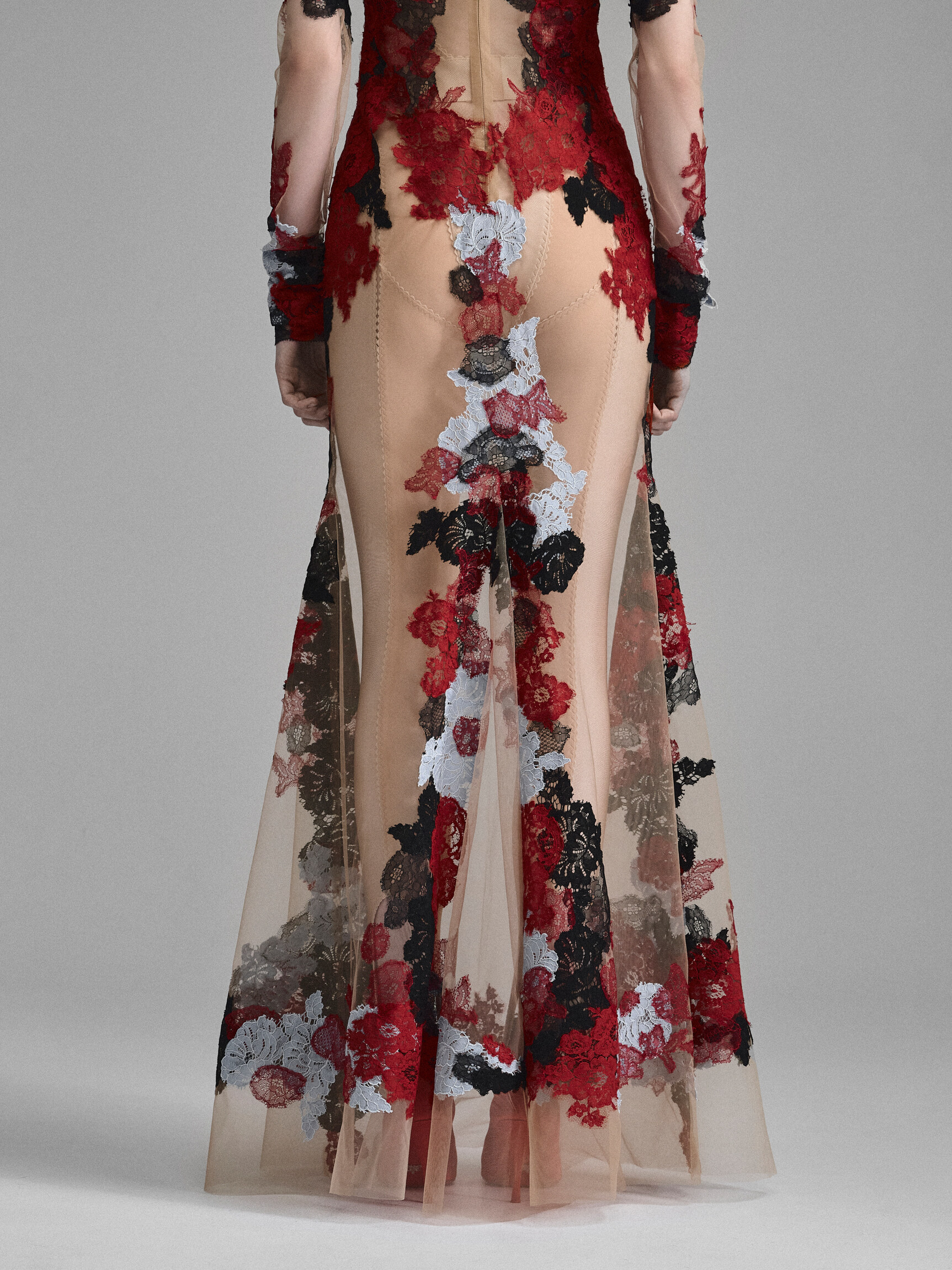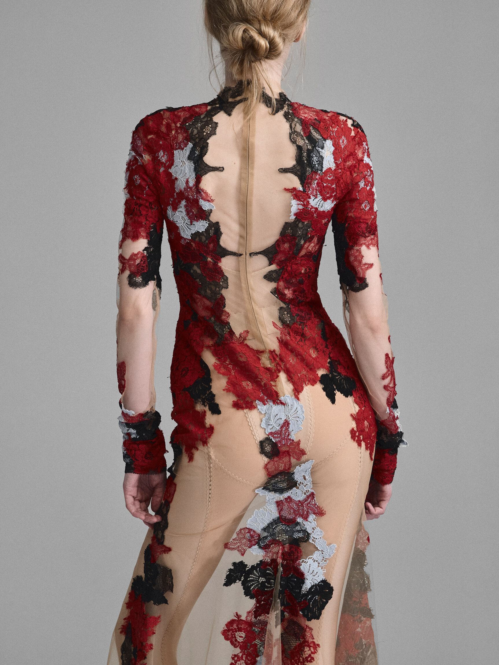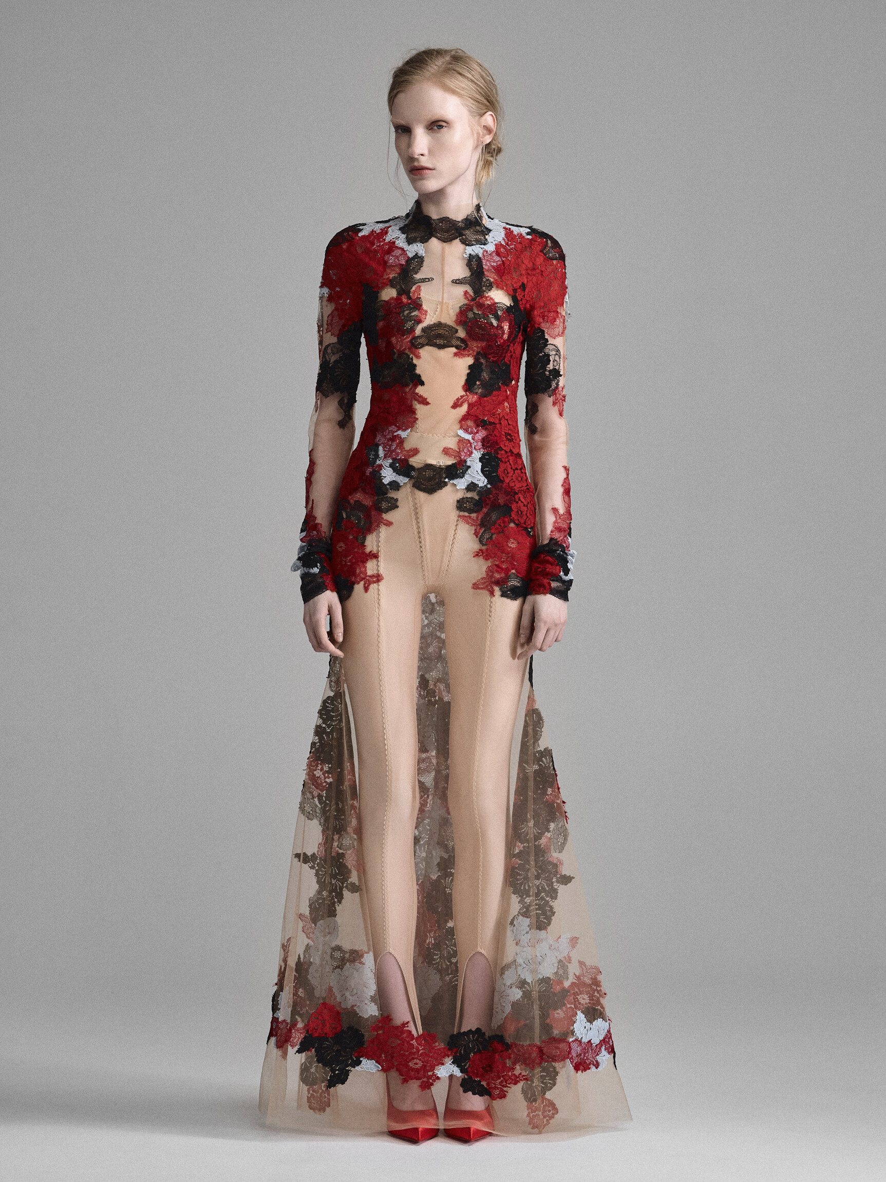 Кутюрное платье из телесной сетки, расшитой цветочным кружевом. Сочетание цветов и наслоение кружевных аппликаций создает впечатление красок, нанесенных на обнаженную кожу в технике бодиарта. Облегающий крой с длинным рукавом, имитацией выреза с колье и расклешенной юбкой — классический силуэт в современном прочтении.