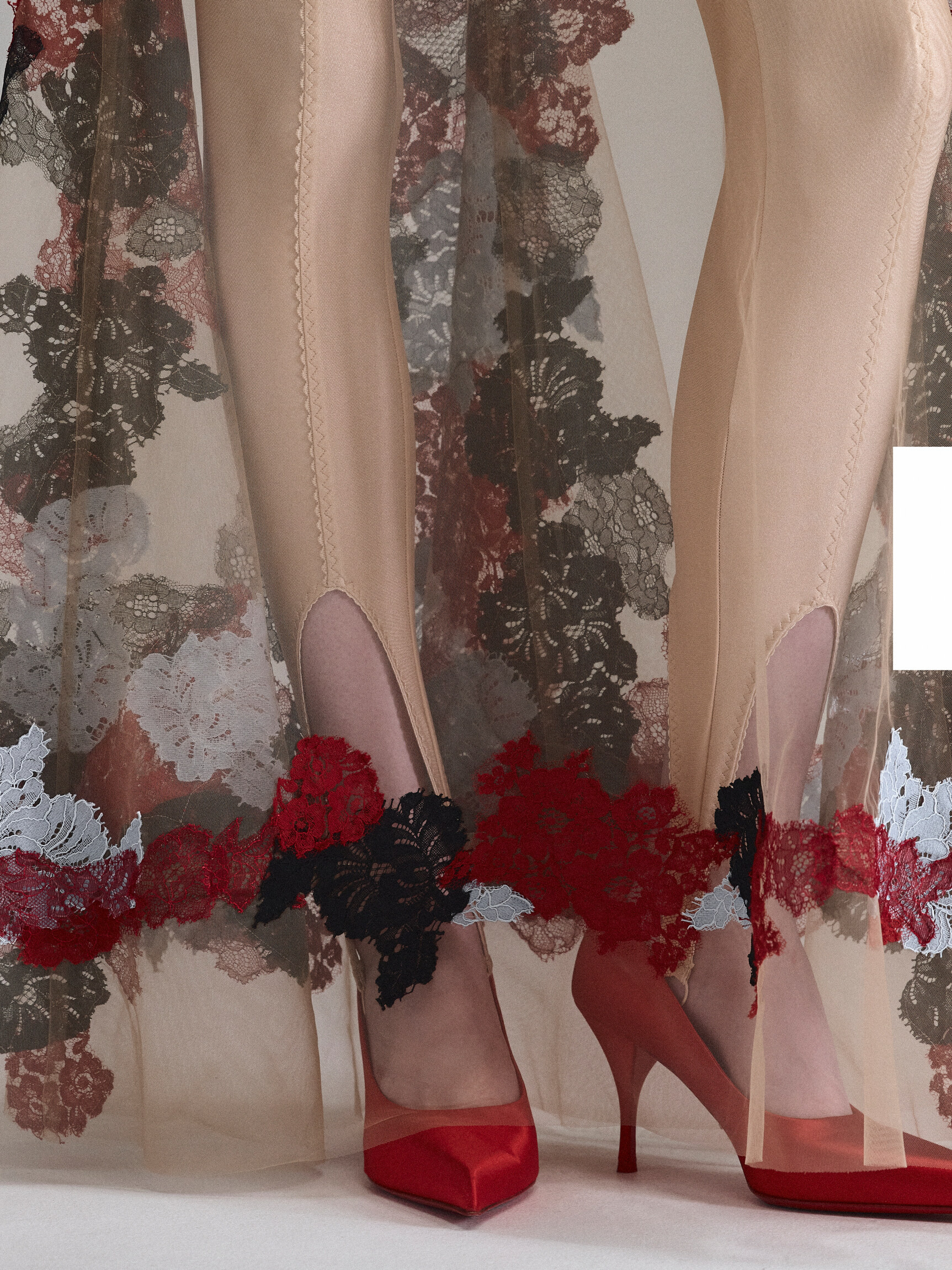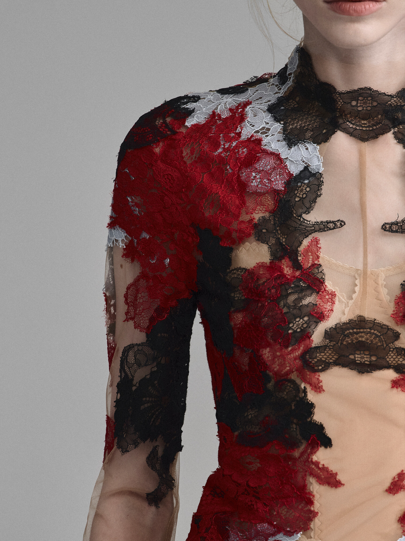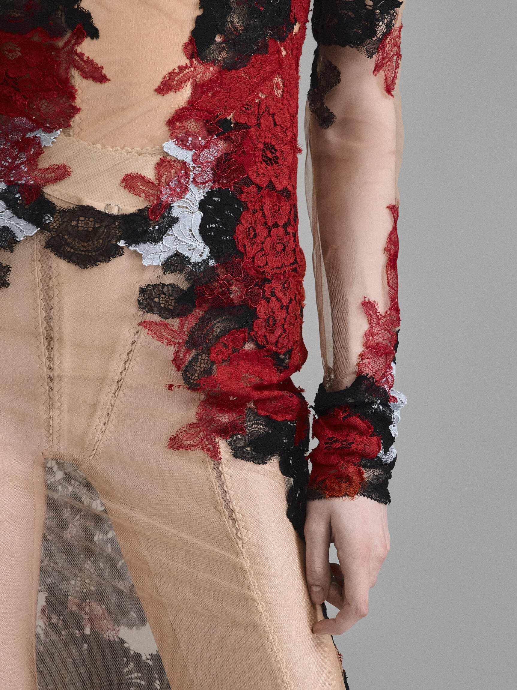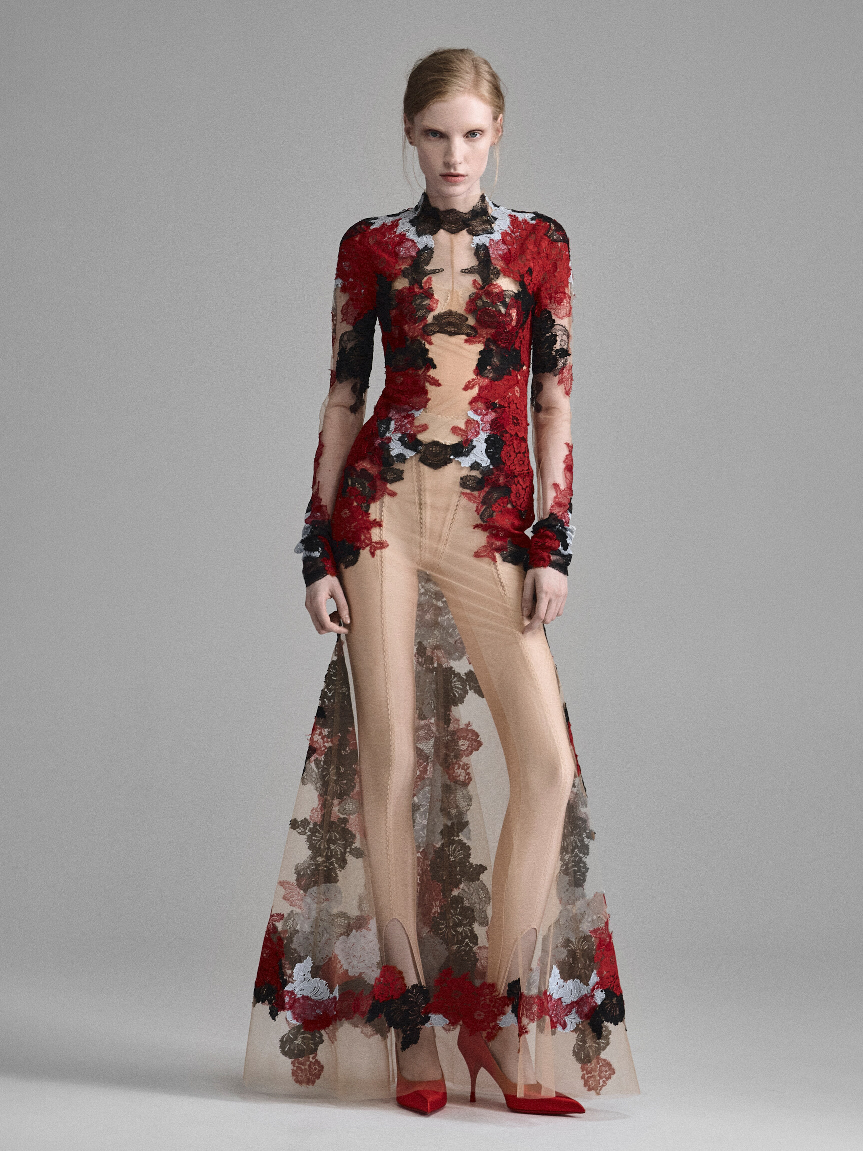 Кутюрное платье из телесной сетки, расшитой цветочным кружевом. Сочетание цветов и наслоение кружевных аппликаций создает впечатление красок, нанесенных на обнаженную кожу в технике бодиарта. Облегающий крой с длинным рукавом, имитацией выреза с колье и расклешенной юбкой — классический силуэт в современном прочтении.