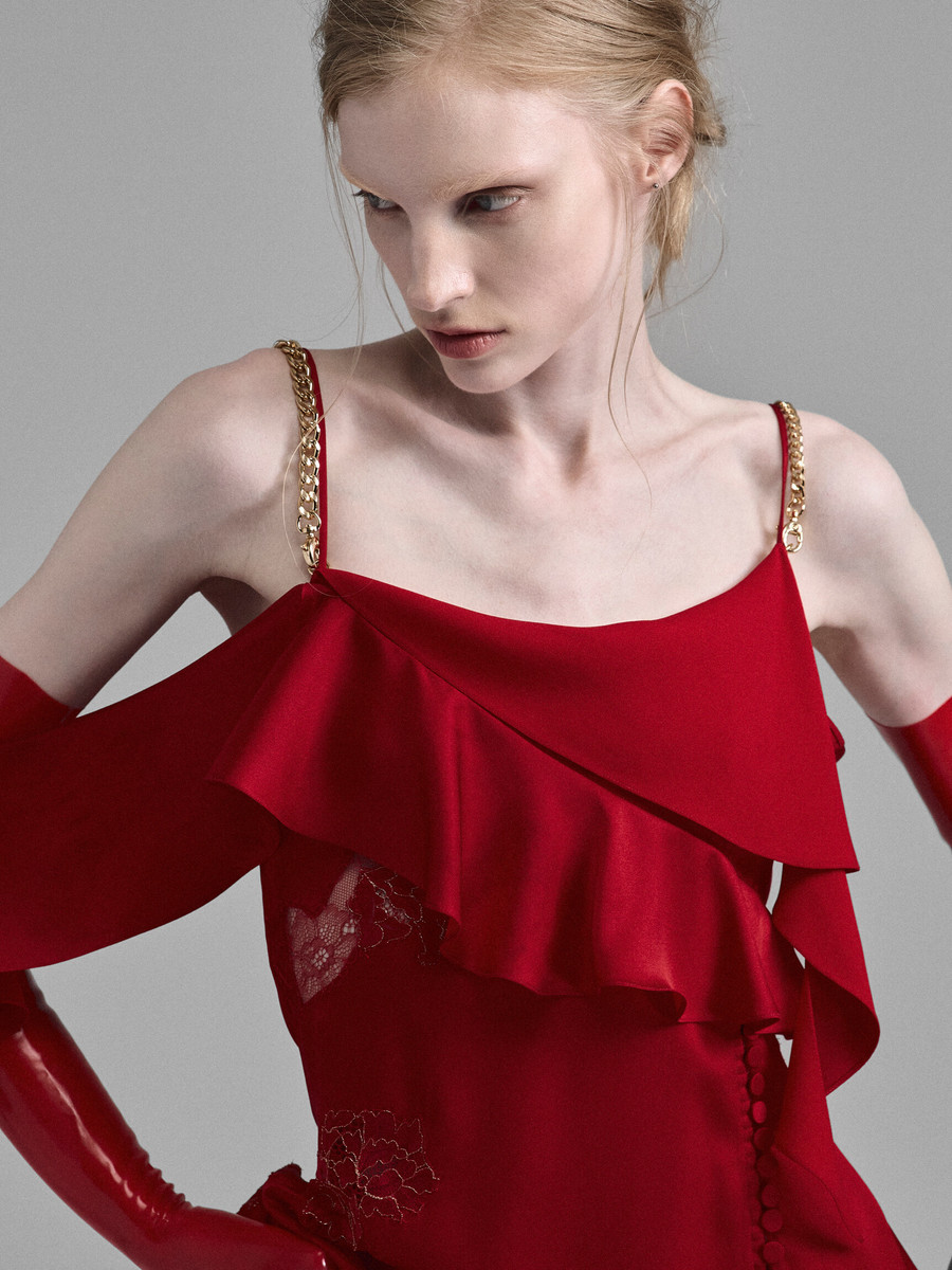 Красное мини-платье с воланами и обнаженной спиной. Тонкие лямки продублированы крупными золотыми цепочками. Асимметричный крой с воланами на лифе делает платье живым, создавая иллюзию движения даже в покое. Ряд обтяжных пуговиц на воздушных петлях обнажает бедро, подол спускается острым краем с одной стороны. Основу платья дополняют прозрачные кружевные вставки в тон.