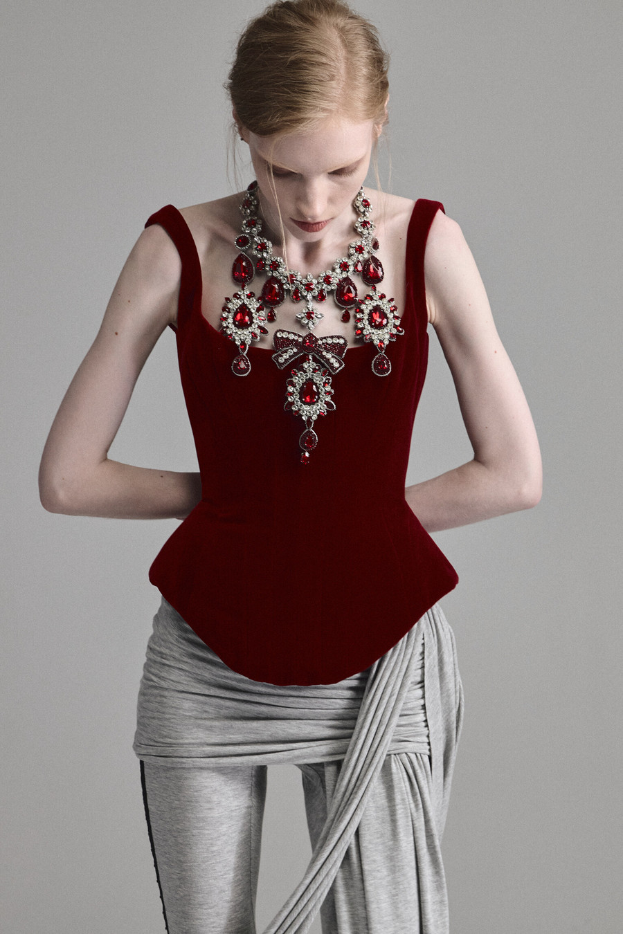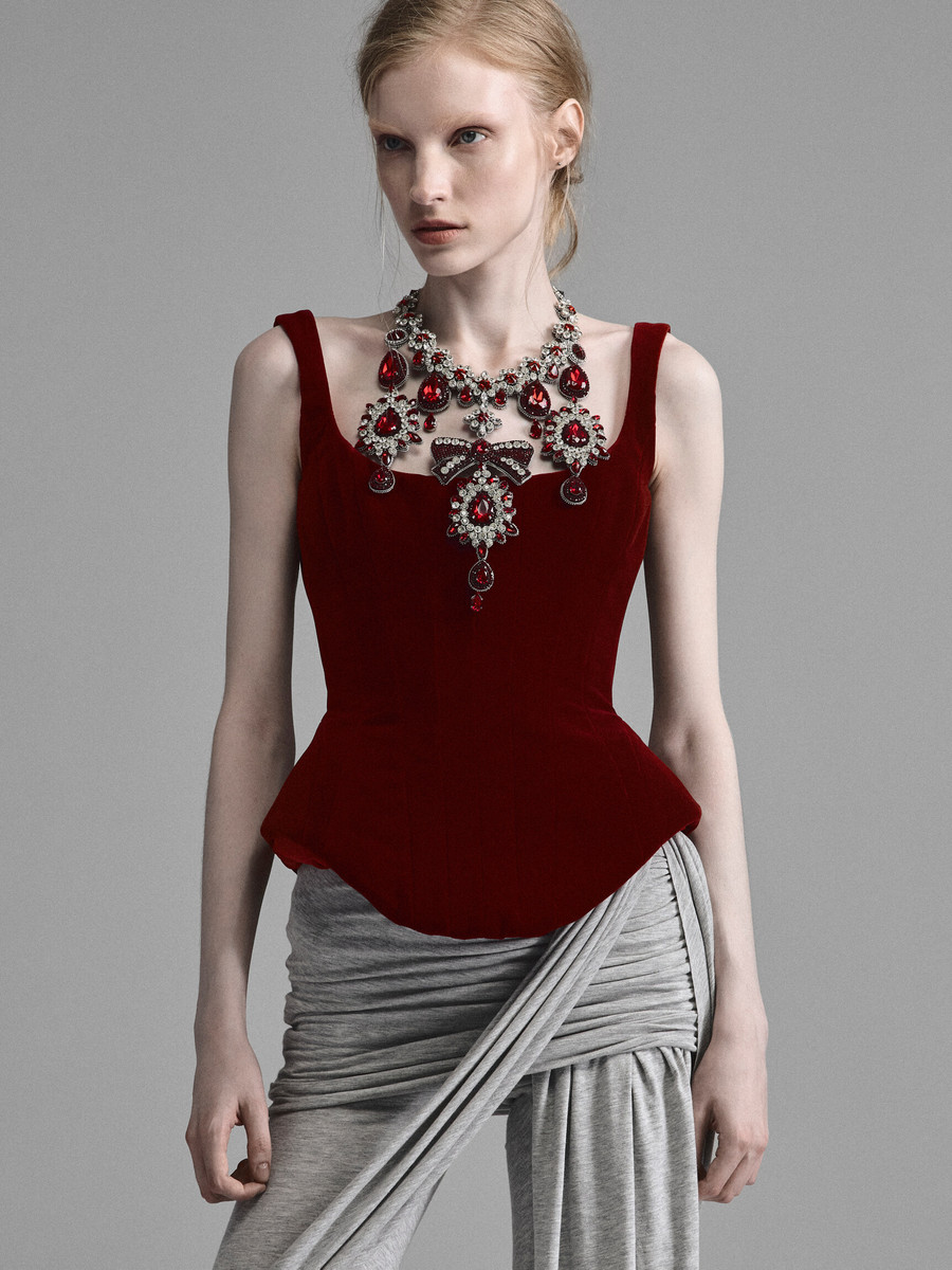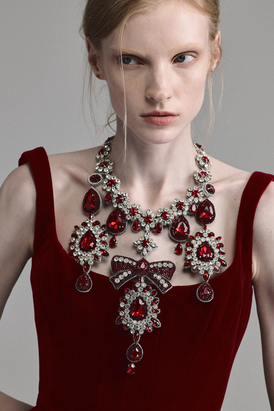 Имперское ожерелье с уникальным рисунком. Крупные рубиновые камни в сияющем окружении кристаллов украшают ключицы и спускаются ниже линии декольте. Нескромное, по-королевски роскошное колье способно стать центральным элементом притяжения в вашем образе.