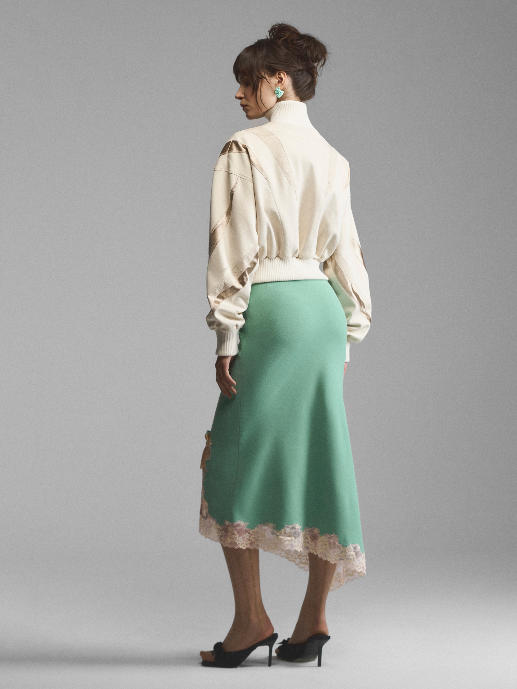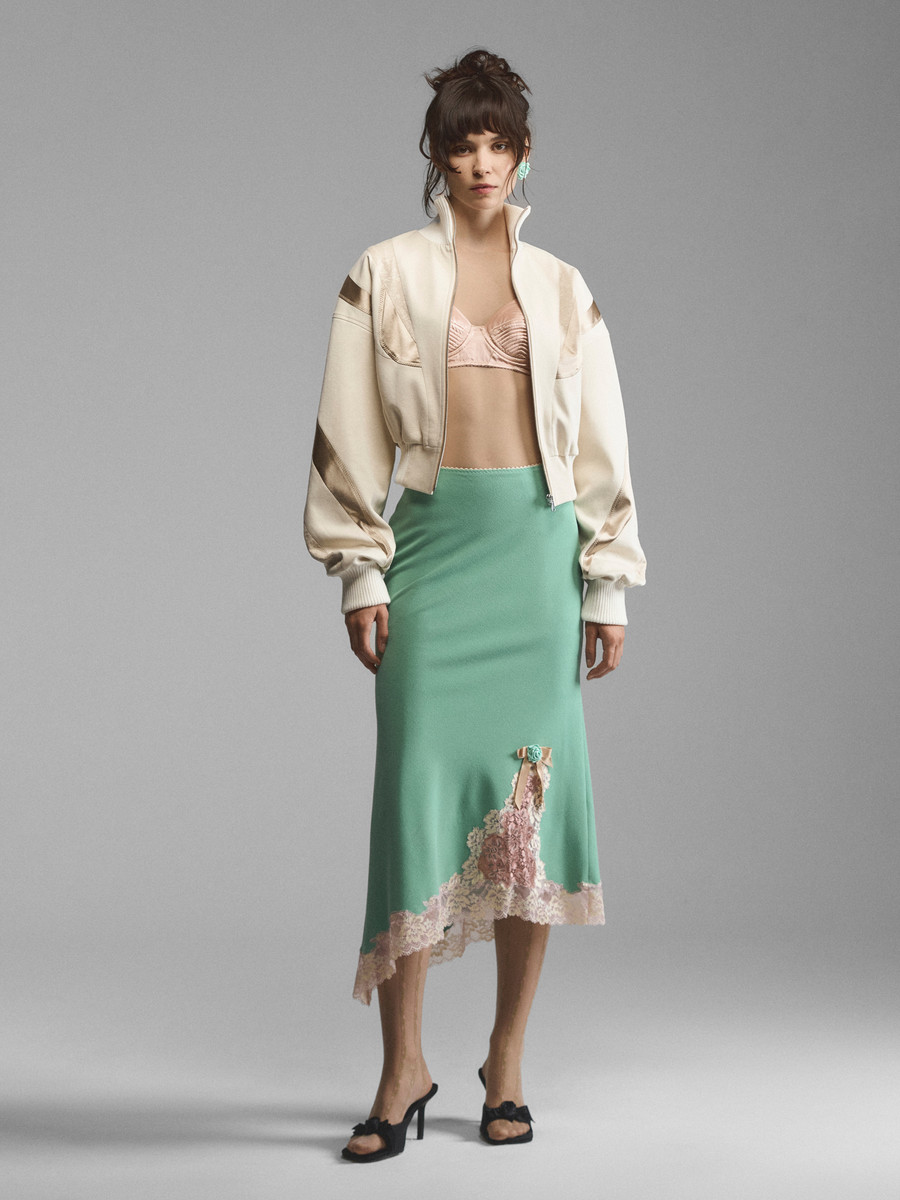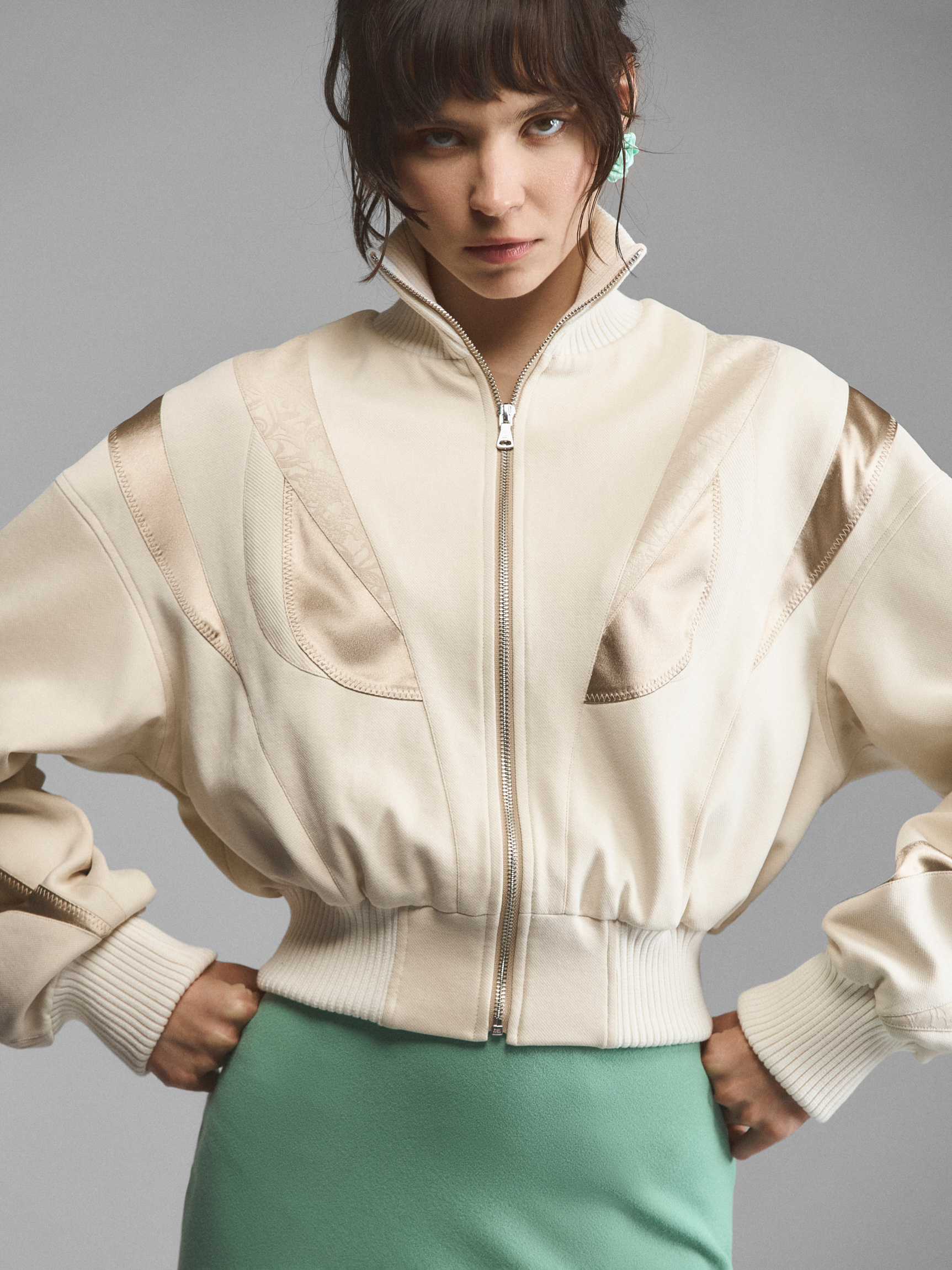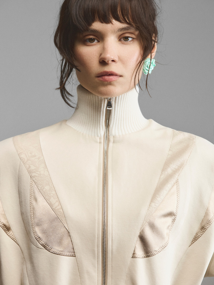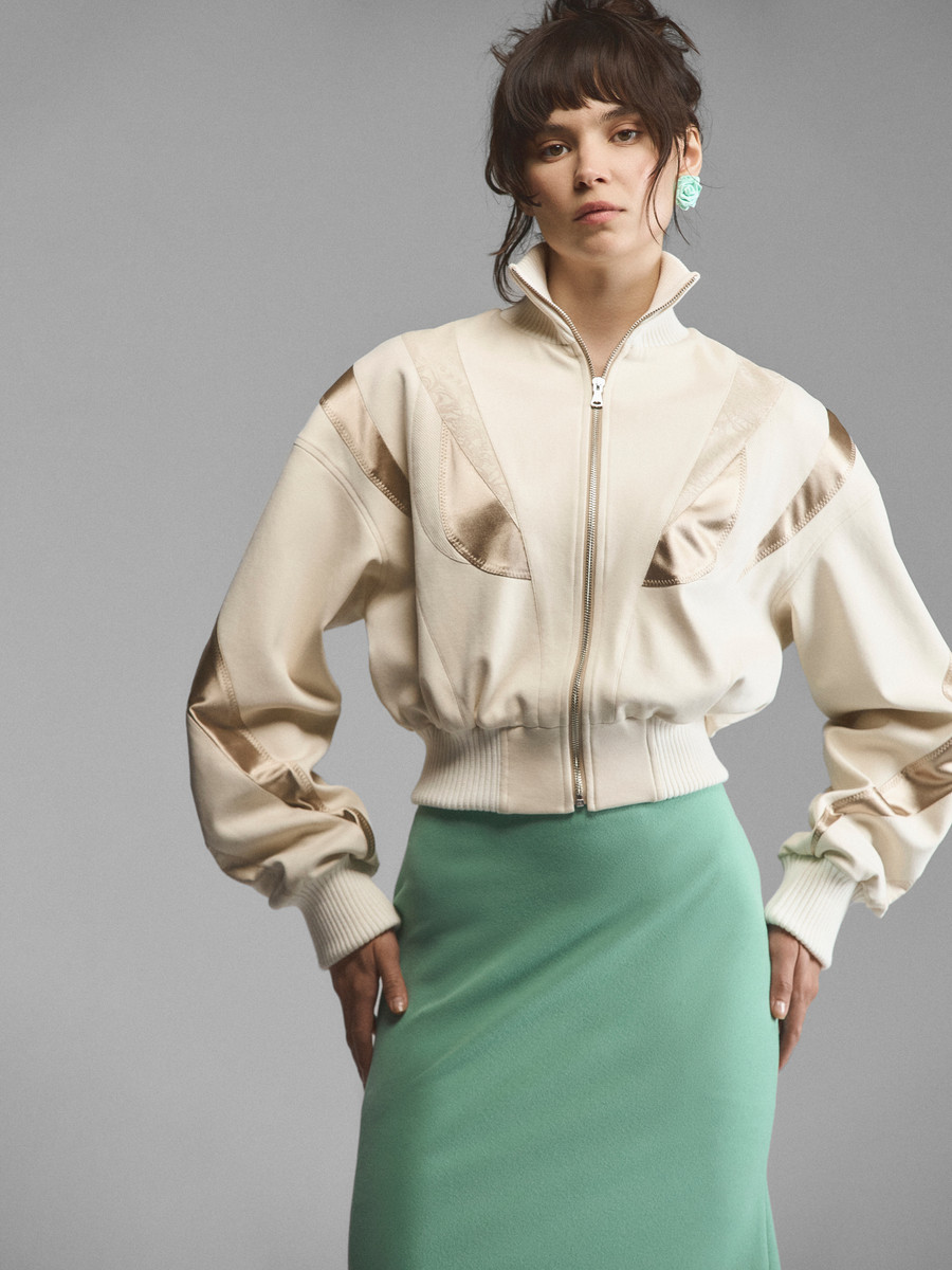 Мультифактурный бомбер с атласными вставками. Облегающая трикотажная стойка-горловина и широкие манжеты со сборками подчеркивают мягкий объем модели. Спущенный рукав и глубокая пройма дарят свободу, эластичные трикотажные резинки и молния обеспечивают фиксацию. Сложный крой с блестящими вставками придает матовой основе сияния и делает ее женственнее. Максимально феминная модель, сочетающая в себе эстетику 90-х и спортивную основу с бельевым декором.