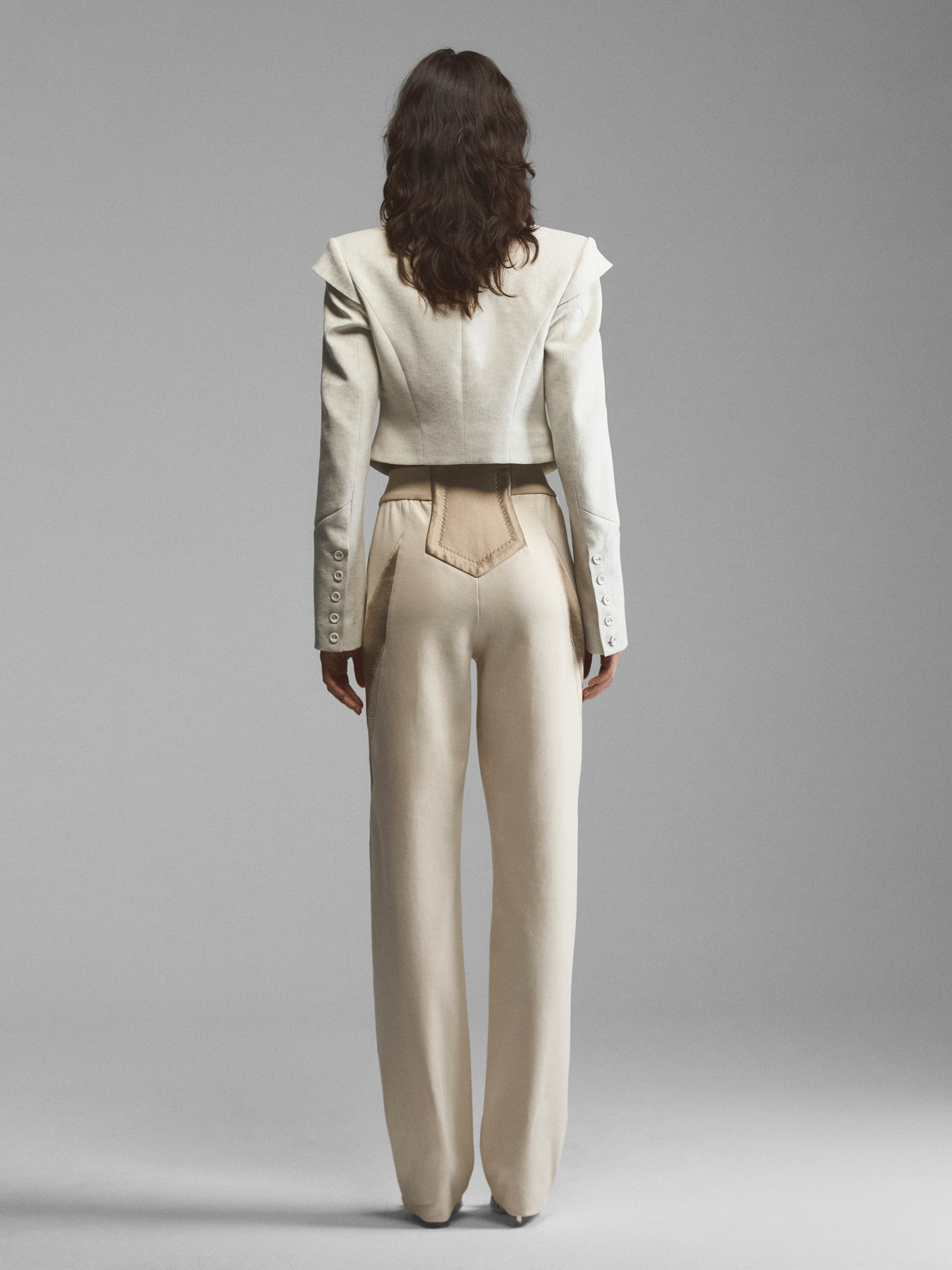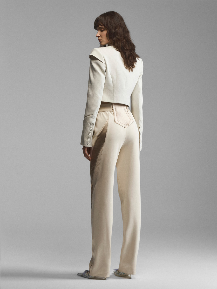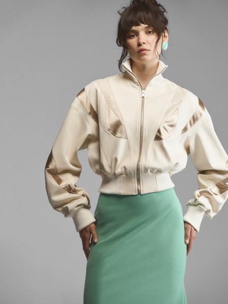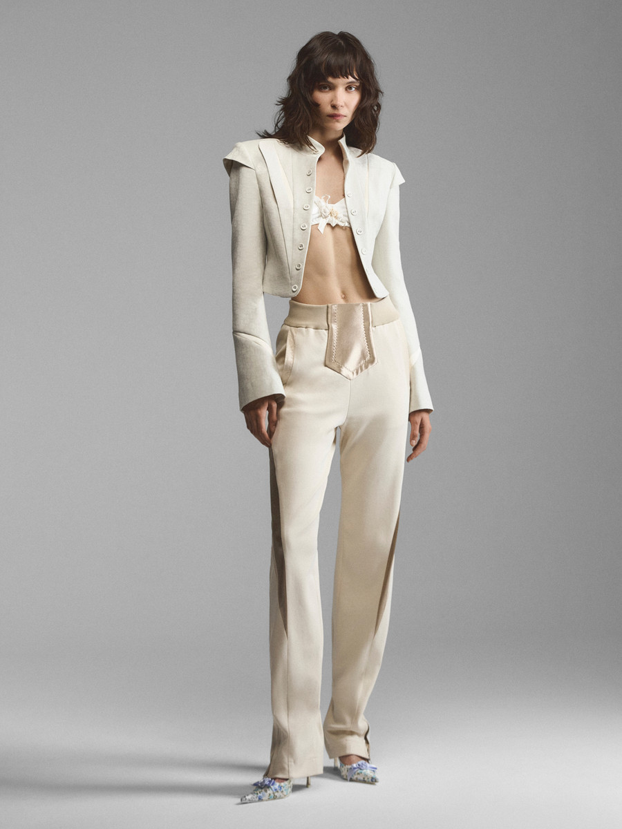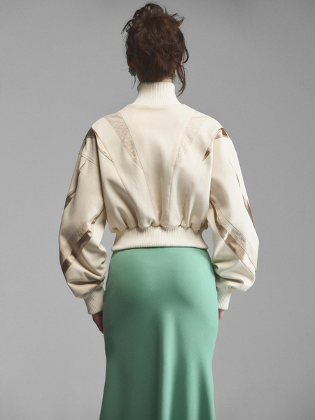 Укороченный жакет сложного кроя со стойкой и расклешенными рукавами. Рельефные планки на лифе создают эффект многослойности, стойка и плечевые накладки имитируют силуэт форменных мундиров. Модель в духе Napoleon jacket выглядит необычно за счет жаккарда с сатиновым тиснением. Приталенный зауженный крой и уменьшенная длина подчеркивают фигуру, акцентируя внимание на талии. Удлиненные рукава с расширением книзу делают модель женственной.