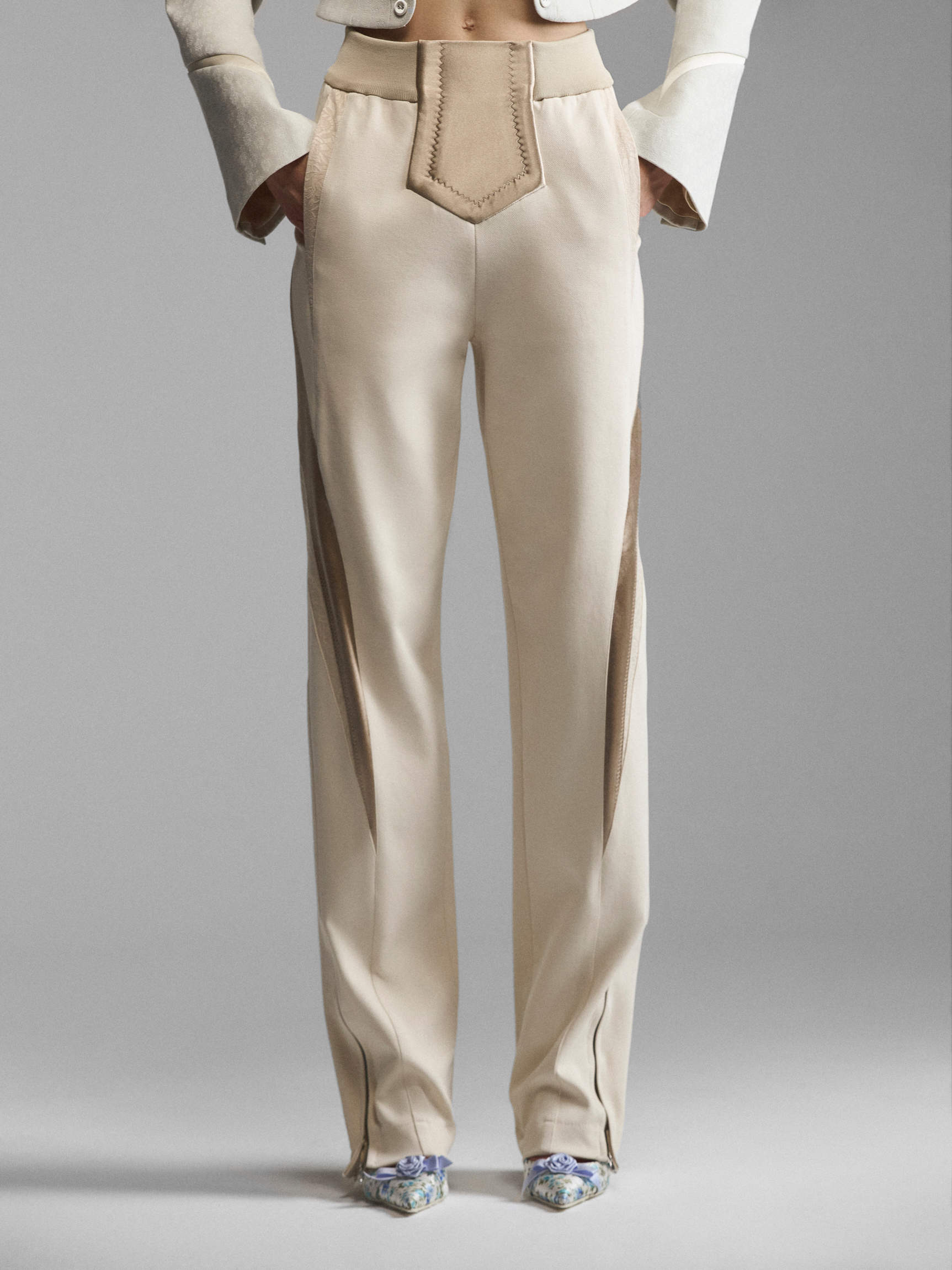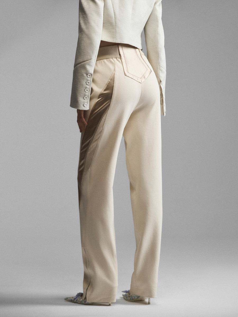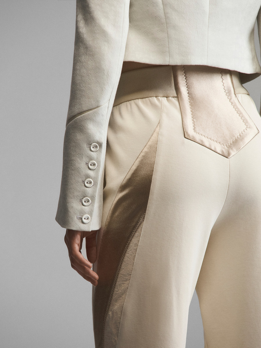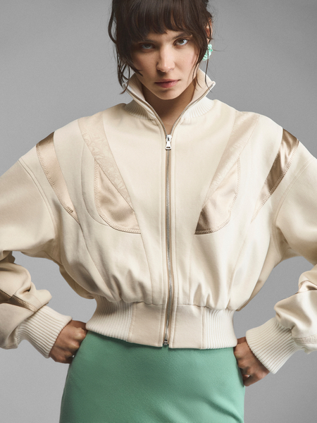 Укороченный жакет сложного кроя со стойкой и расклешенными рукавами. Рельефные планки на лифе создают эффект многослойности, стойка и плечевые накладки имитируют силуэт форменных мундиров. Модель в духе Napoleon jacket выглядит необычно за счет жаккарда с сатиновым тиснением. Приталенный зауженный крой и уменьшенная длина подчеркивают фигуру, акцентируя внимание на талии. Удлиненные рукава с расширением книзу делают модель женственной.