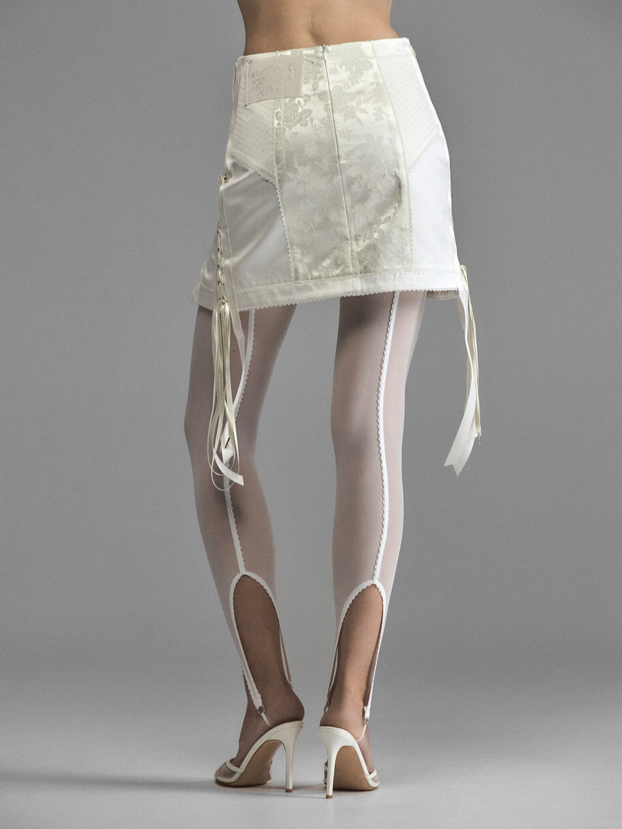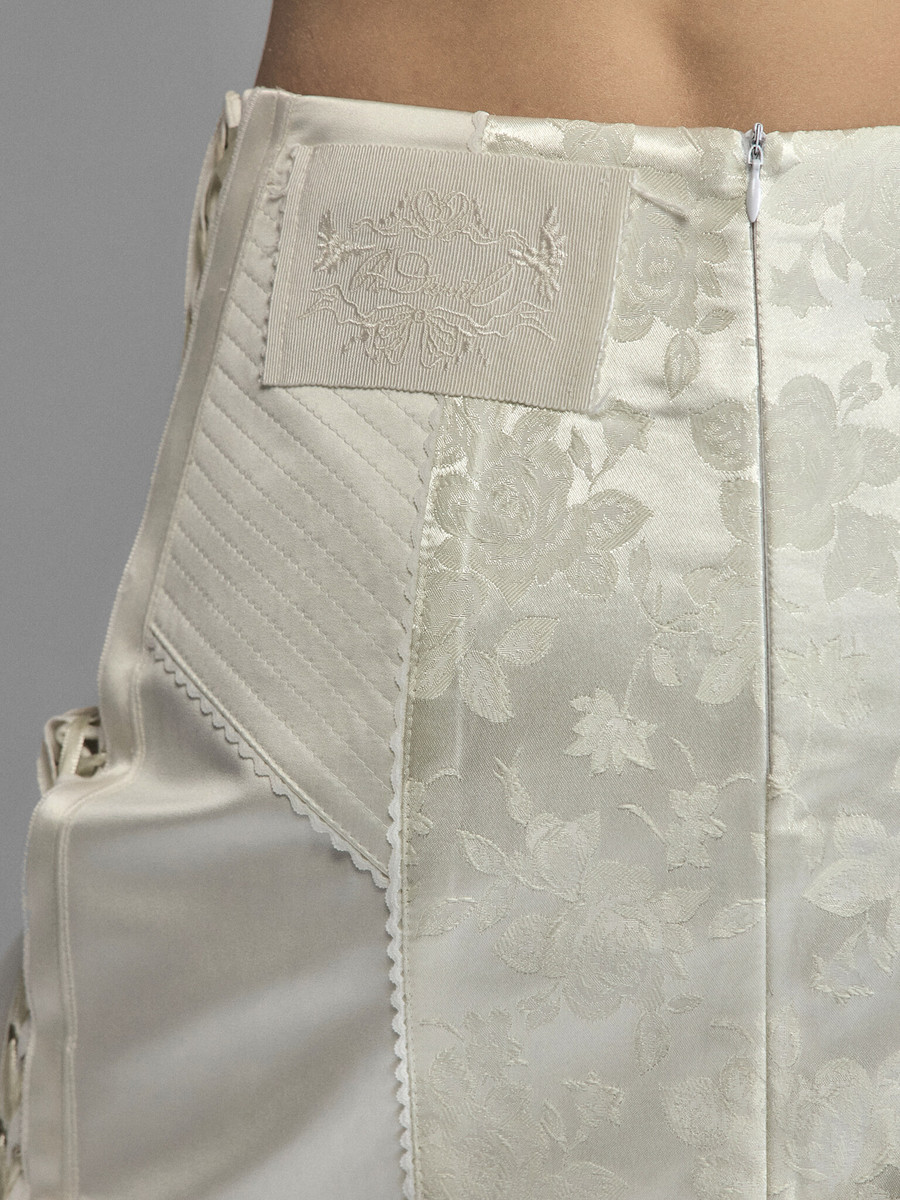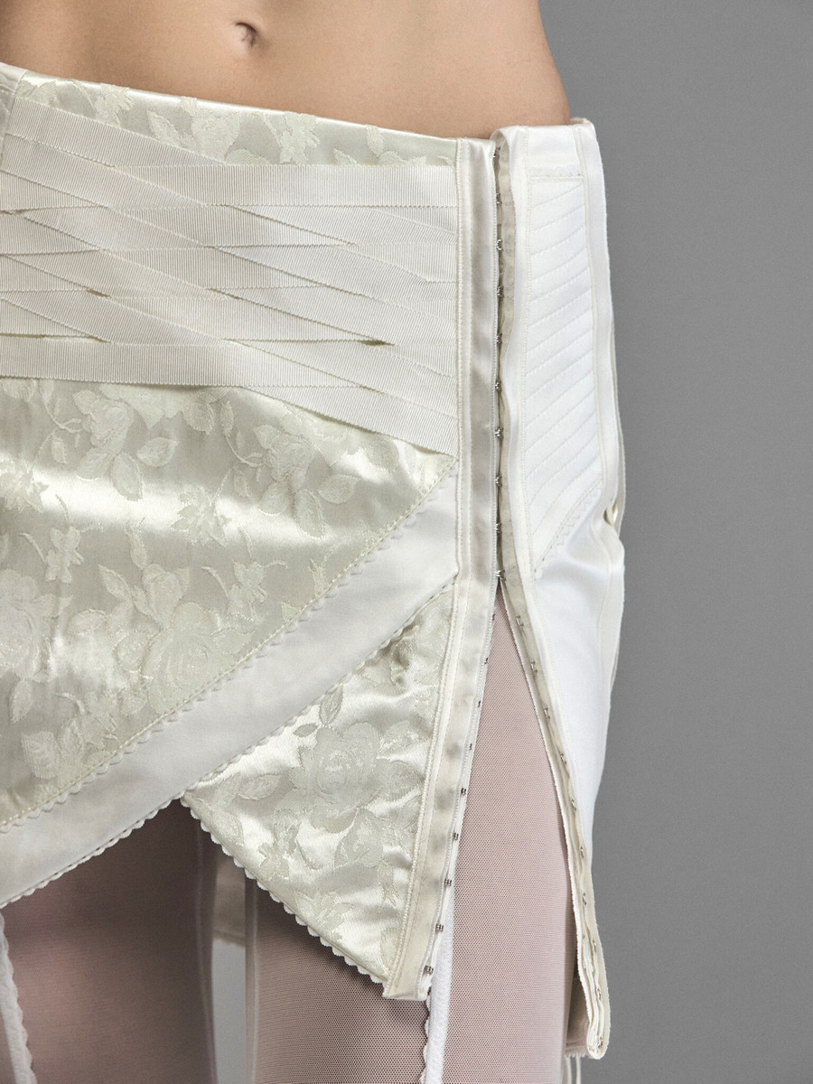 Мультифактурная асимметричная юбка-мини со вставками из бельевых элементов — воплощение смелого контраста, в котором переплетаются невинность и неприкрытая сексуальность в лучших традициях бренда. Надставленные детали формируют выразительную асимметрию и элегантный боковой разрез, визуально удлиняющий ногу и добавляющий дерзости в образ. Бельевые резинки, искусно стягивающие бёдра, подчёркивают силуэт, словно заигрывая со зрителями и оставляя за собой интригующую тайну. Края юбки кутюрно оторочены французским фестонным кружевом, добавляя роскошь и утончённую романтику, превращая каждую деталь в символ чувственного обаяния.