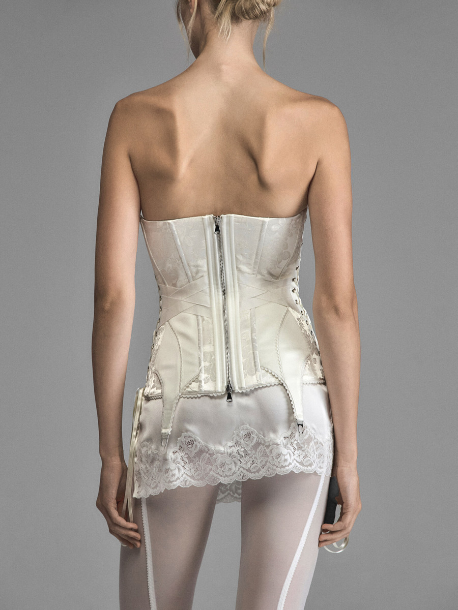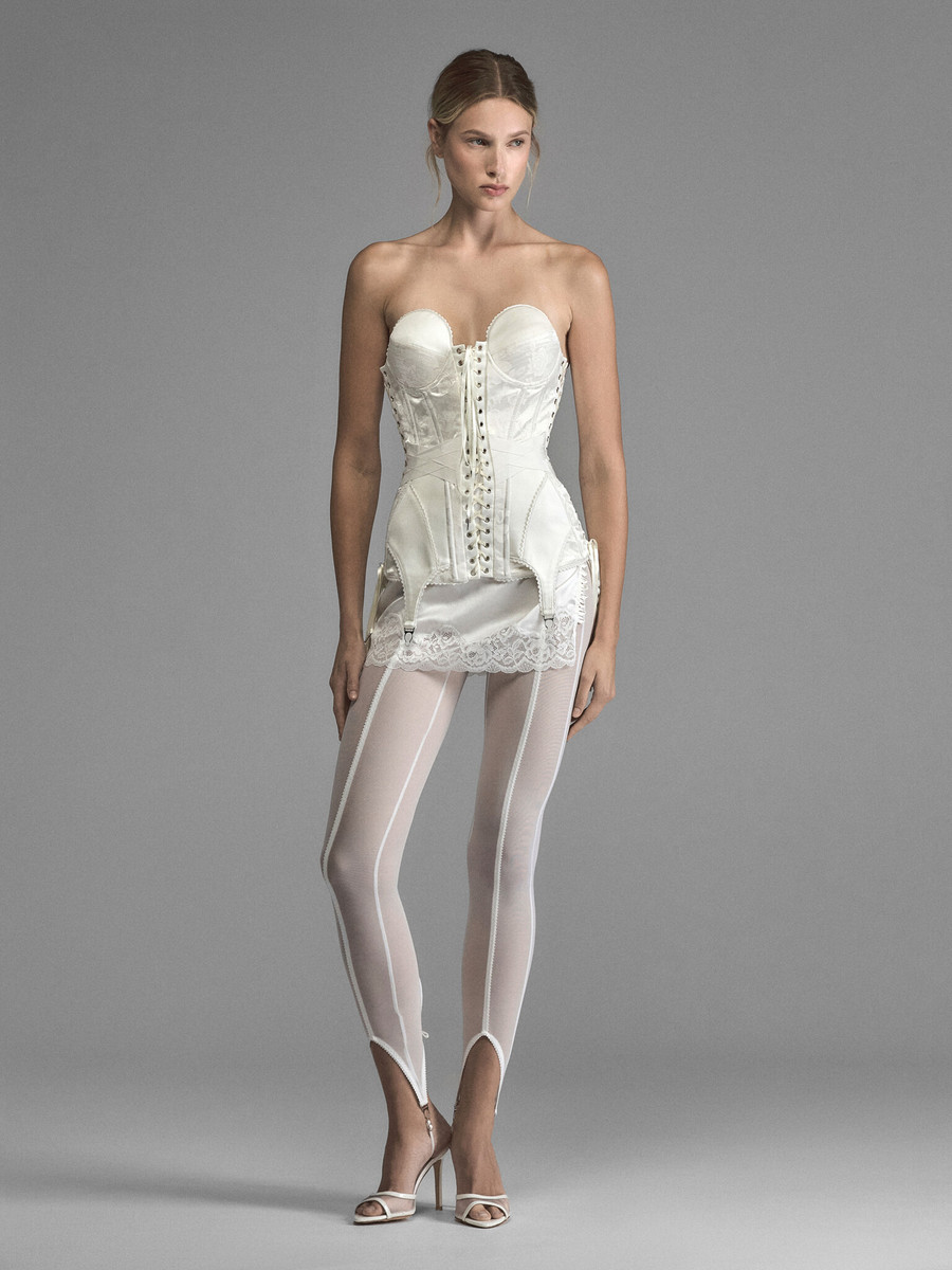 Симбиоз тонких бельевых резинок, подвязок и филигранных отстрочек создает впечатление сложной, монохромной многослойности, которая играет с текстурами и объемом. Каждый шов, каждая деталь подчеркивают мастерство кроя, а искусно обработанные французским фестоном края корсета добавляют ощущение утонченной грации. Стилизуйте его с расслабленными джинсами, чтобы привнести в образ щепотку драмы