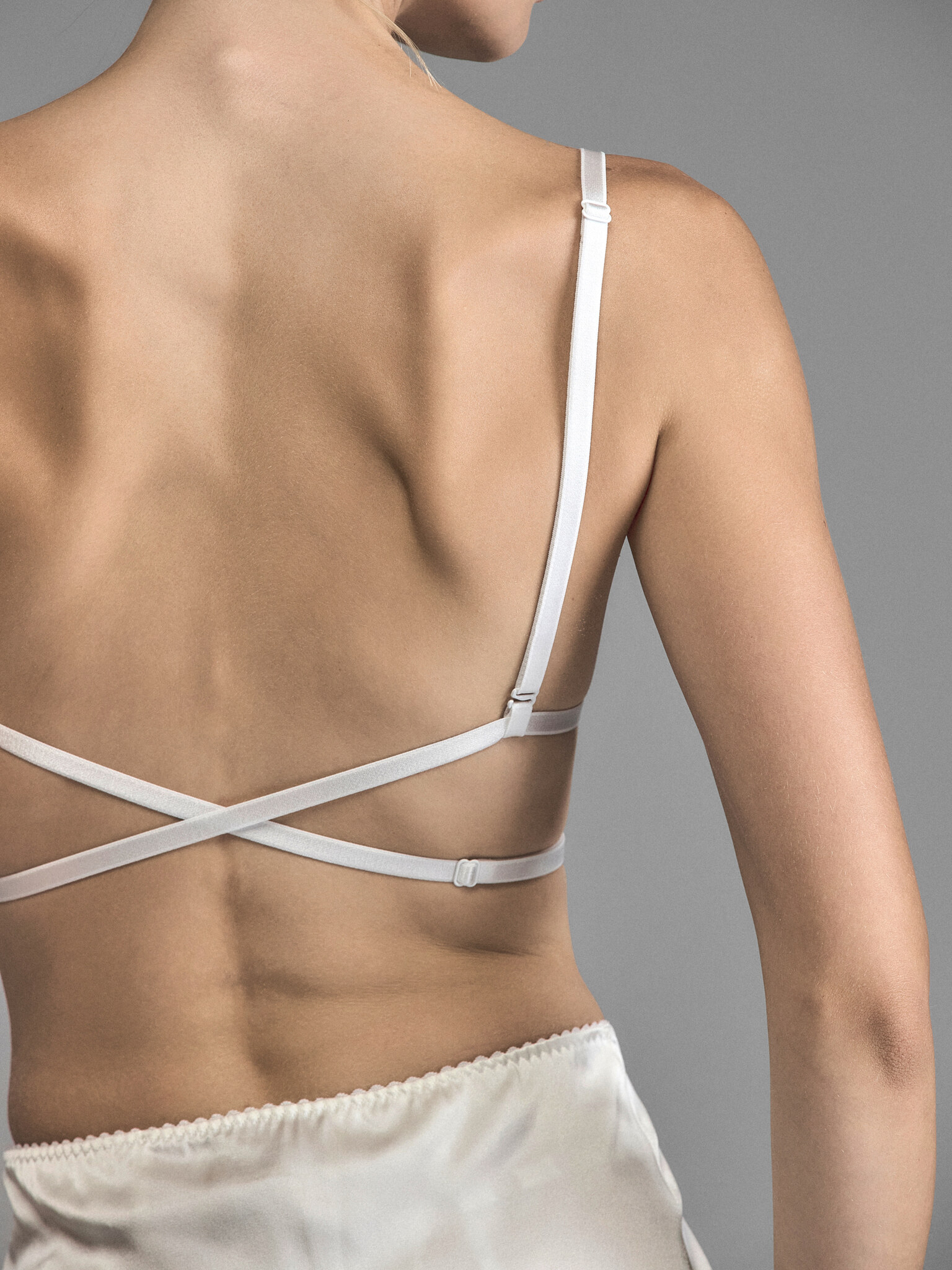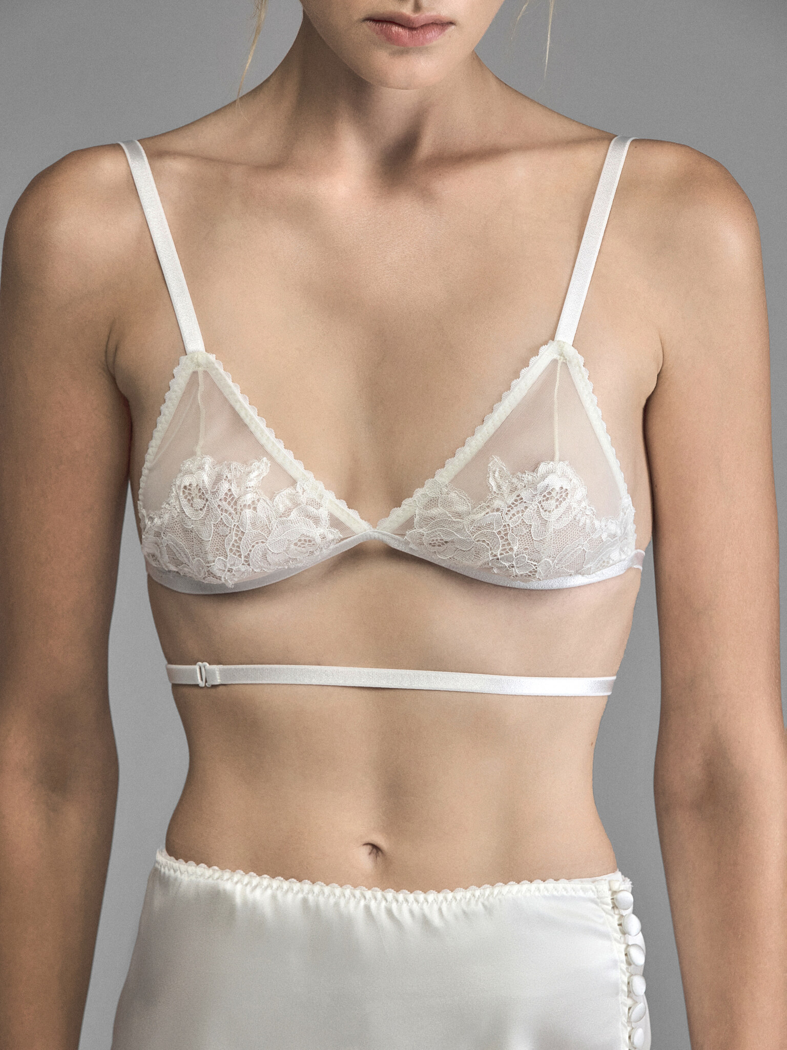 Лиф-бра с треугольными чашечками из мягкой прозрачной сетки обвивается вокруг тела эластичными лямками. Конструкция оставляет спину максимально открытой, благодаря чему бра будет незаметен под платьем с открытой спиной. Сетку украшают цветы в тон. Лиф доступен в золотом и белом вариантах.