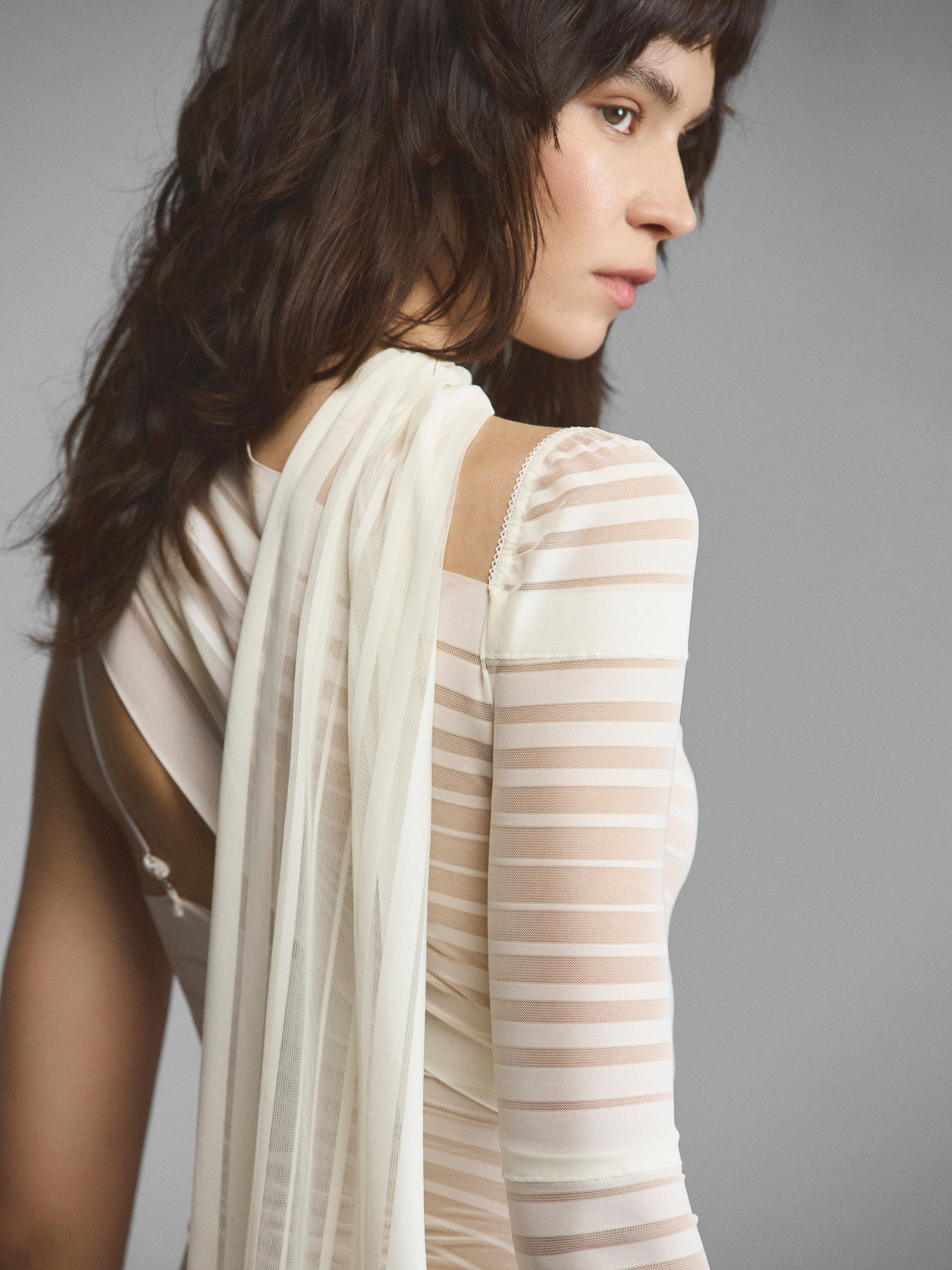 Полупрозрачное силуэтное платье с полосками. Декольте каре держится на одном плече тройной лямкой, на втором продолжается облегающим рукавом. Эластичный материал повторяет контуры тела, подчеркивает каждый изгиб. Часть лифа на спинке переходит в шарф. Полоски разной ширины создают оптические иллюзии, а на ниспадающем шлейфе меняют направление. Носите на голое тело или непрозрачное белье, если нужно уменьшить градус откровенности.
