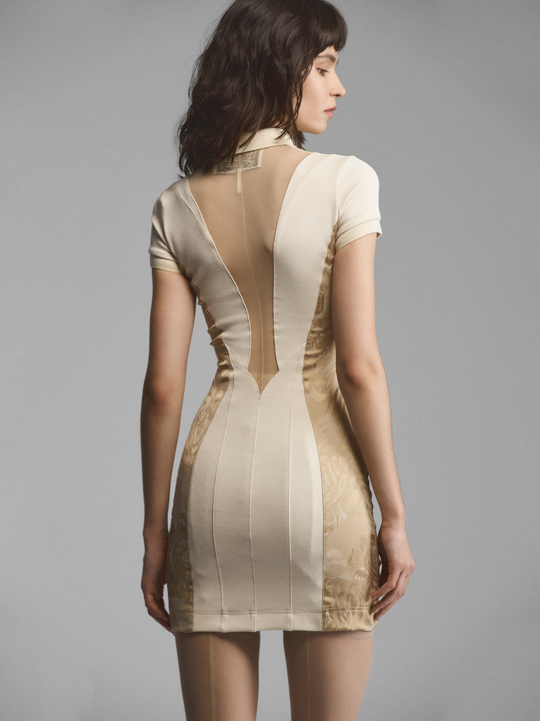Мультифактурное мини платье-поло. Сложный крой с вертикальными рельефами скульптурирует силуэт. Темные сатиновые вставки по бокам визуально стройнят, скрадывая объем. Иллюзию откровенности создает расстегнутая молния, сходящаяся под аккуратным воротником. Глубокое декольте в разрезе молнии и фигурный вырез на спине продублированы бежевой сеткой. Плотное облегание подчеркивает фигуру, длина мини открывает ноги. Феминная модель, сочетающая в себе спортивную и бельевую эстетики.