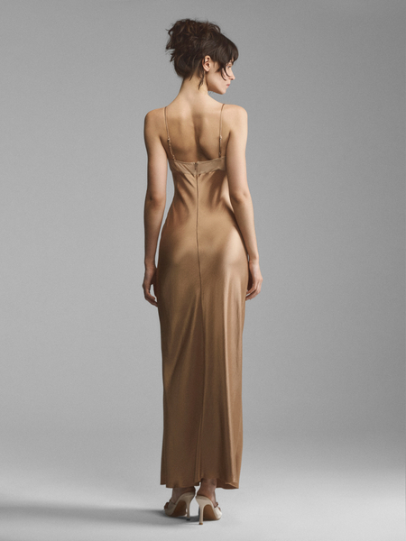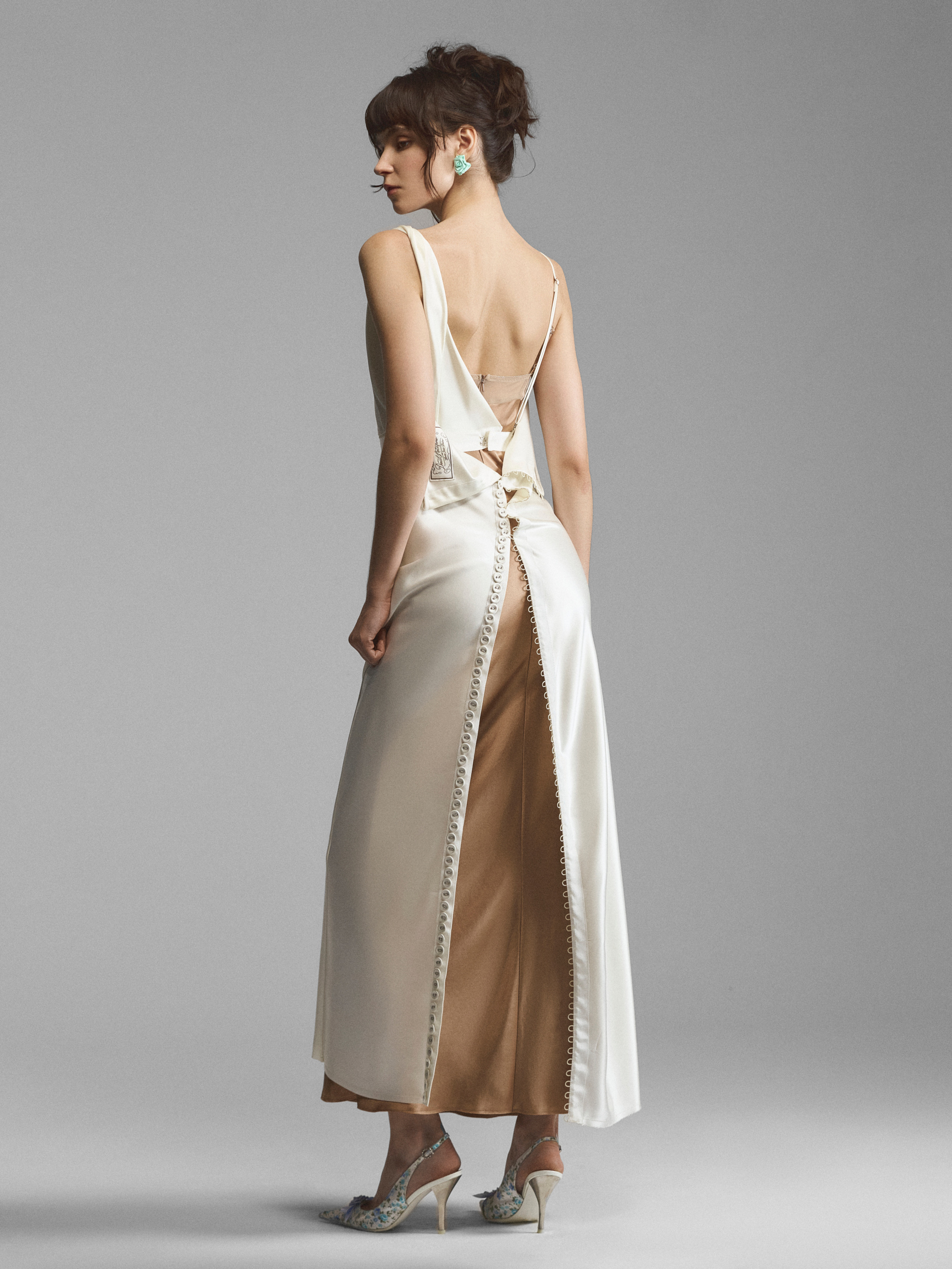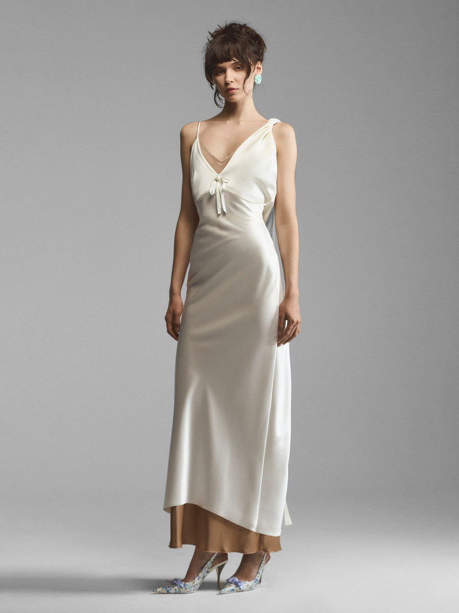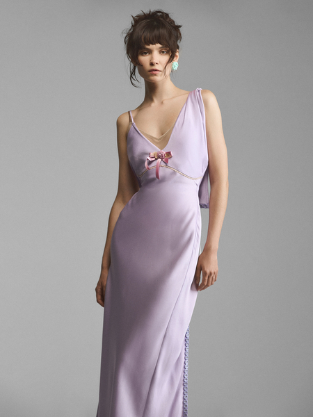 Шелковое платье с асимметричными бретелями и застежкой на спине. Полуприлегающий крой и телесный футляр позволяют материалу струиться по телу, повторяя его изгибы. Двойной лиф с плавными линиями чашек перекликается с широкой перекрученной лямкой на плече. Лиф украшен бельевым цветком с сатиновыми лентами. Открытая спина со сквозной застежкой формирует роскошный вид сзади, позволяя добиваться различной степени откровенности. Модель доступна в кремовом и сиреневом вариантах.