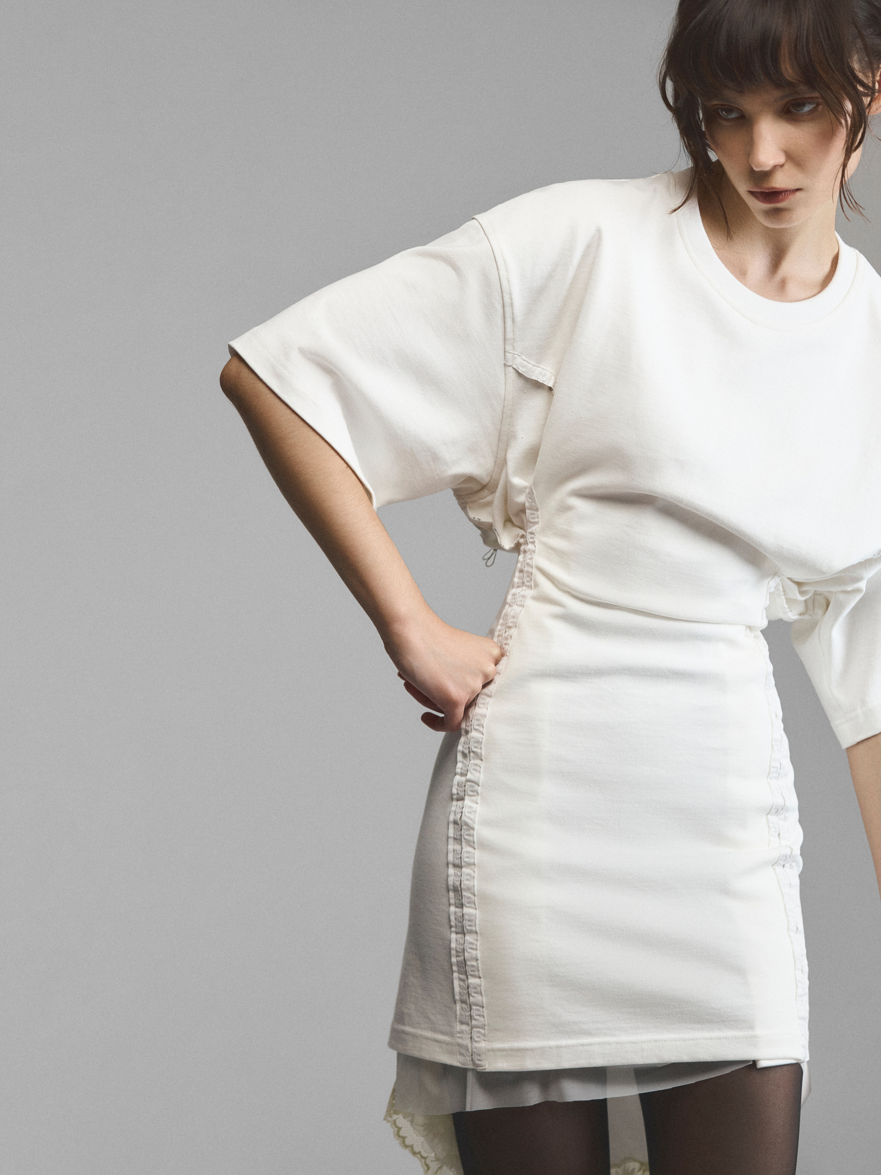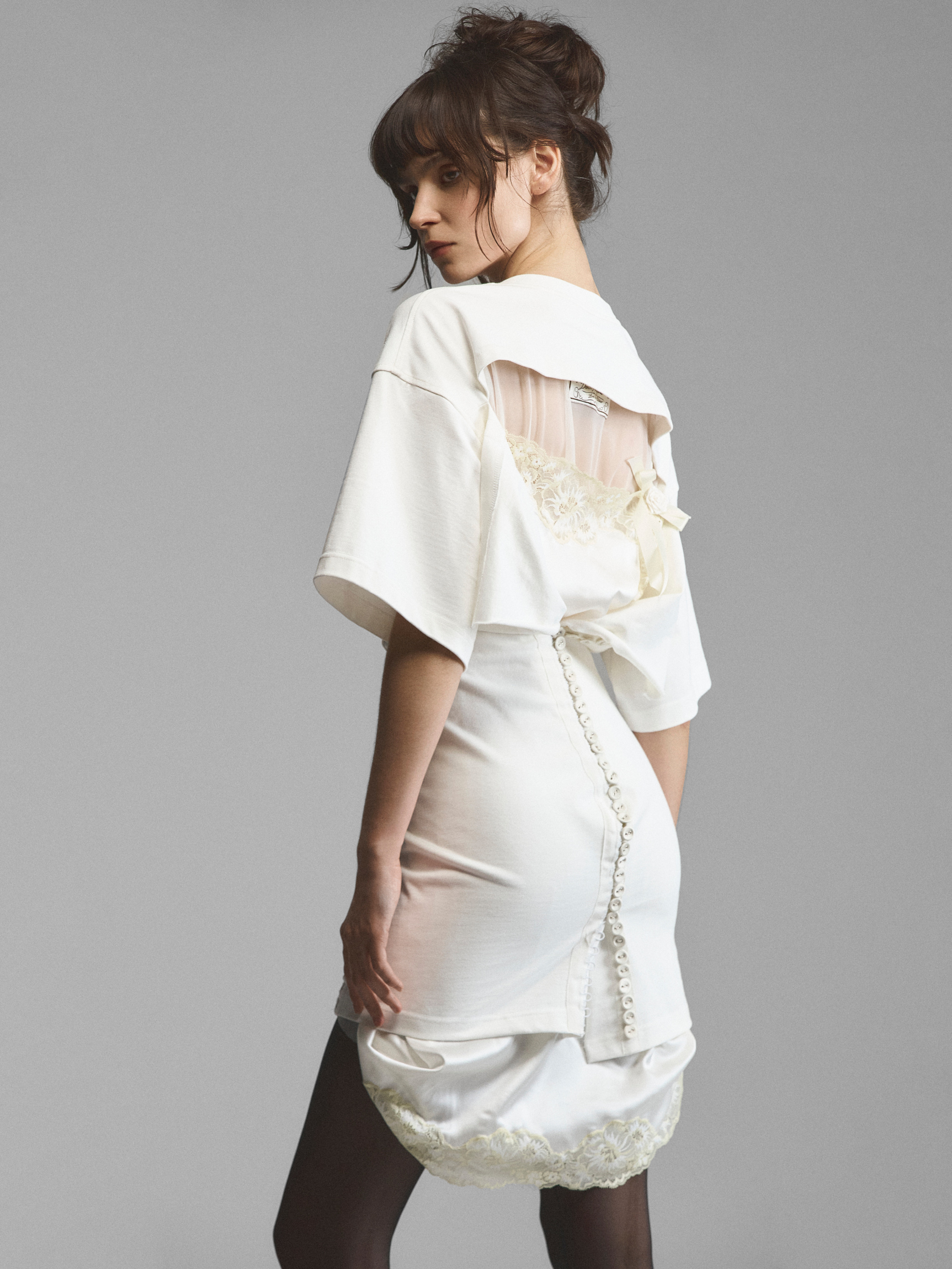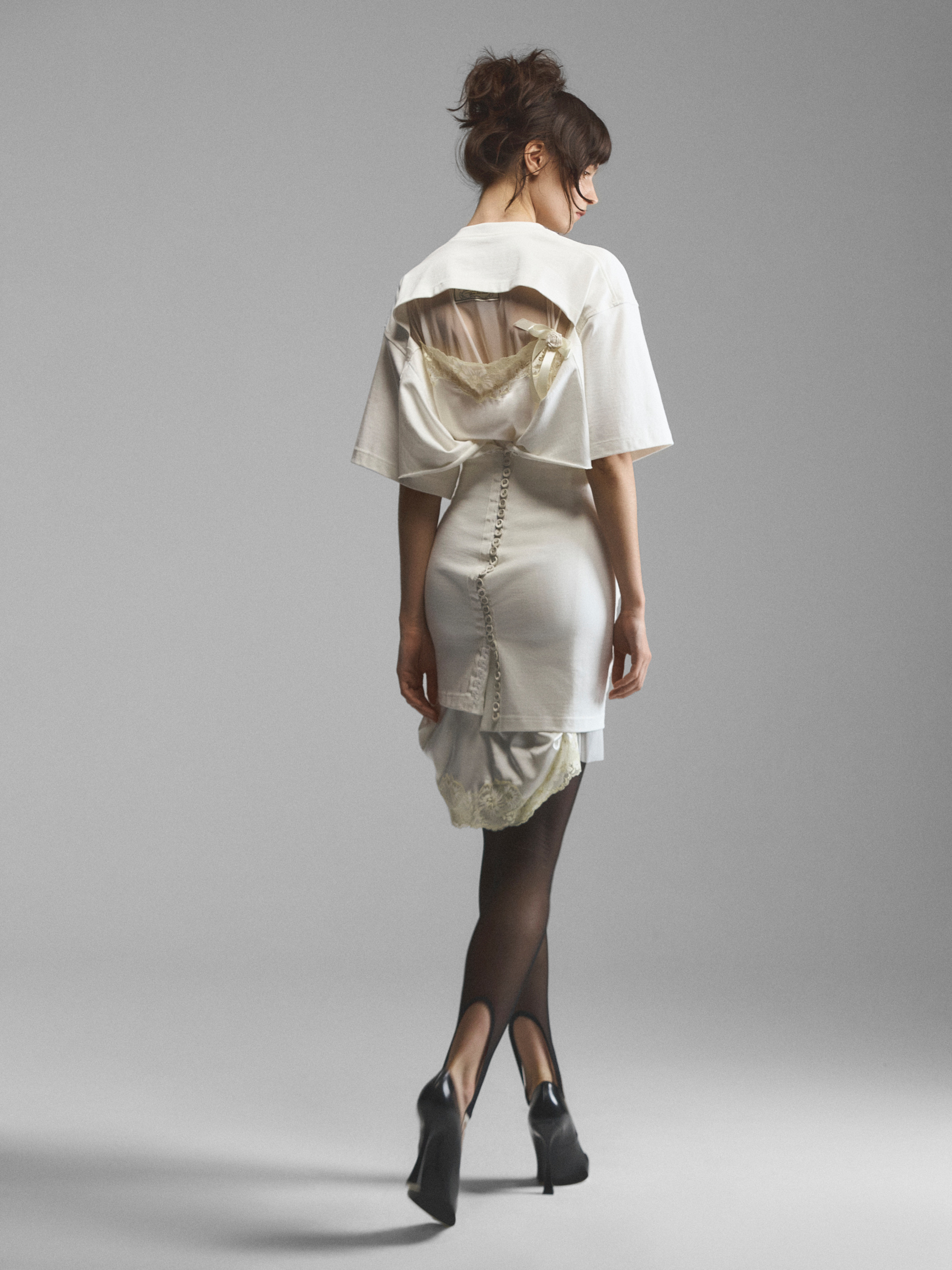 Платье-футболка с открытой спиной и бельевыми элементами. Конструкция предусматривает приталенный силуэт с акцентом на талии. Облегание по бедрам обеспечивает застежка на корсетные крючки сбоку. Центральный задний шов на юбке подчеркнут рядом пуговиц на воздушных петлях. Открытая спина с прозрачной вставкой и деталью шелковой сорочки делает образ чувственным. Асимметричный подол и драпировки создают динамику.