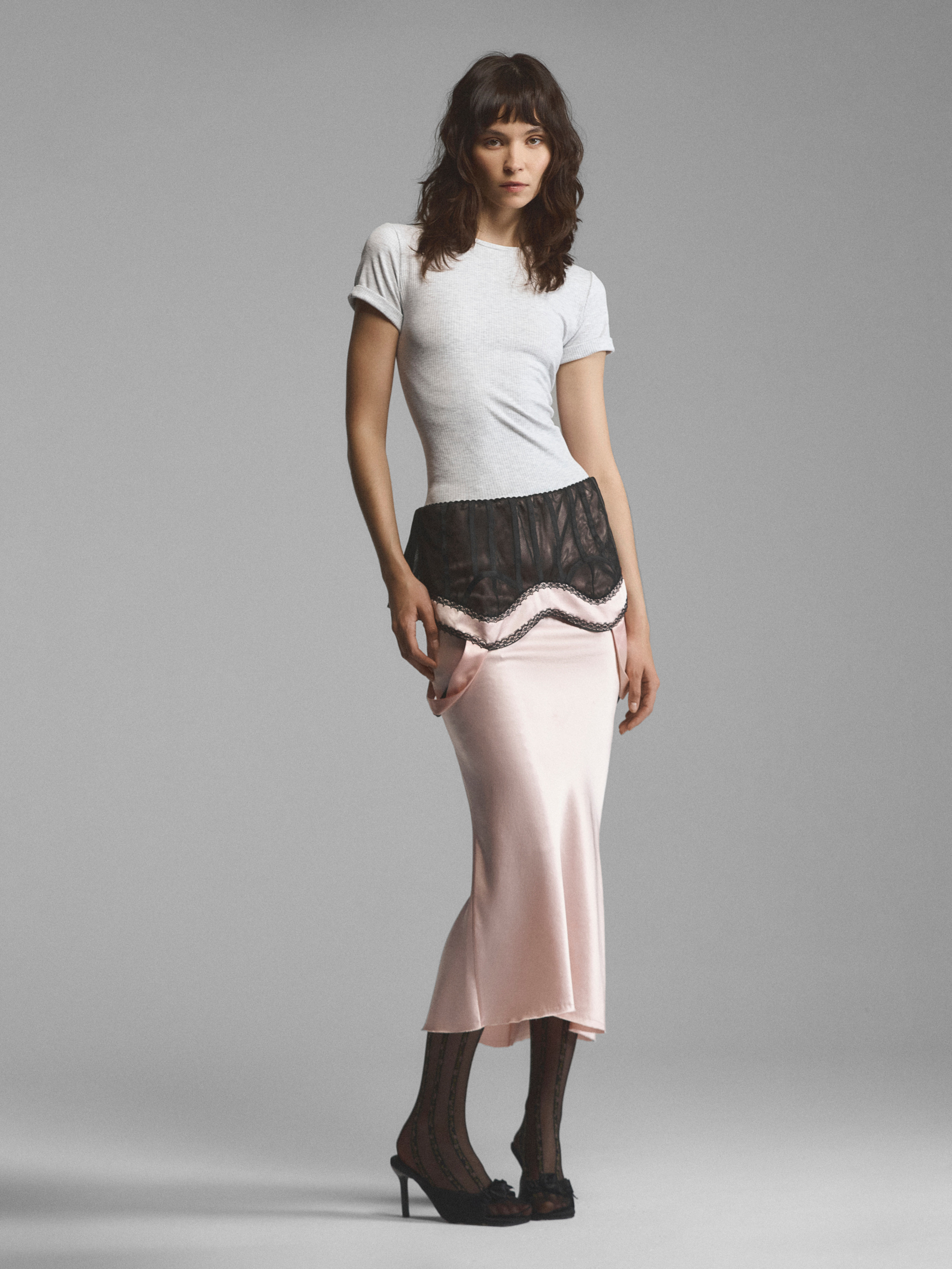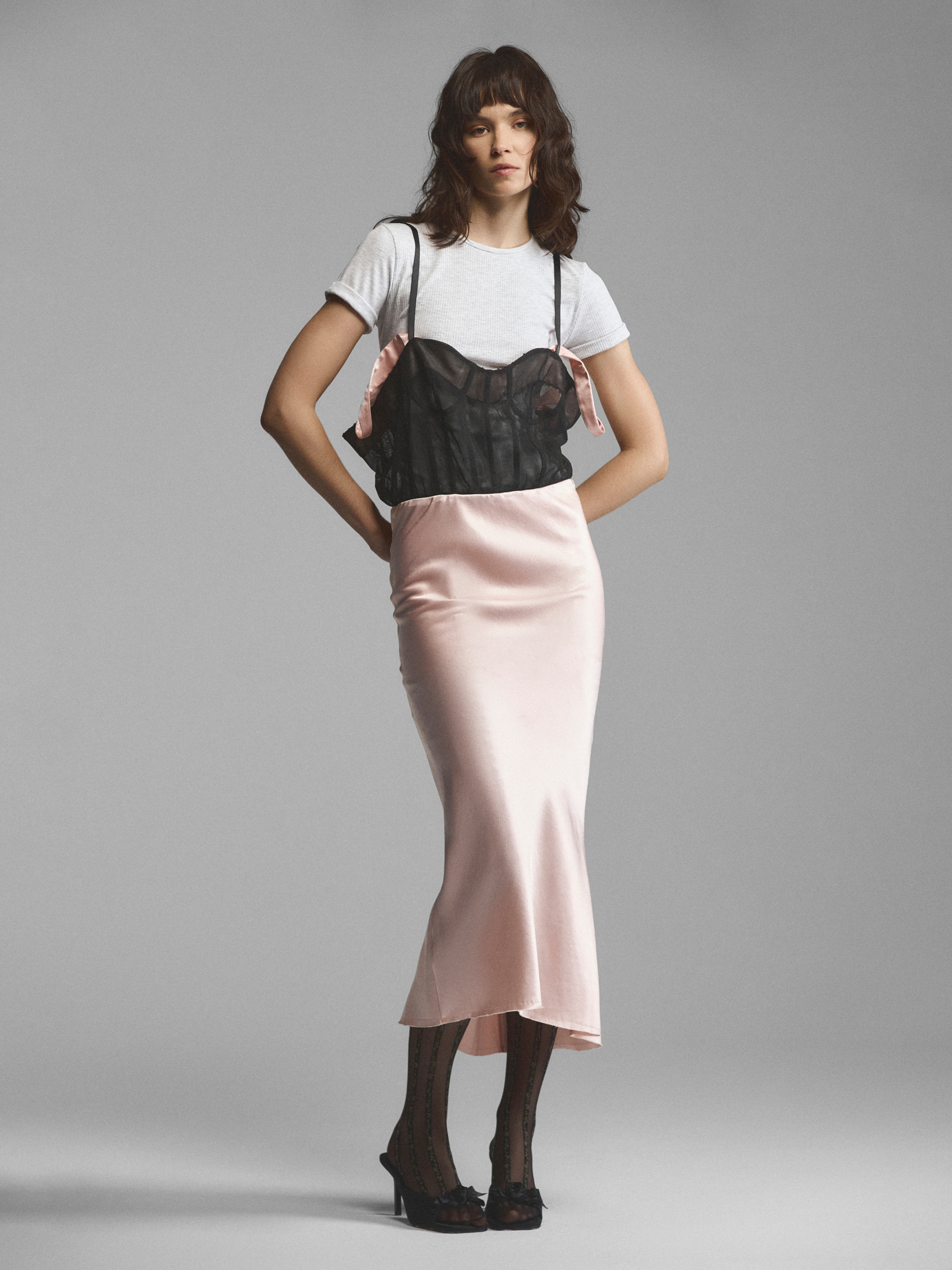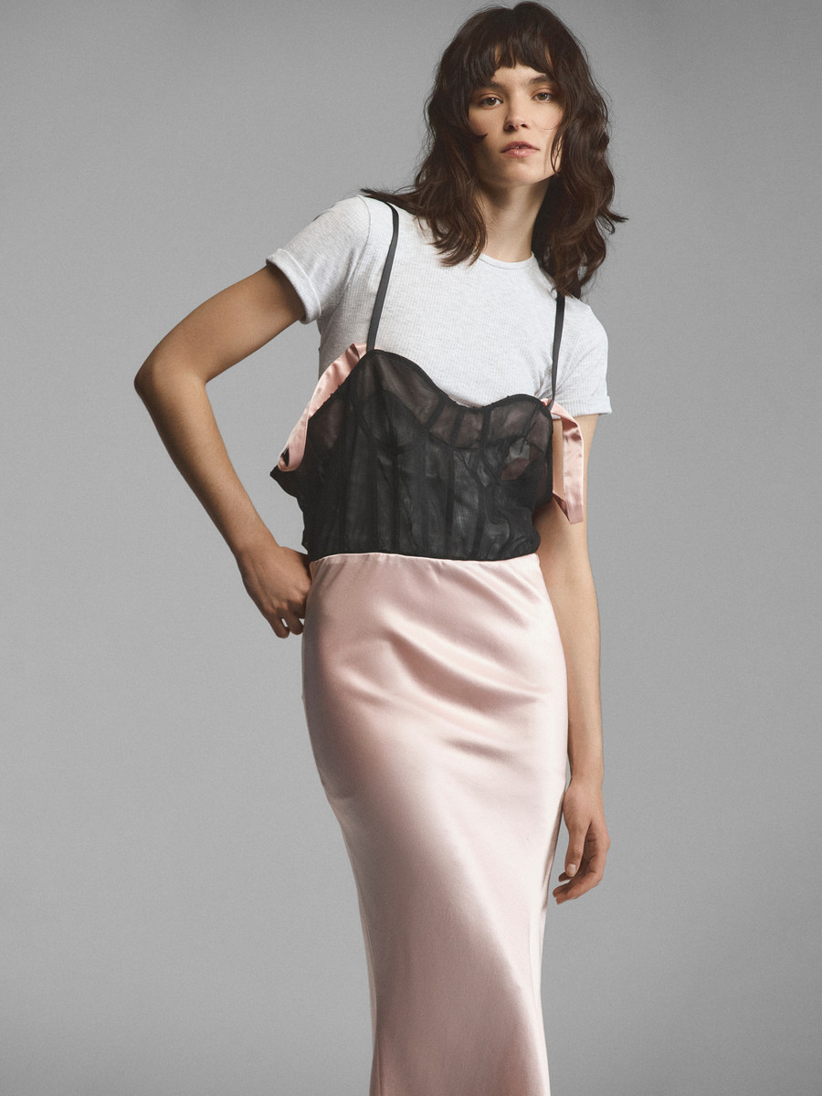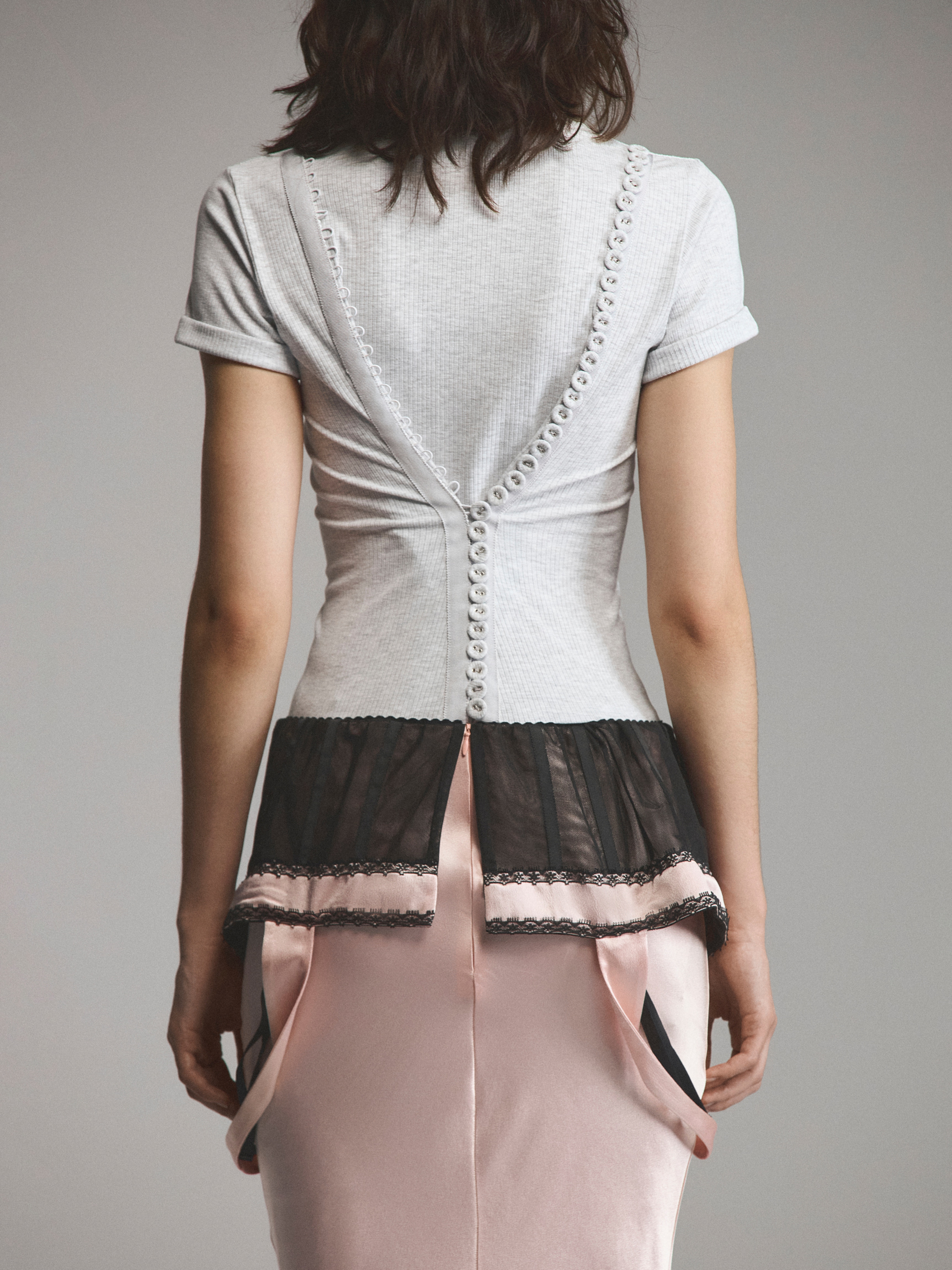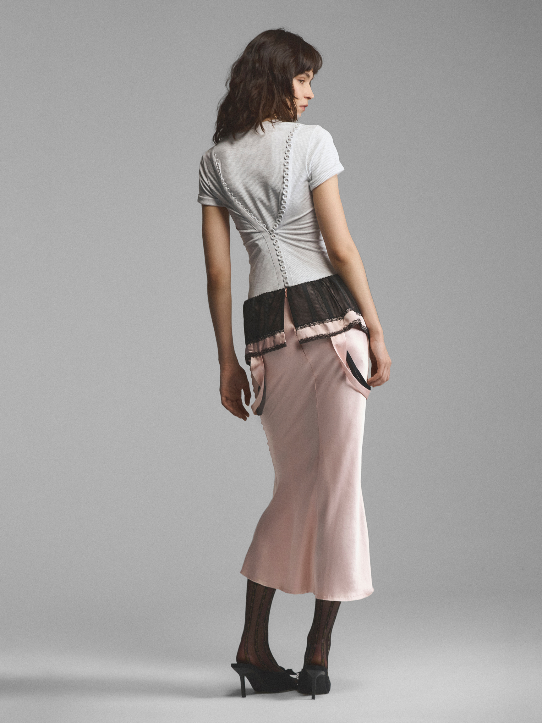 Платье с трикотажными лифом и сатиновой юбкой. Спину дополняет ряд мелких пуговиц на воздушных петлях, которые создают иллюзию декольте. Переход от лифа к юбке дополнен декоративным отворотом, который имитирует изнанку снятого платья. Спущенные широкие бретели и край отворота обработаны сатиновой лентой. Контрастная черная сетка с рельефами, характерная для корсетных изделий, создает впечатление настоящей изнанки. Неожиданное сочетание разных по фактуре, свойствам и цвету материалов формирует дуальность этого образа.
