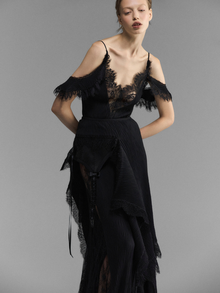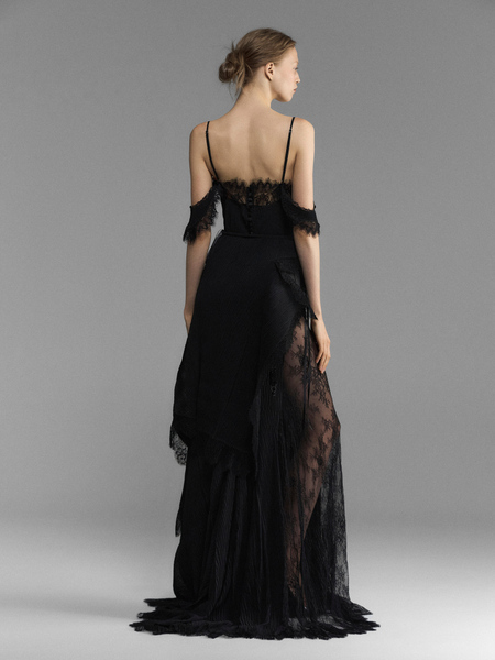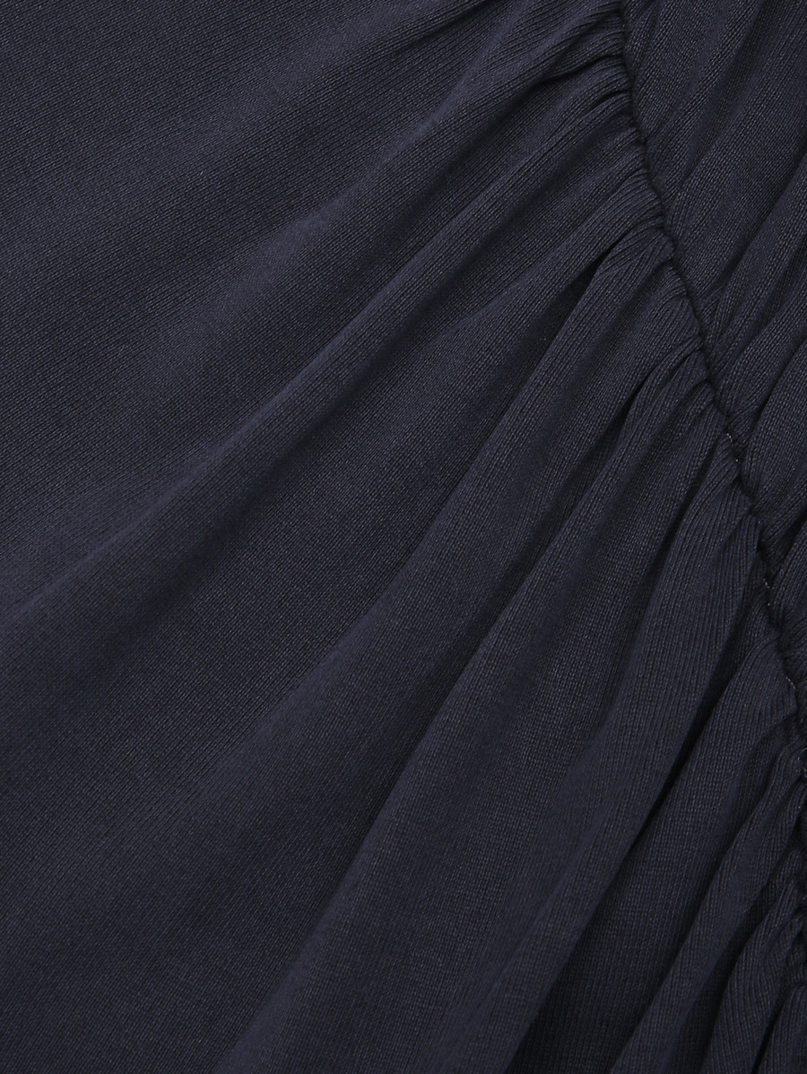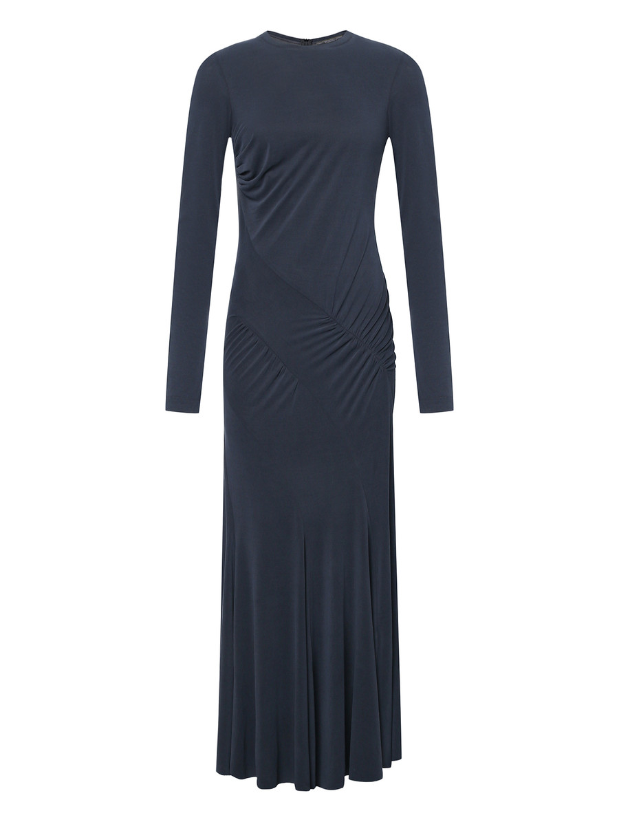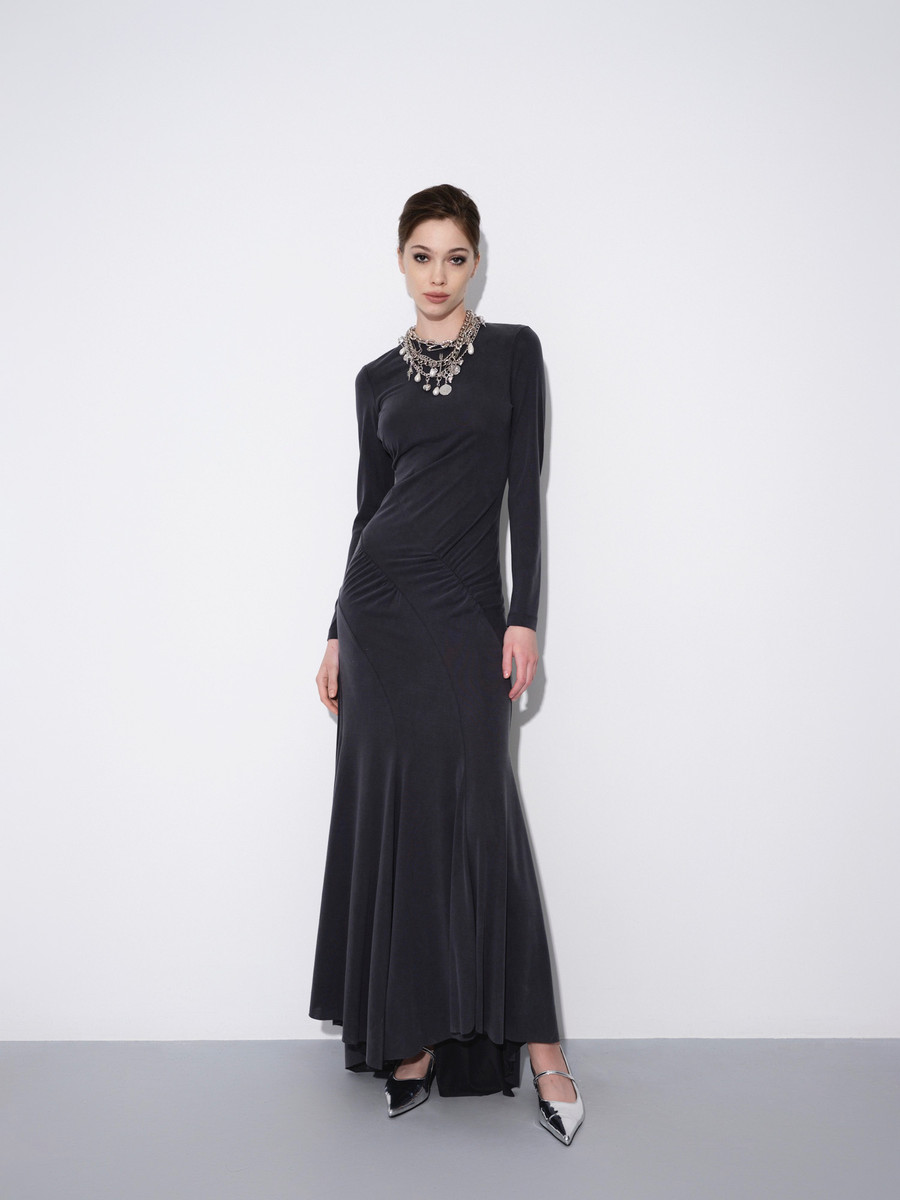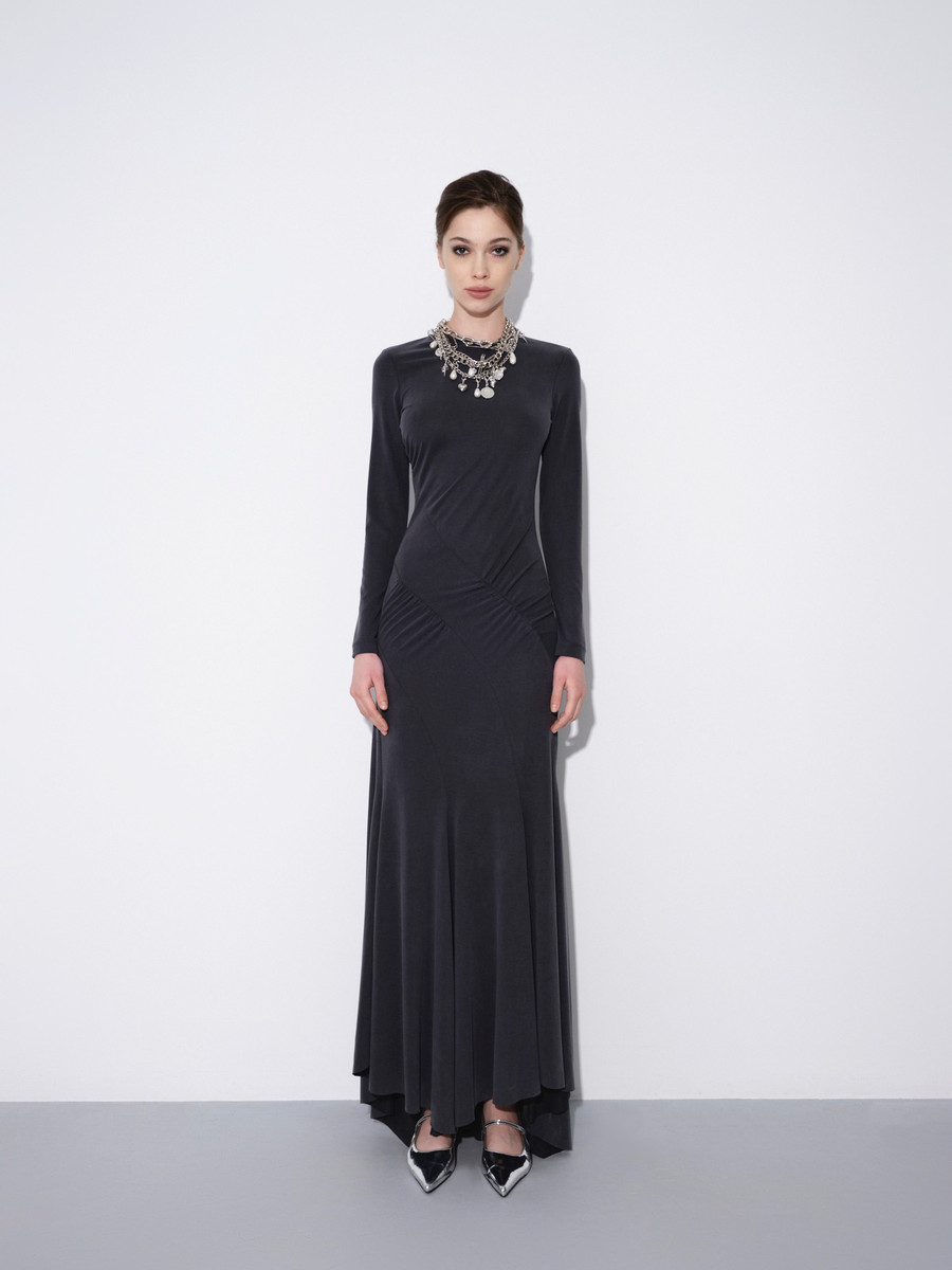 Минималистичное трикотажное платье-макси из модала. Декоративные линии спиралью обвивают фигуру и за счет конструктивного решения подчеркивают изгибы, создавая динамичный силуэт