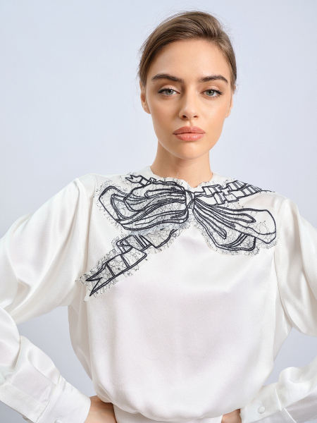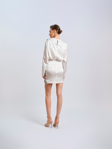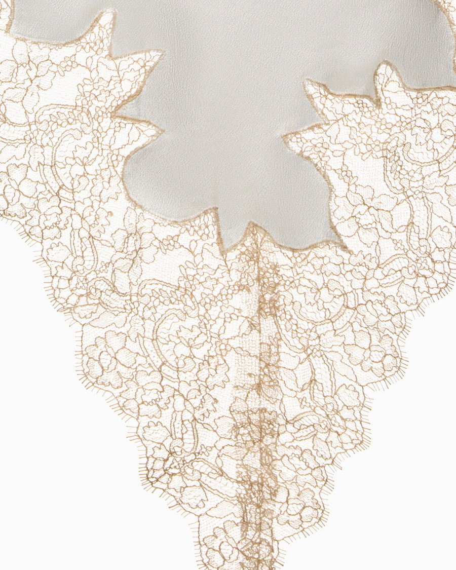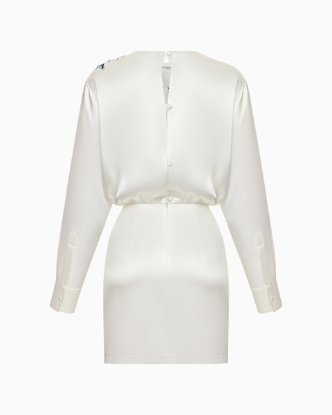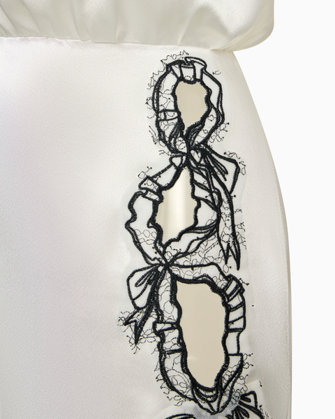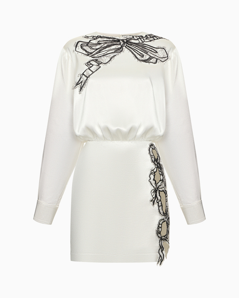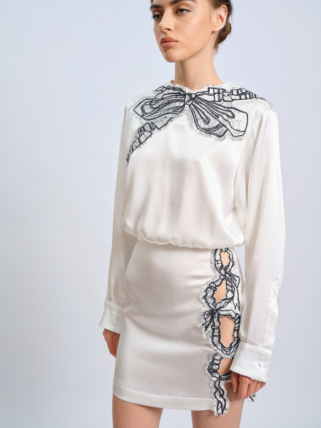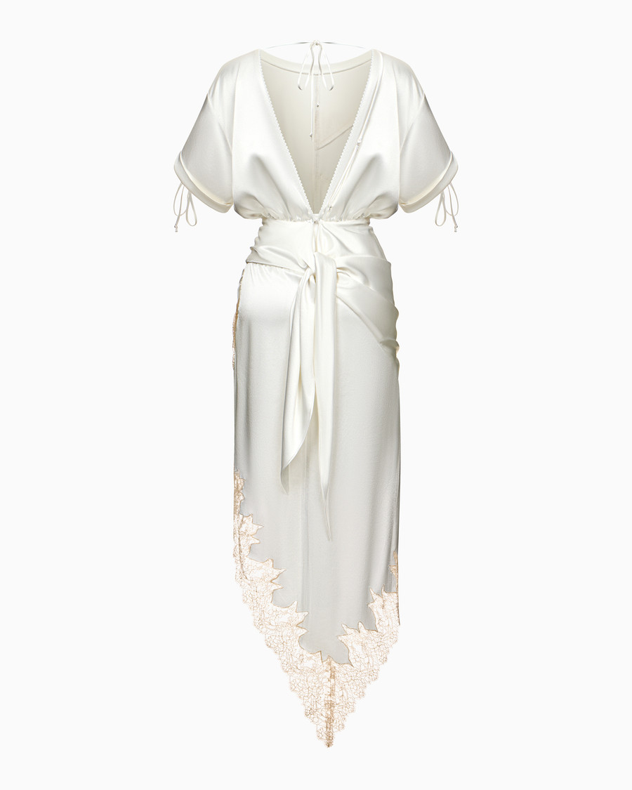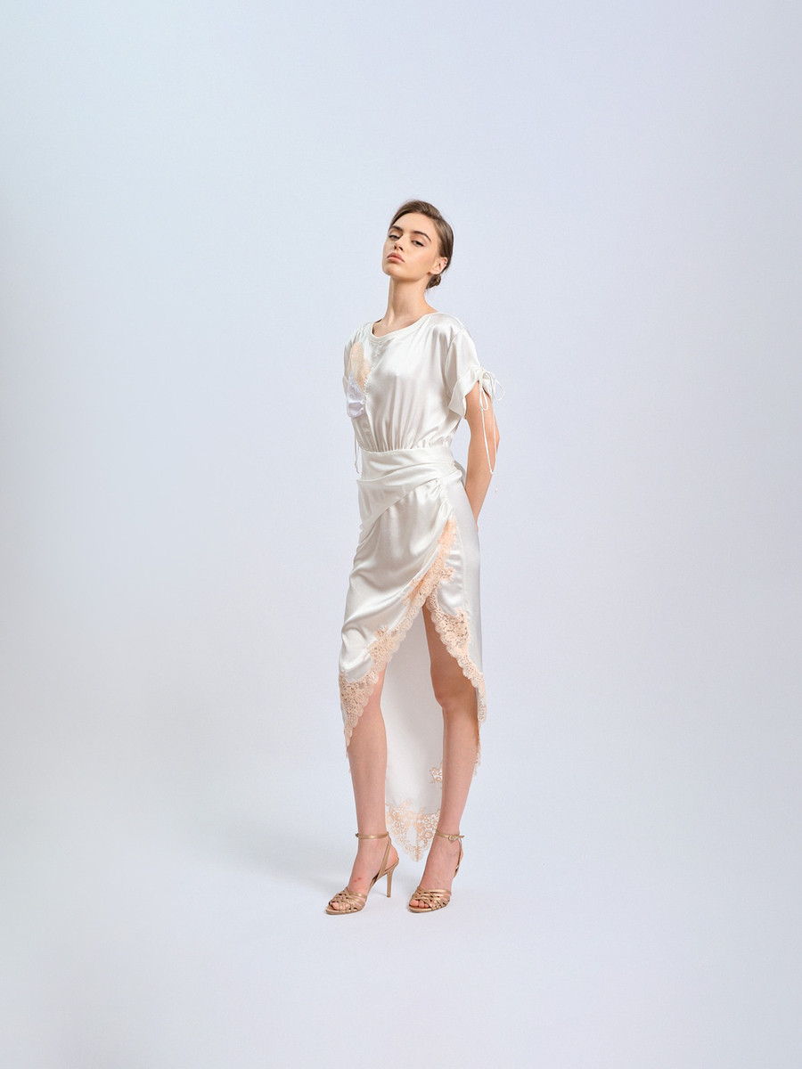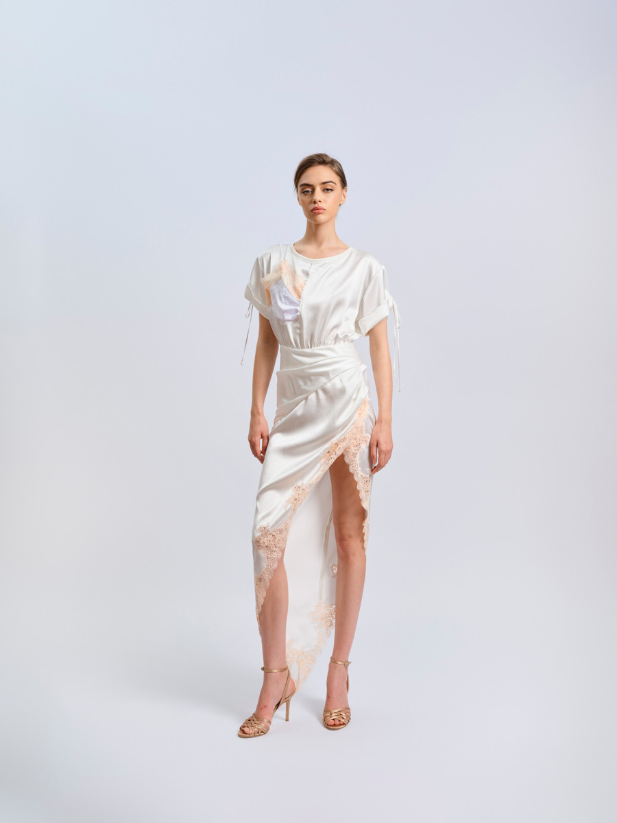 Отстроченная бельевая чашка и изящные кружевные вставки приоткрывают тайный флер интимности. Объемный пояс, ложащийся в мягкие драпировки на талии и бедрах, словно заключает силуэт в корсет. Ассиметричная юбка, игриво приоткрывает ногу, придавая всему образу изысканную дерзость.