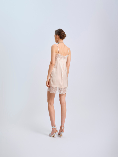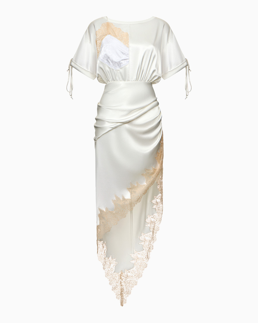Платье в бельевом стиле, достойное музы DA. Его асимметричный крой, будто нарушающий каноны, открывает новые горизонты красоты.