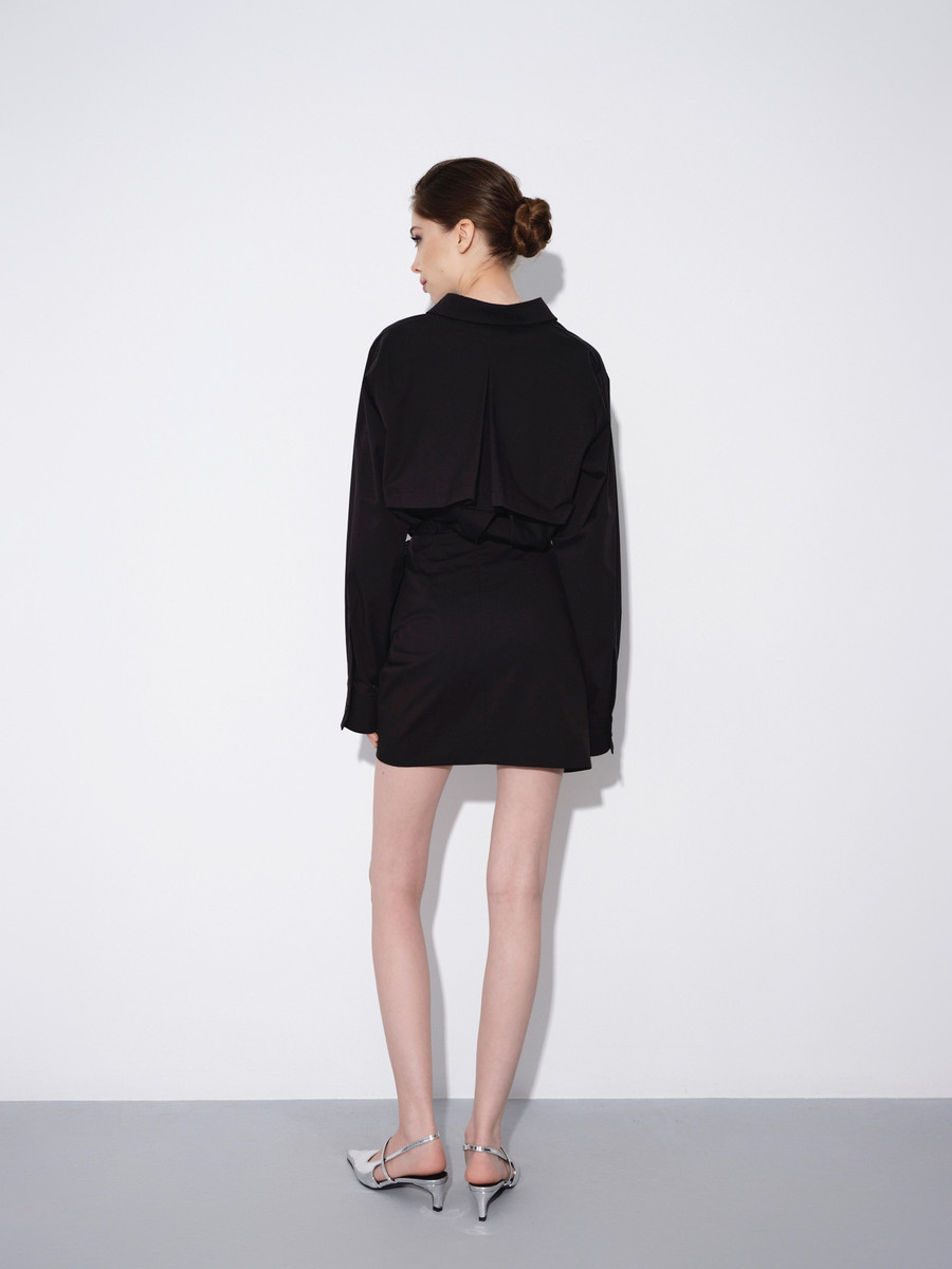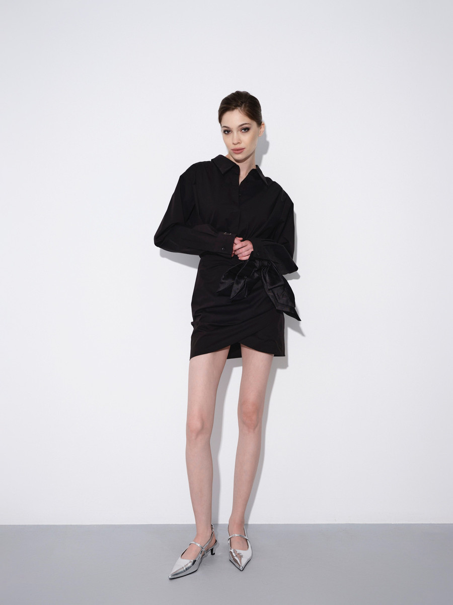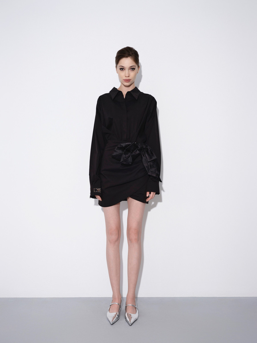 Бестселлер бренда - платье-рубашка мини из плотного черного хлопка. В этом сезоне дизайнер иронично интерпретирует стилизацию офисной сорочки, завершая ее брошью-бантом из галстуков В этом платье виртуозно объеденены раслабленность объемной рубашки и сексуальность приталенного мини.