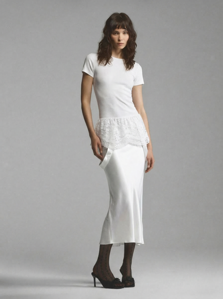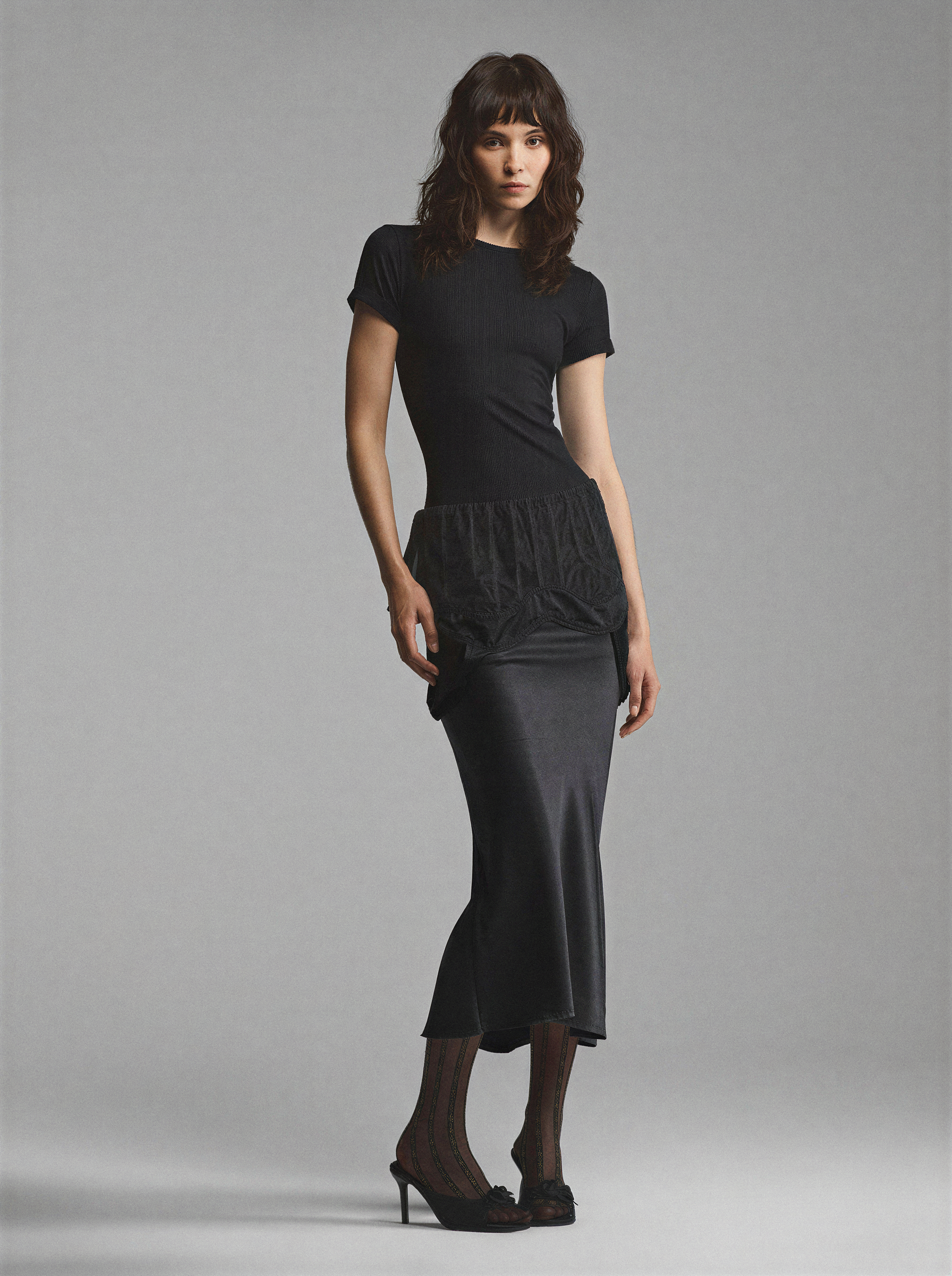 Платье с трикотажными лифом и сатиновой юбкой. Спину дополняет ряд мелких пуговиц на воздушных петлях, которые создают иллюзию декольте. Переход от лифа к юбке дополнен декоративным отворотом, который имитирует изнанку снятого платья. Спущенные широкие бретели и край отворота обработаны сатиновой лентой. Подкладочная сетка с рельефами, характерная для корсетных изделий, создает впечатление настоящей изнанки. Неожиданное сочетание разных по фактуре материалов формирует дуальность образа.