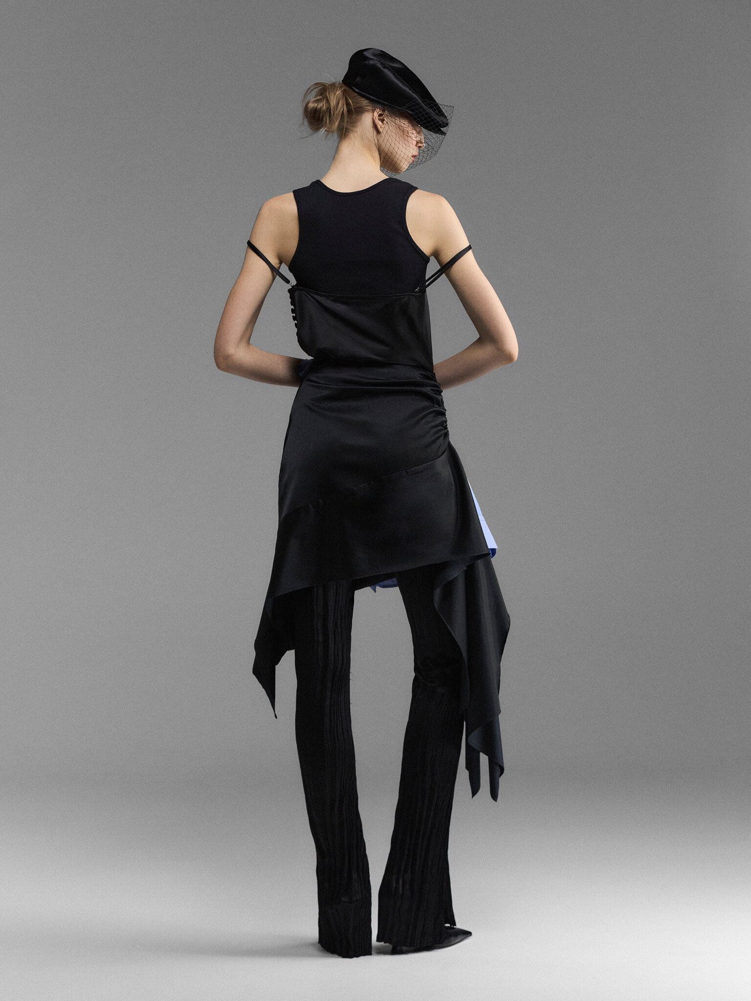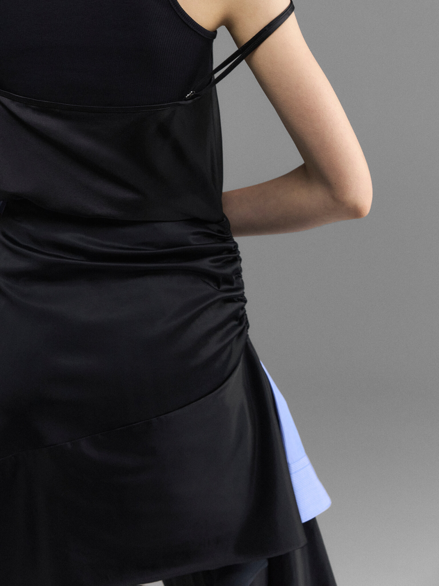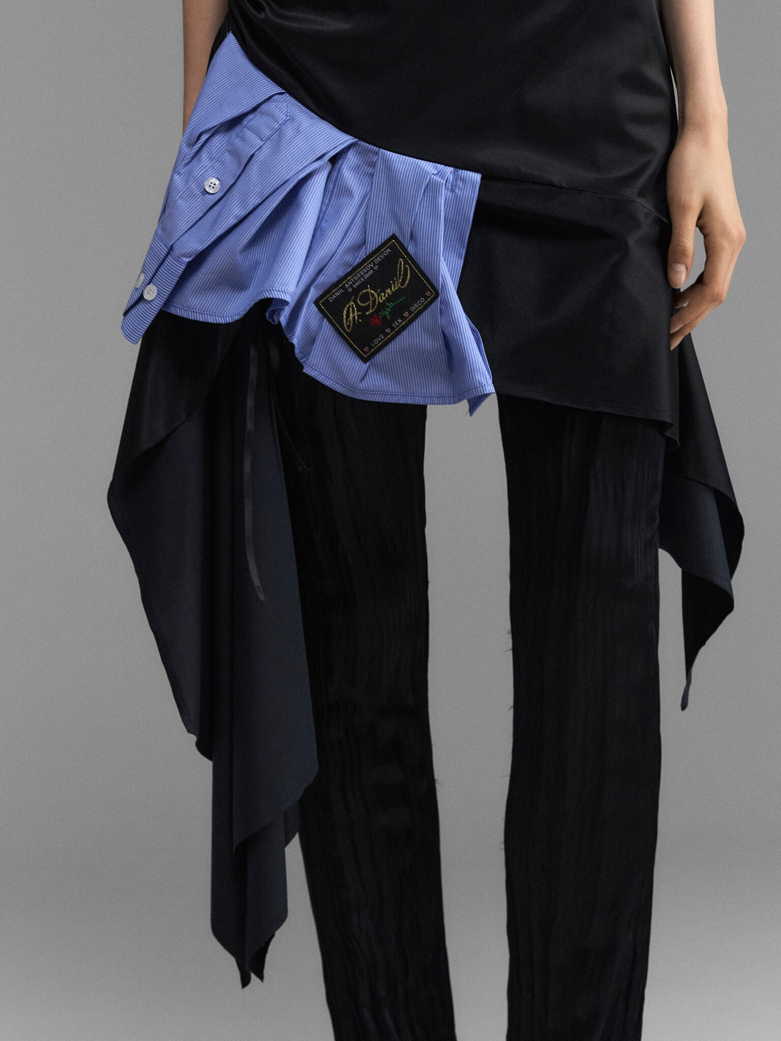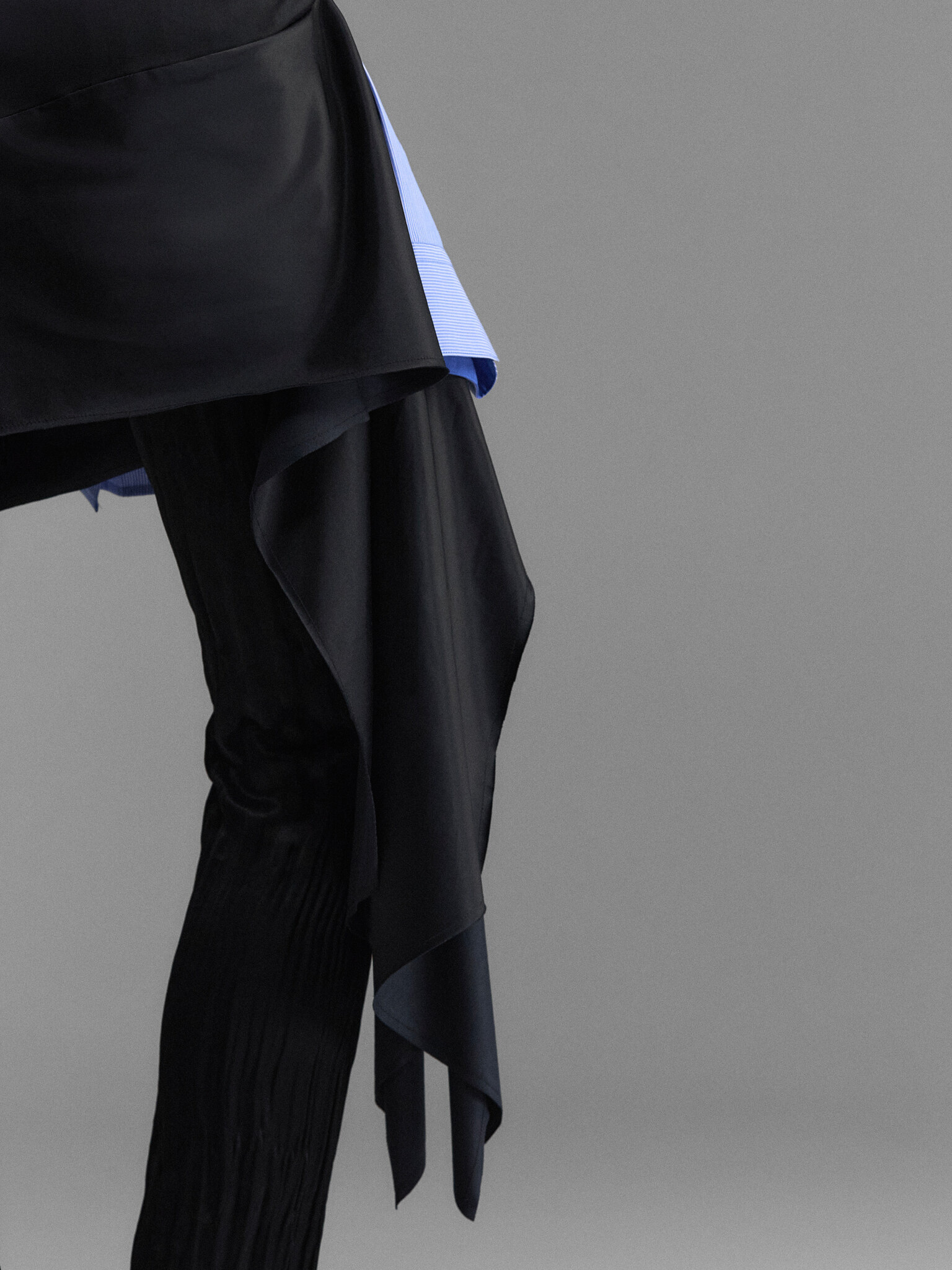 В юбке деструктивного кроя объединены классическая мужская рубашка и соблазнительный черный шелк. Кулиска на правом бедре формирует драпировку, острые асимметричные углы режут пропорции, создавая динамику движения. Притяжение противоположностей создает самый эффектный мэтч — все как в жизни. Носите с рубашкой, боди или корсетным лифом.