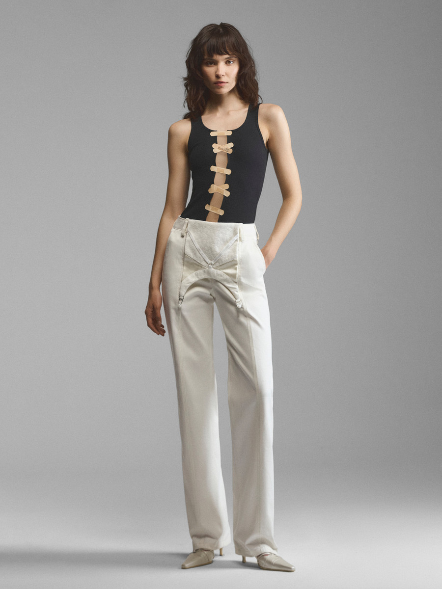 Трикотажный топ-майка с прозрачной вставкой. Полоска бежевой сетки создает иллюзию обнаженности, сохраняя за топом его функциональность. Лиф декоративно скрепляют бежевые брендовые стикеры в форме пластырей — ироничный акцент, привлекающий внимание к полупрозрачной вставке. Модель доступна в черном и сером вариантах.