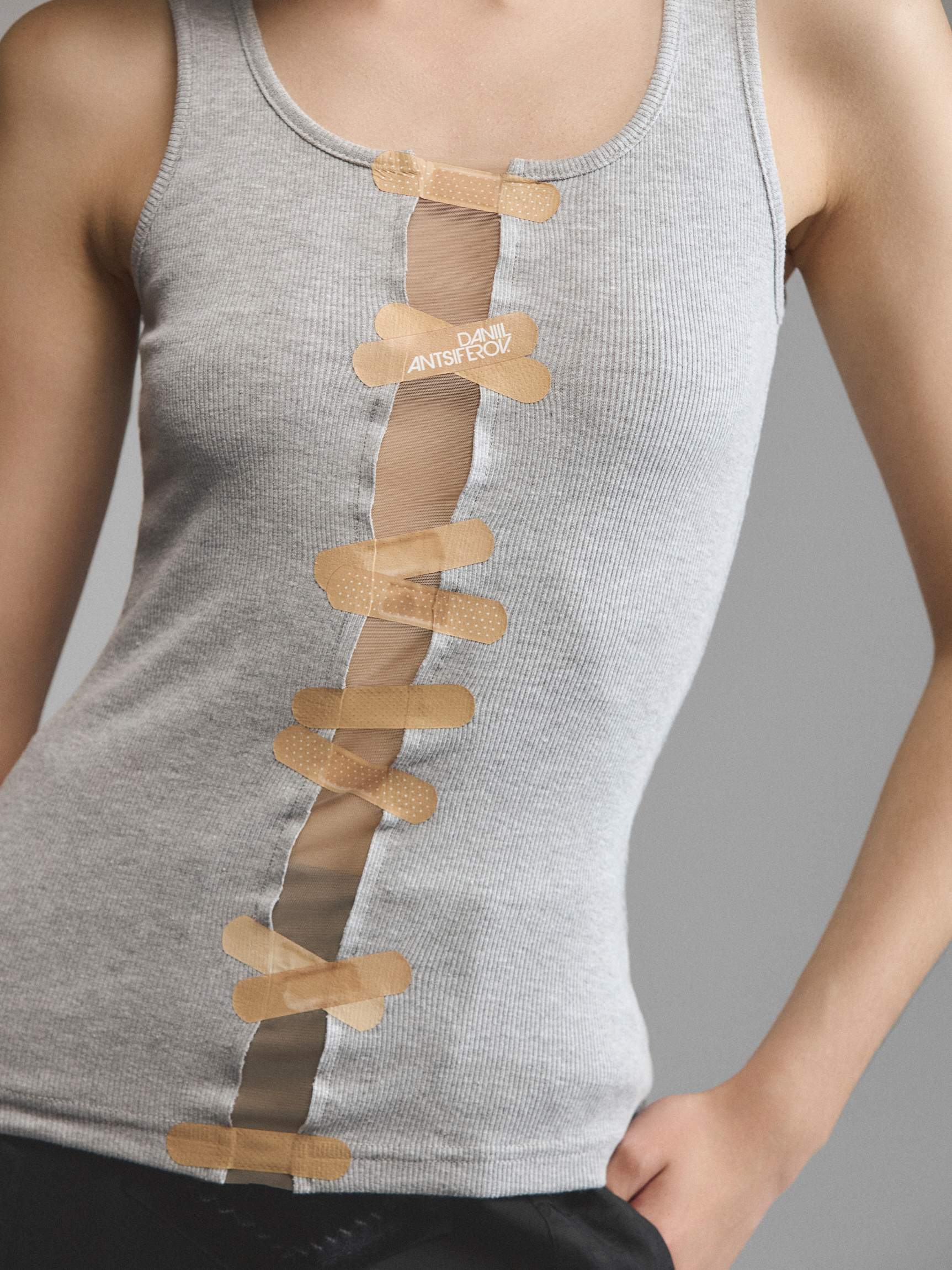 Трикотажный топ-майка с прозрачной вставкой. Полоска бежевой сетки создает иллюзию обнаженности, сохраняя за топом его функциональность. Лиф декоративно скрепляют бежевые брендовые стикеры в форме пластырей — ироничный акцент, привлекающий внимание к полупрозрачной вставке. Модель доступна в черном и сером вариантах.
