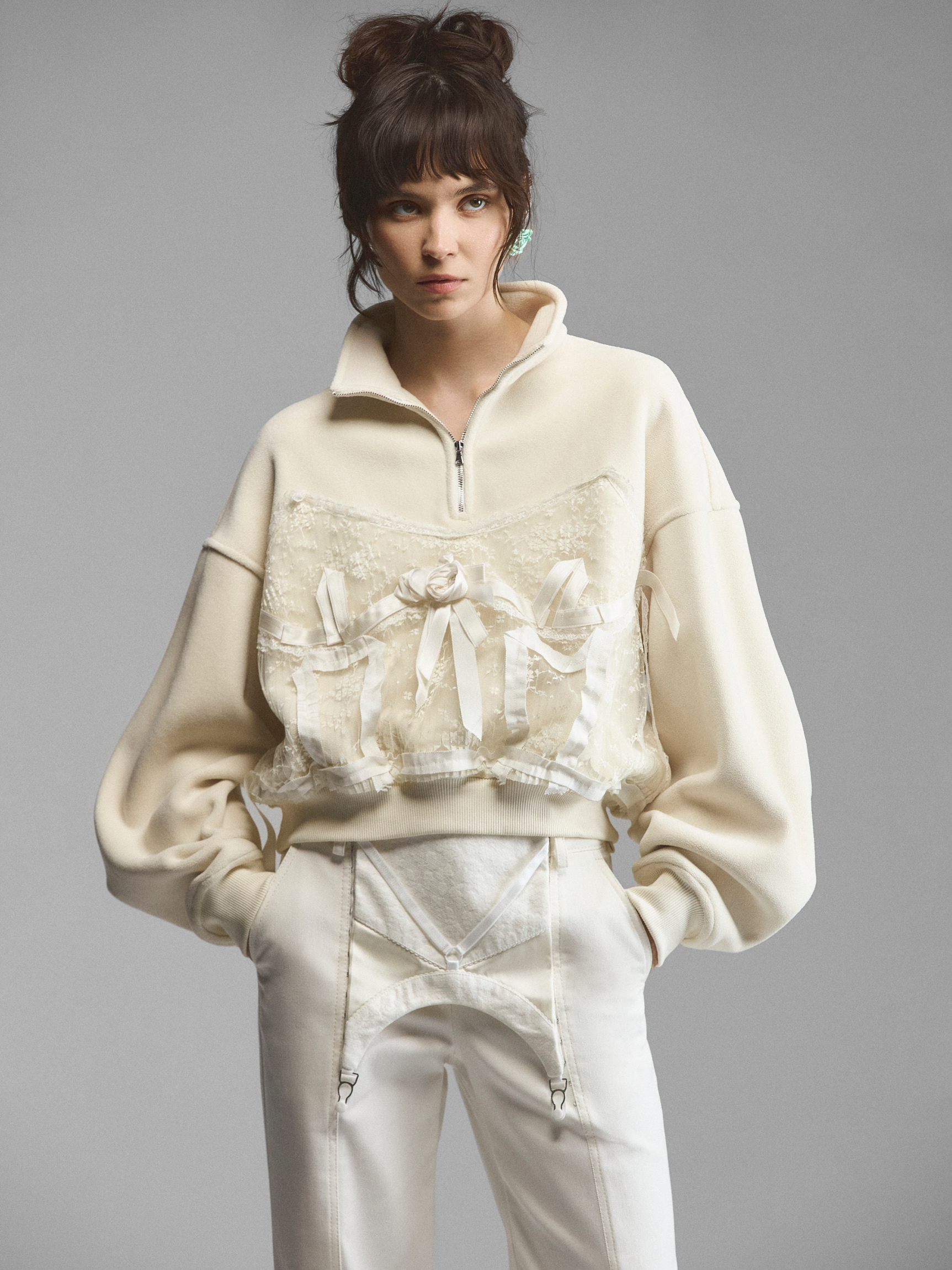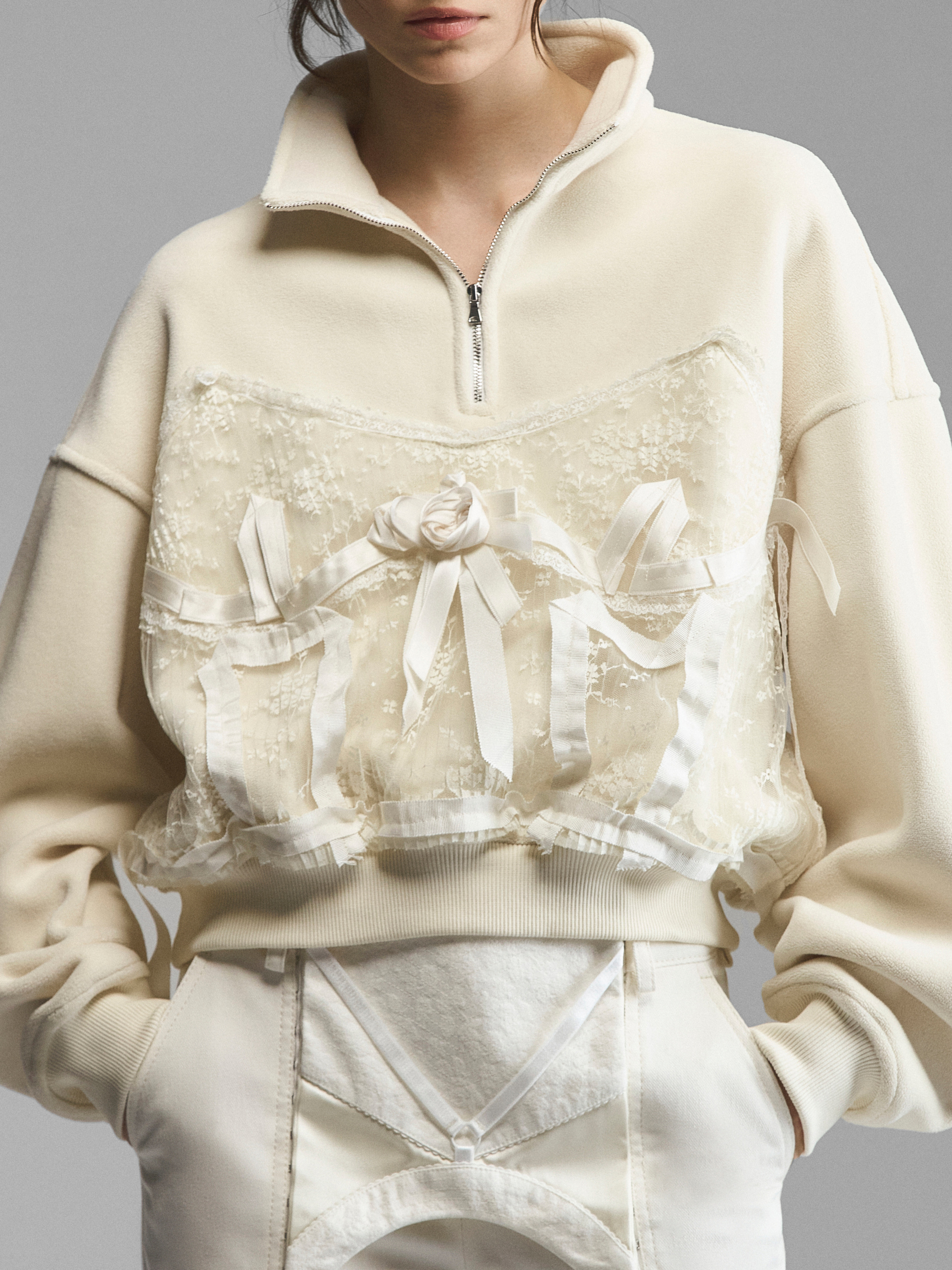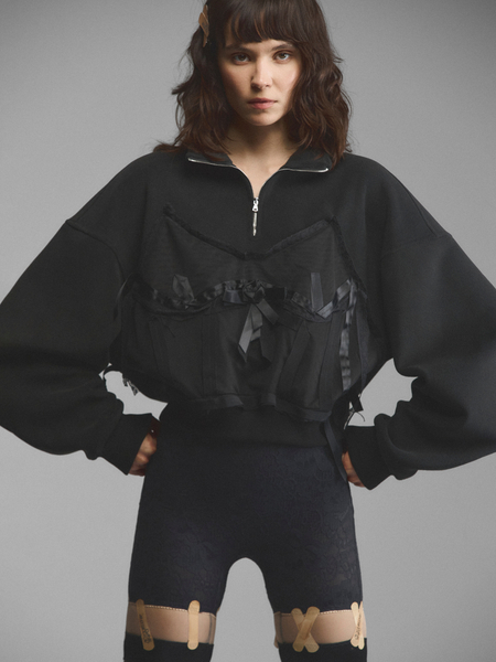 Объемный трикотажный свитшот со спущенным рукавом и декором в бельевом стиле. Широкие манжеты на рукавах и по низу поддерживают свободную форму модели. Лиф продублирован кружевом и вышит шелковыми лентами по линиям, повторяющим рельефы и чашки корсета. Крупная сатиновая роза акцентирует внимание на лифе. Сочетание спортивного и бельевого создает интересный контраст и дуальность образа. Свитшот доступен в кремовом и черном вариантах.