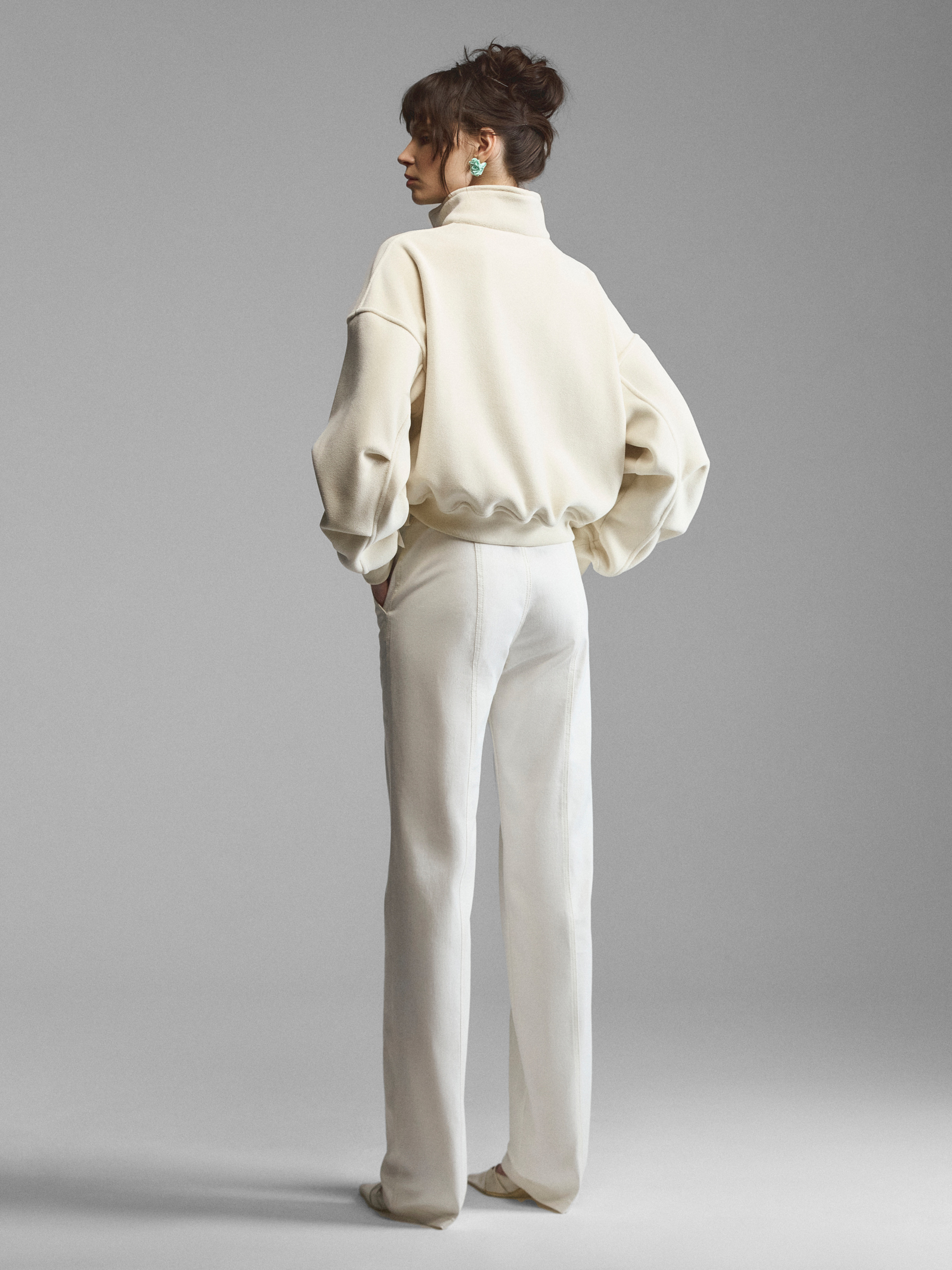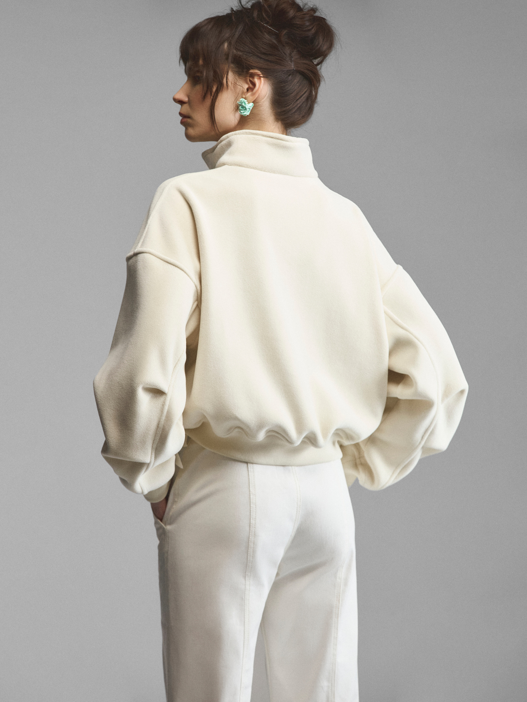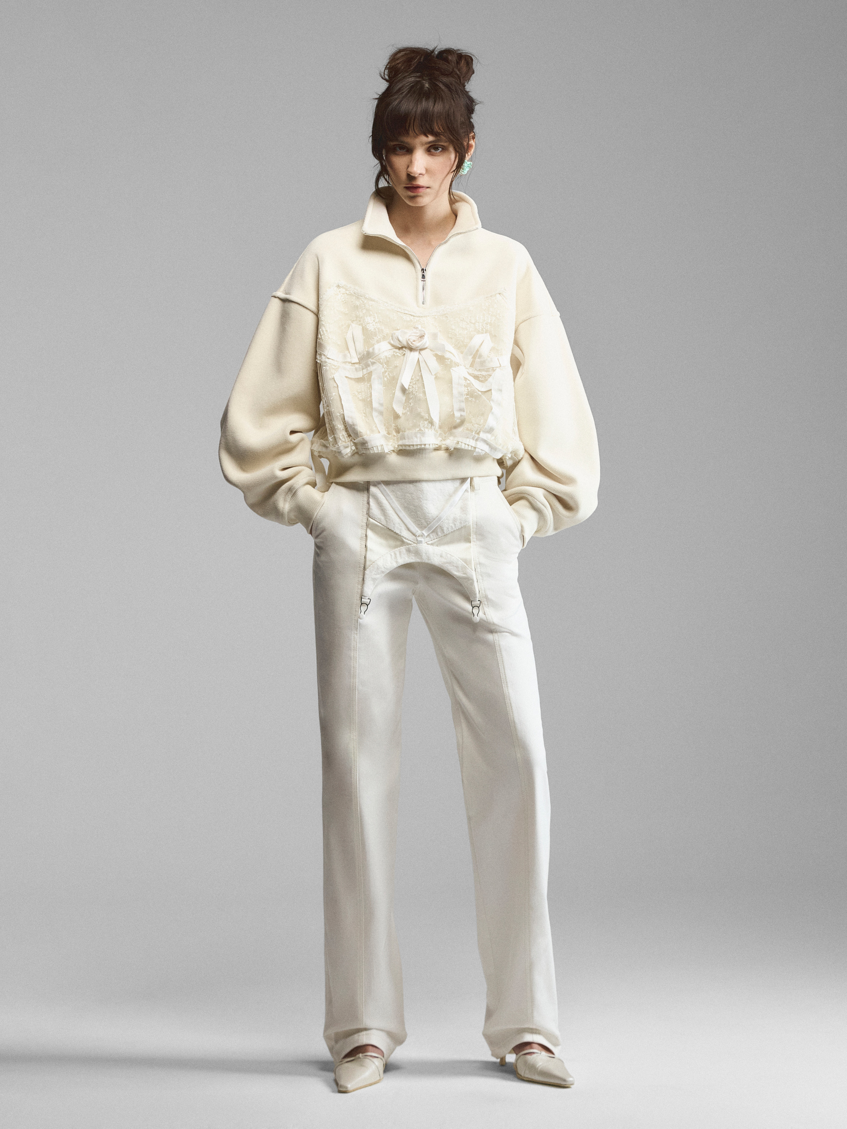 Объемный трикотажный свитшот со спущенным рукавом и декором в бельевом стиле. Широкие манжеты на рукавах и по низу поддерживают свободную форму модели. Лиф продублирован кружевом и вышит шелковыми лентами по линиям, повторяющим рельефы и чашки корсета. Крупная сатиновая роза акцентирует внимание на лифе. Сочетание спортивного и бельевого создает интересный контраст и дуальность образа. Свитшот доступен в кремовом и черном вариантах.