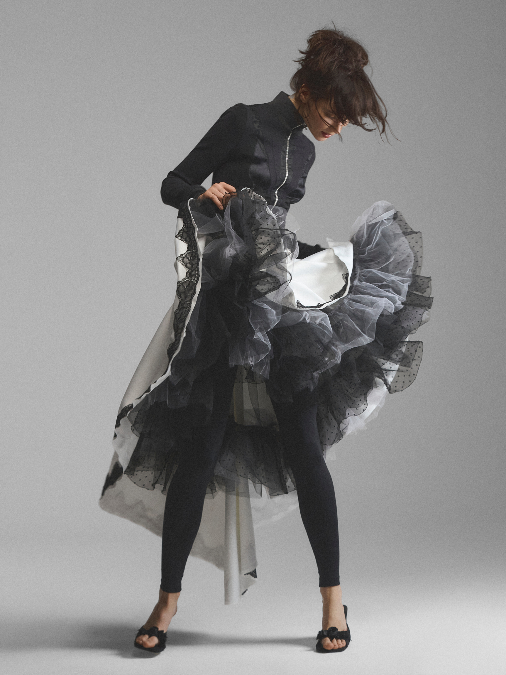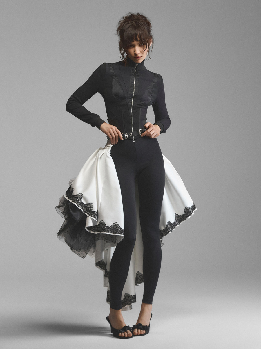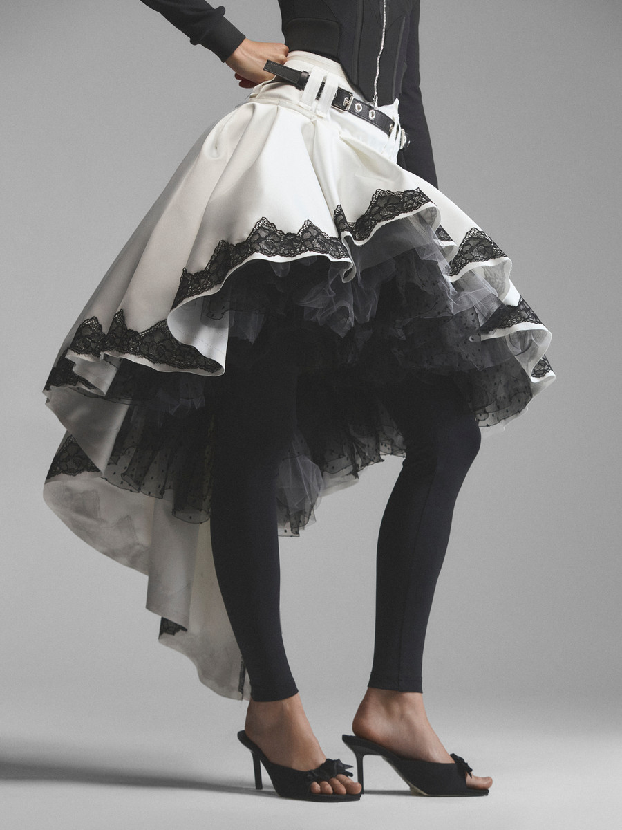 Пышная юбка со шлейфом и жесткой фатиновой пачкой. Плотный сатин основы заложен мягкими глубокими складками у пояса. Широкая кокетка облегает бедра, подчеркивая фигуру. Крупные двойные шлевки с контрастным ремнем выделяют линию бедра. Асимметричный подол декорирован широким кружевом поверх светлой основы. Пачка из фатина в мелкий горошек создает драматичный объем.