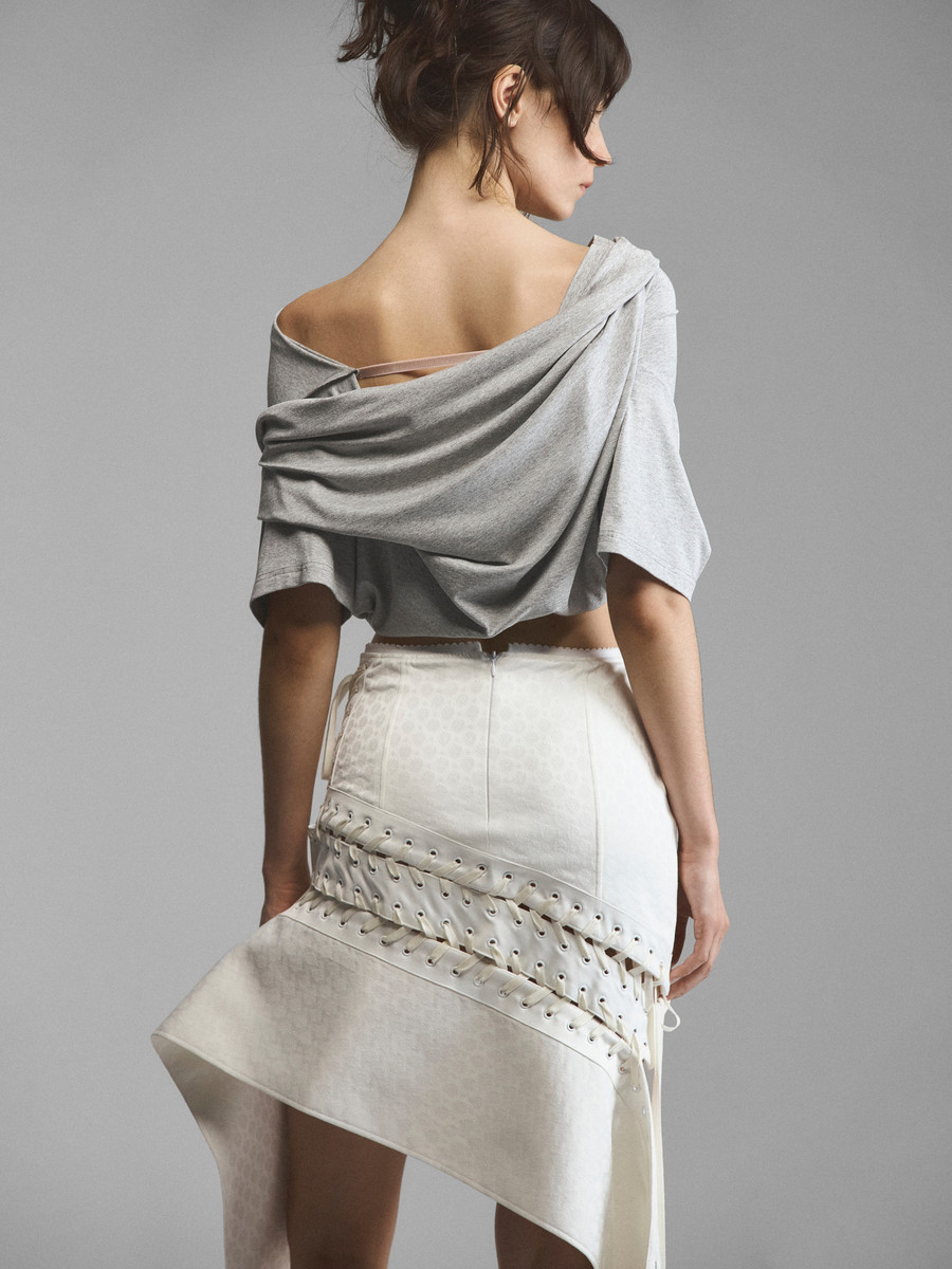 Юбка сложного кроя с корсетными элементами. Подчеркивает бедра благодаря вертикальным рельефным линиям и бельевой резинке с фигурным краем. Асимметричный подол крепится к основе двойной корсетной шнуровкой, которую можно распустить до нужного вам уровня. Диагональный наклон подола словно обвивает ноги, спускаясь к одному колену максимальной длиной. Свободные края шнурков создают динамику в движении, покачиваясь при каждом шаге. Плотный материал с жаккардовой фактурой держит форму, подчеркивая сложность кроя.