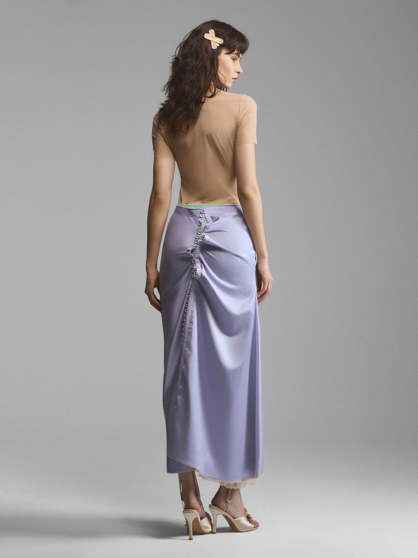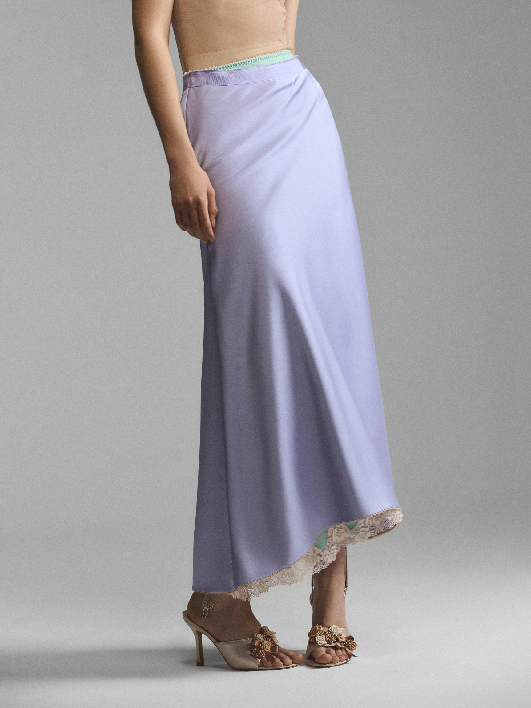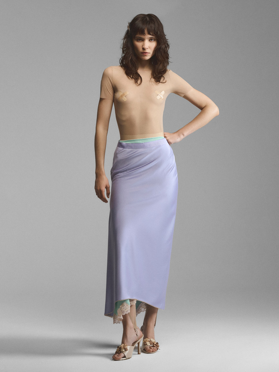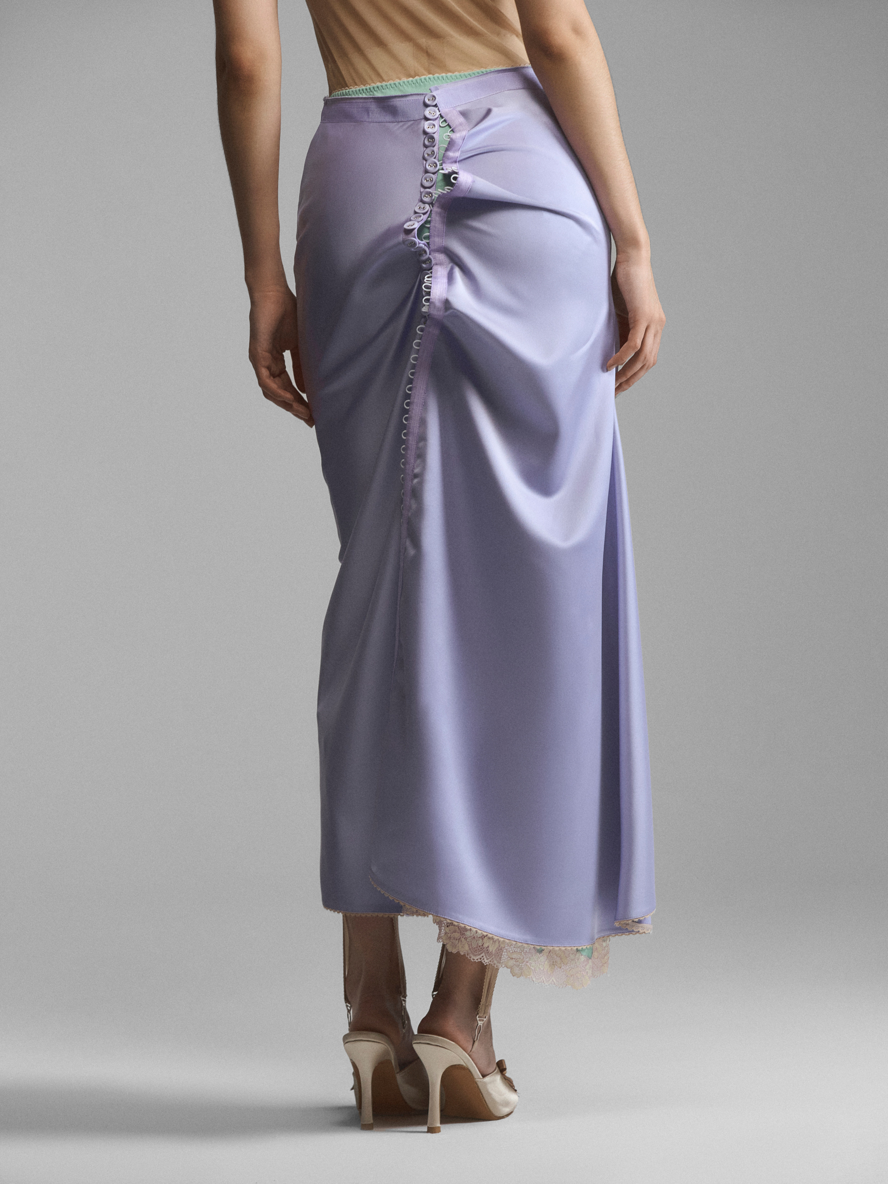 Двухслойная юбка со сквозной застежкой на воздушных петлях. Сочетание двух оттенков ткани создает иллюзию утреннего неглиже, надетого друг на друга. Асимметрично зафиксированная пола формирует крупные мягкие складки, рисунок которых можно менять, застегивая юбку по-другому. Нижний слой с кружевом и отлетной верхний спускаются до щиколоток, создавая красивые фалды при движении. Модель доступна в кремовом и сиреневом вариантах.