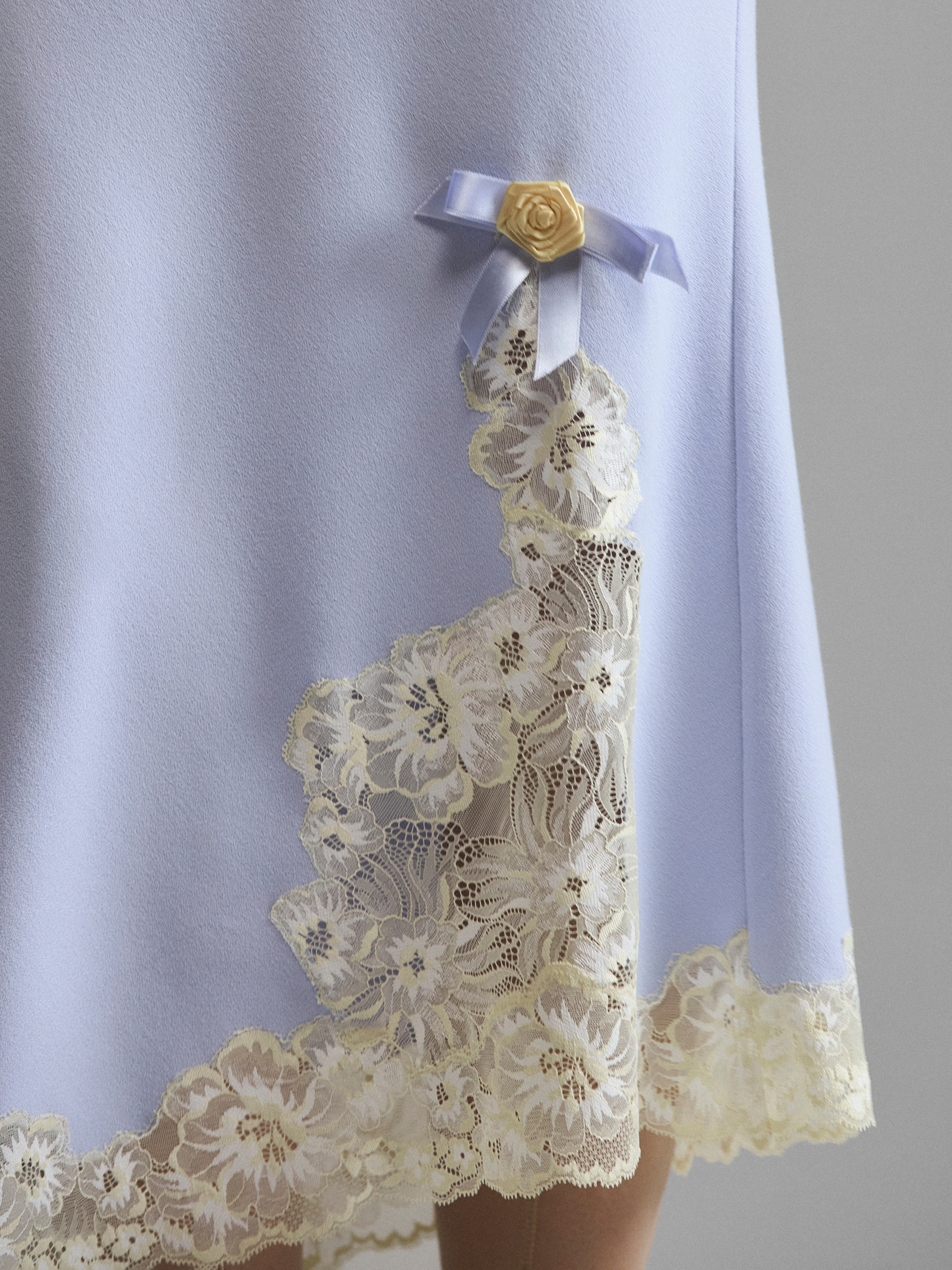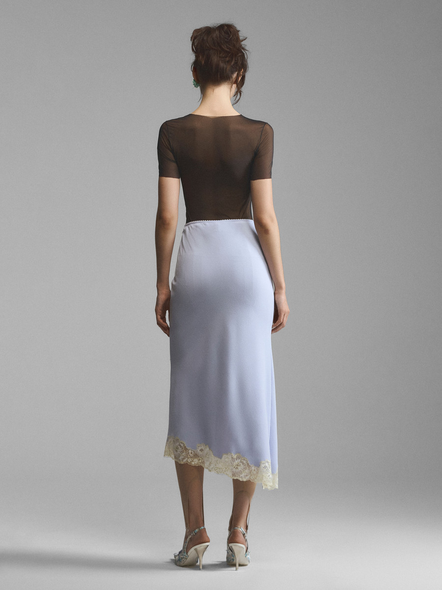 Юбка с асимметричным подолом и цветочным кружевом. Роль пояса играет тонкая бельевая резинка с фестонным краем, благодаря которой вещь мягко держится на бедрах. Облегающая сверху, модель спускается с одного бедра заостренным краем. Разрез и подол украшены двумя видами кружева и бельевой розой с сатиновыми лентами. Вшитое по краю, кружево создает иллюзию естественной патины, покрывающей край подола. Юбка доступна в зеленом и сиреневом оттенках.