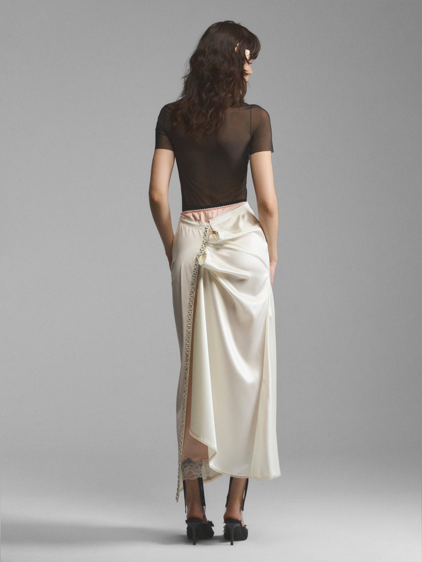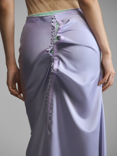 Двухслойная юбка со сквозной застежкой на воздушных петлях. Сочетание двух оттенков ткани создает иллюзию утреннего неглиже, надетого друг на друга. Асимметрично зафиксированная пола формирует крупные мягкие складки, рисунок которых можно менять, застегивая юбку по-другому. Нижний слой с кружевом и отлетной верхний спускаются до щиколоток, создавая красивые фалды при движении. Модель доступна в кремовом и сиреневом вариантах.