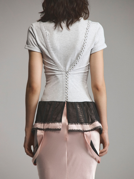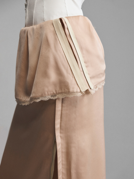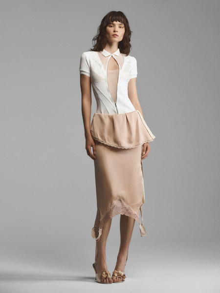 Юбка-мини, имитирующая спущенную на бедра сорочку. Красиво обработанная изнанка играет роль лифа, а необработанный край становится подолом юбки. Широкие бретели спускаются ниже края, акцентируя внимание на обнаженных ногах. Скрытая молния сбоку позволяет легко надевать юбку и регулировать высоту разреза. Смелый эксперимент с кроем и внутренней сутью вещи создает соблазнительный, утонченный образ.