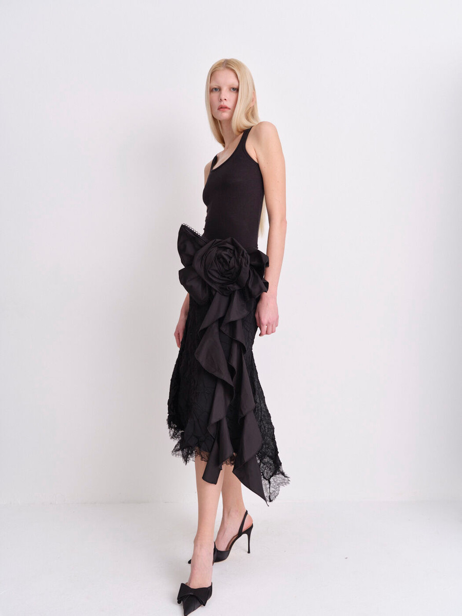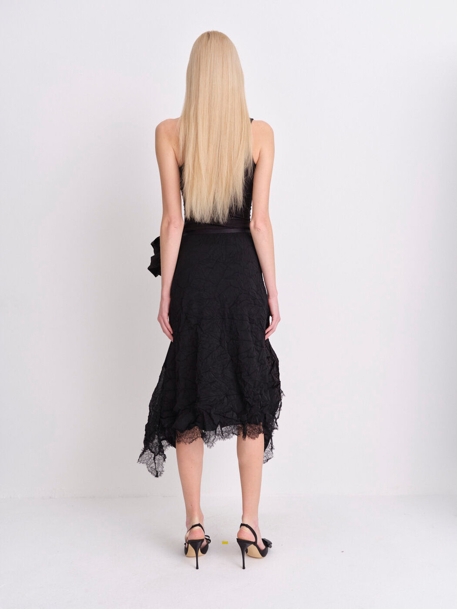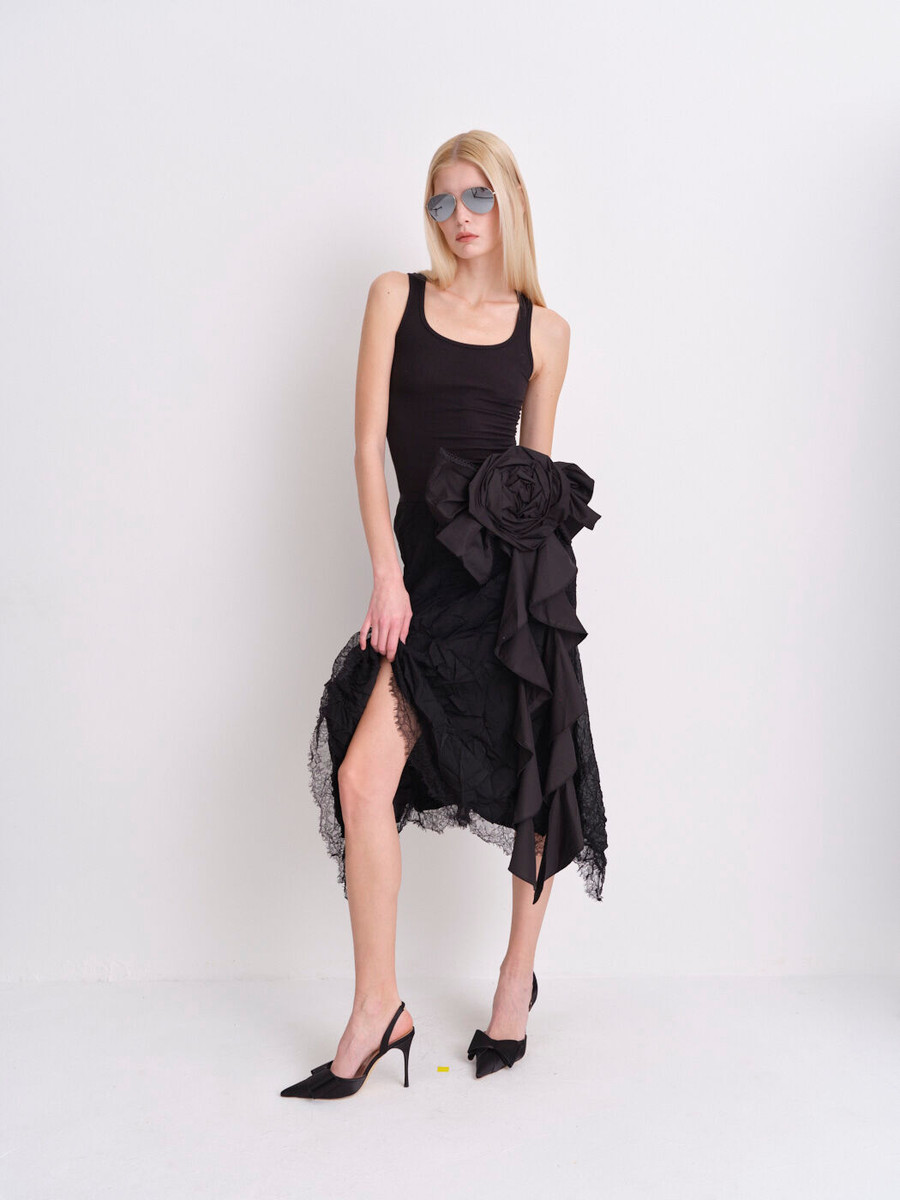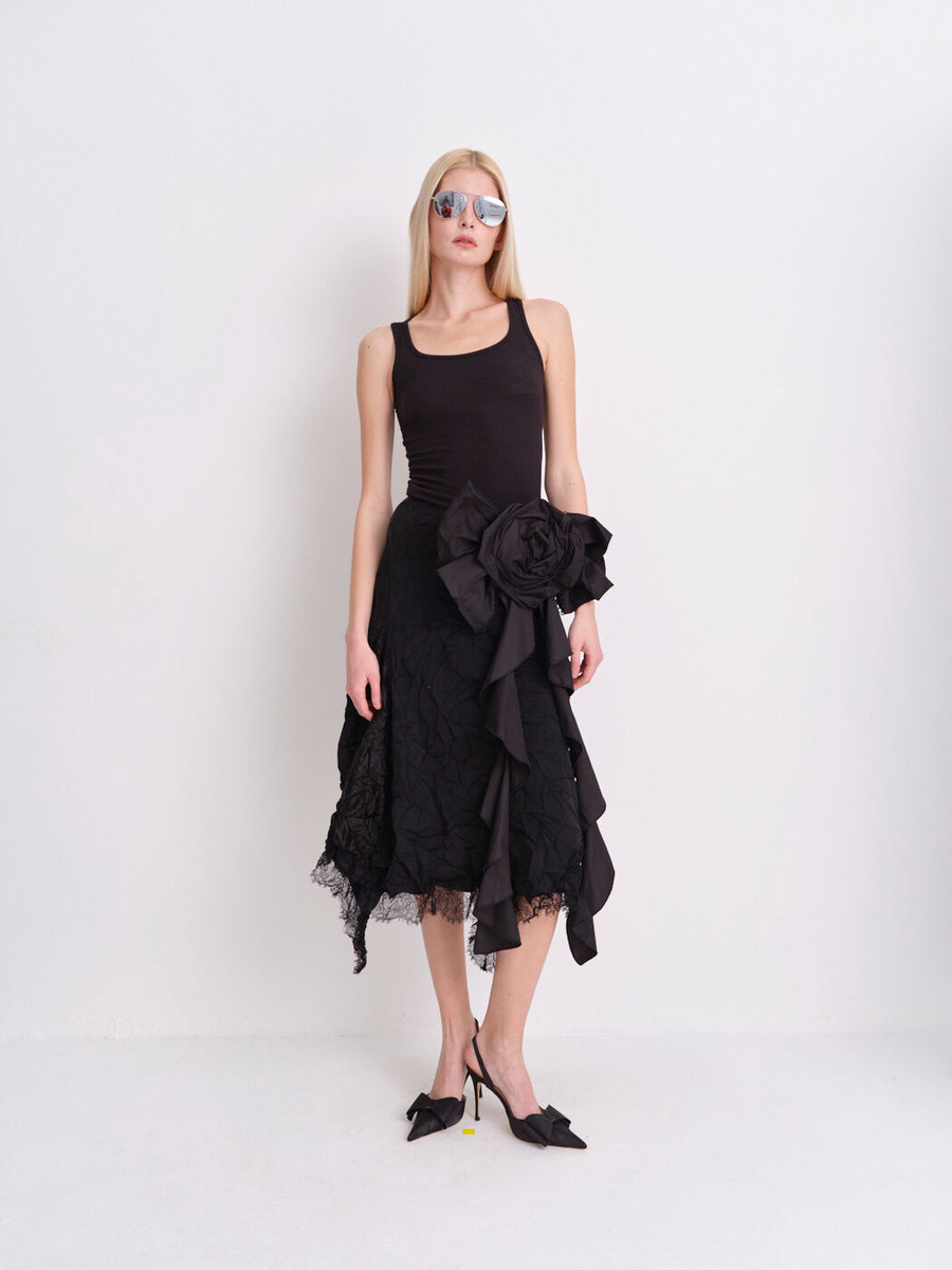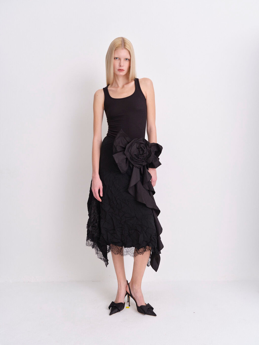 Ассиметричная юбка «крэш» с шелковыми элементами. Дизайнер использовал несколько фактур и тканей, а также разные виды кружева. Стилизуйте юбку с более базовыми элементами гардероба, будь то косуха, мужская сорочка, футболка, лонг или худи, майка, а также любой жакет. Рекомендуем сочетать юбку с грубыми ботинками или кедами.