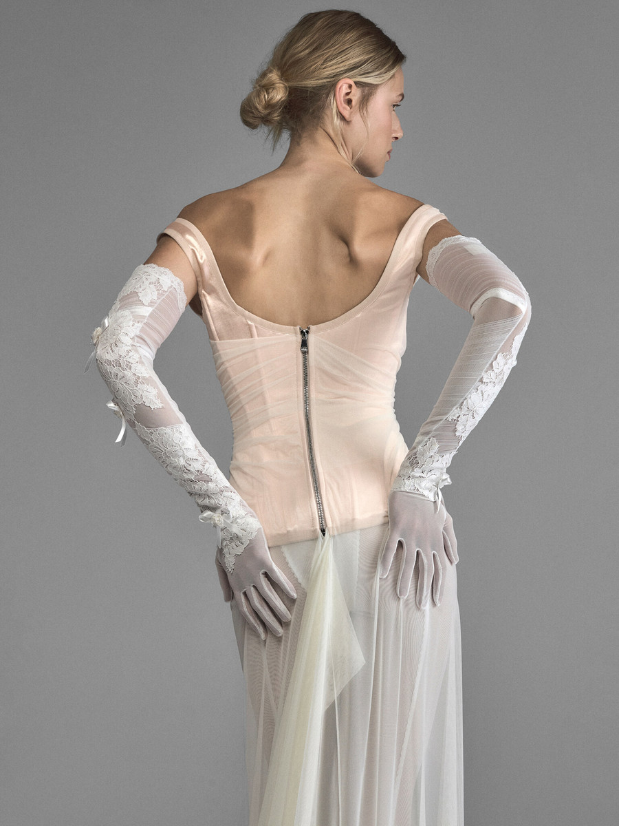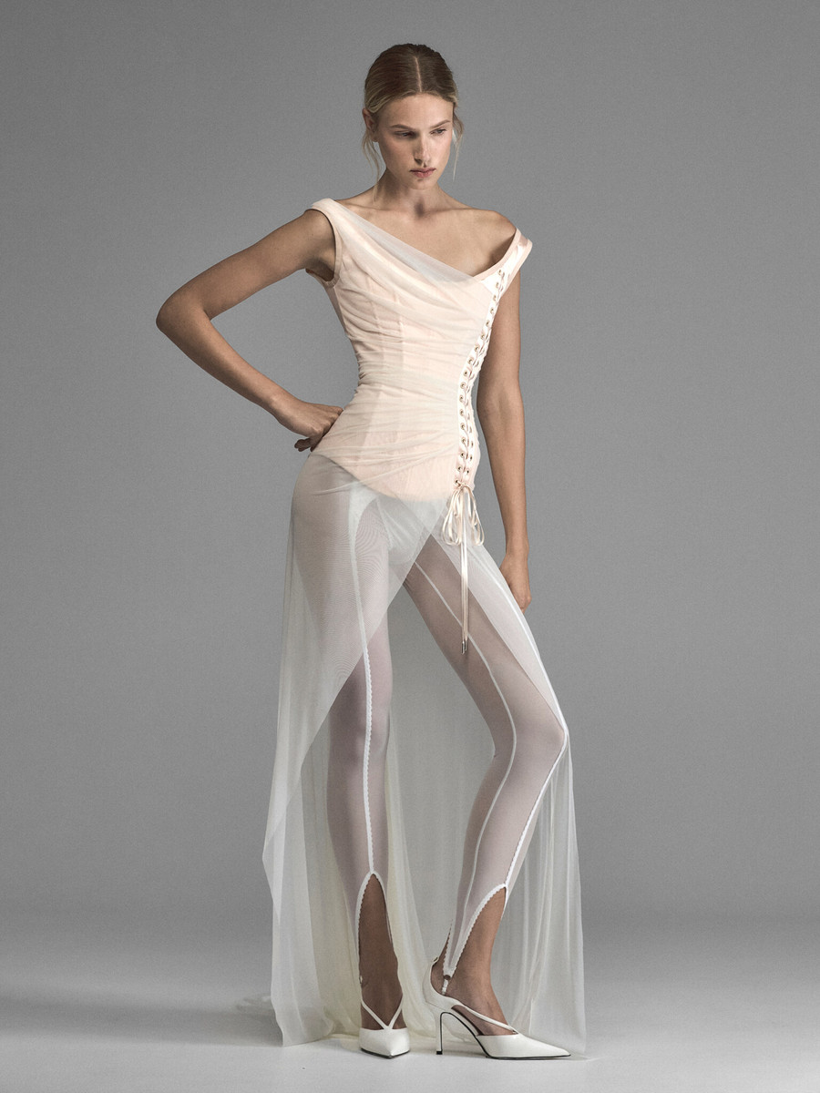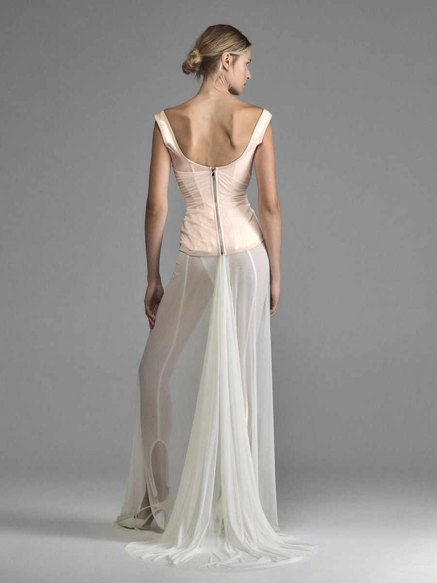 Каскадное прозрачное платье из вискозы с атласным корсетом на молнии и невесомым шлейфом. Асимметричный бельевой корсет задрапирован белой вуалью, которая обнажает все, что скрыто под ней. Ниспадая по ногам, водопад ткани заканчивается шлейфом. Вуаль струится по коже, размывая силуэт словно предрассветный туман. Подобно нишевому парфюму, прозрачный шлейф будет будоражить воображение окружающих еще долго после вашего ухода. Порочное в своей невинности, платье превратит церемонию в таинство для двоих. Позвольте вашему внутреннему свету сиять, не ослепляя.