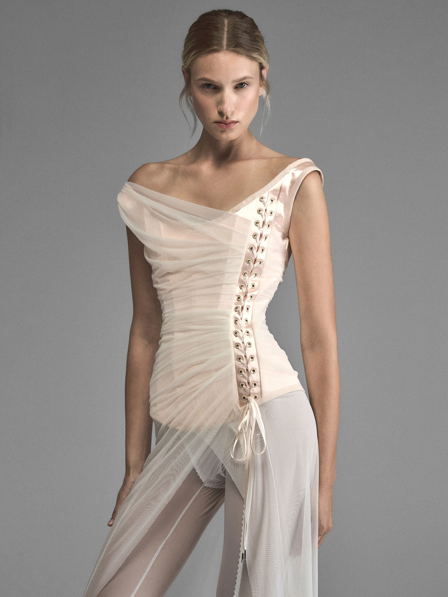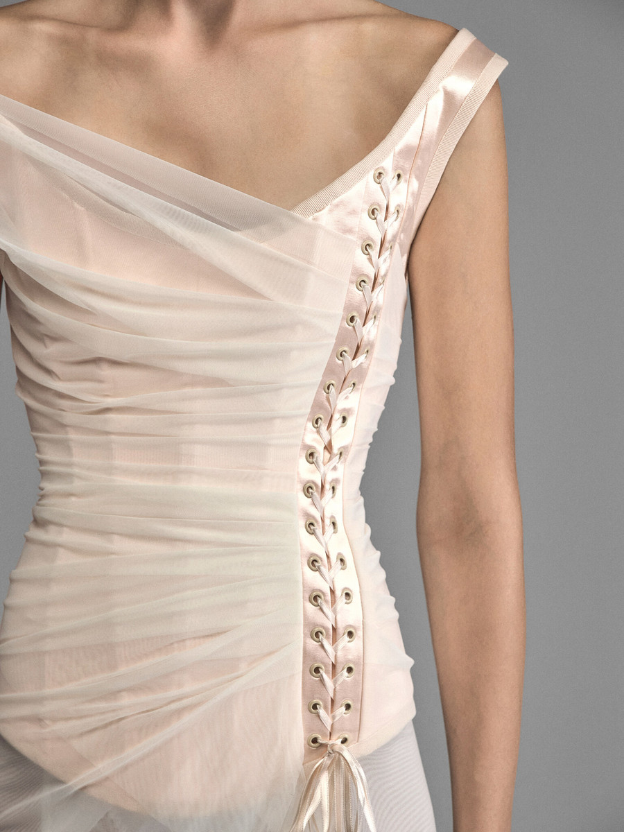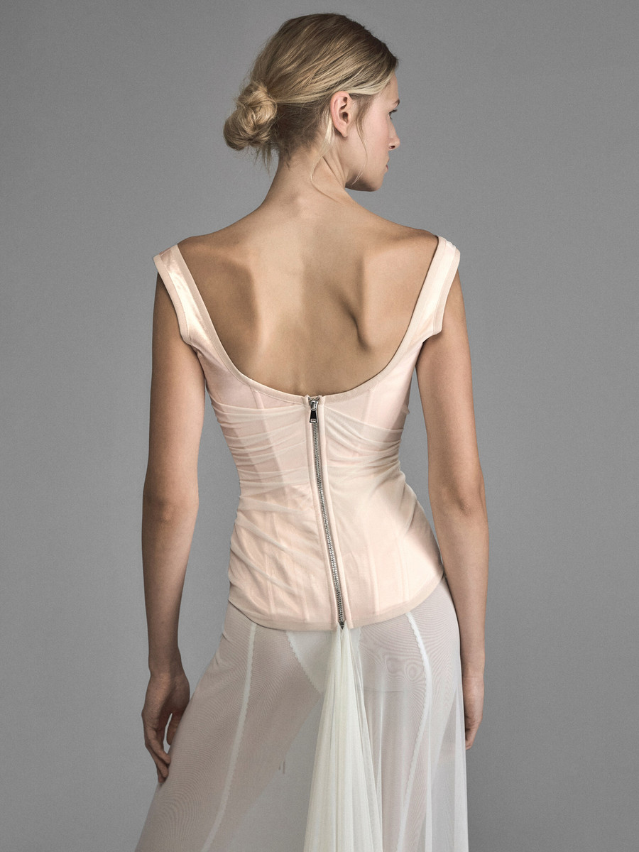 Каскадное прозрачное платье из вискозы с атласным корсетом на молнии и невесомым шлейфом. Асимметричный бельевой корсет задрапирован белой вуалью, которая обнажает все, что скрыто под ней. Ниспадая по ногам, водопад ткани заканчивается шлейфом. Вуаль струится по коже, размывая силуэт словно предрассветный туман. Подобно нишевому парфюму, прозрачный шлейф будет будоражить воображение окружающих еще долго после вашего ухода. Порочное в своей невинности, платье превратит церемонию в таинство для двоих. Позвольте вашему внутреннему свету сиять, не ослепляя.